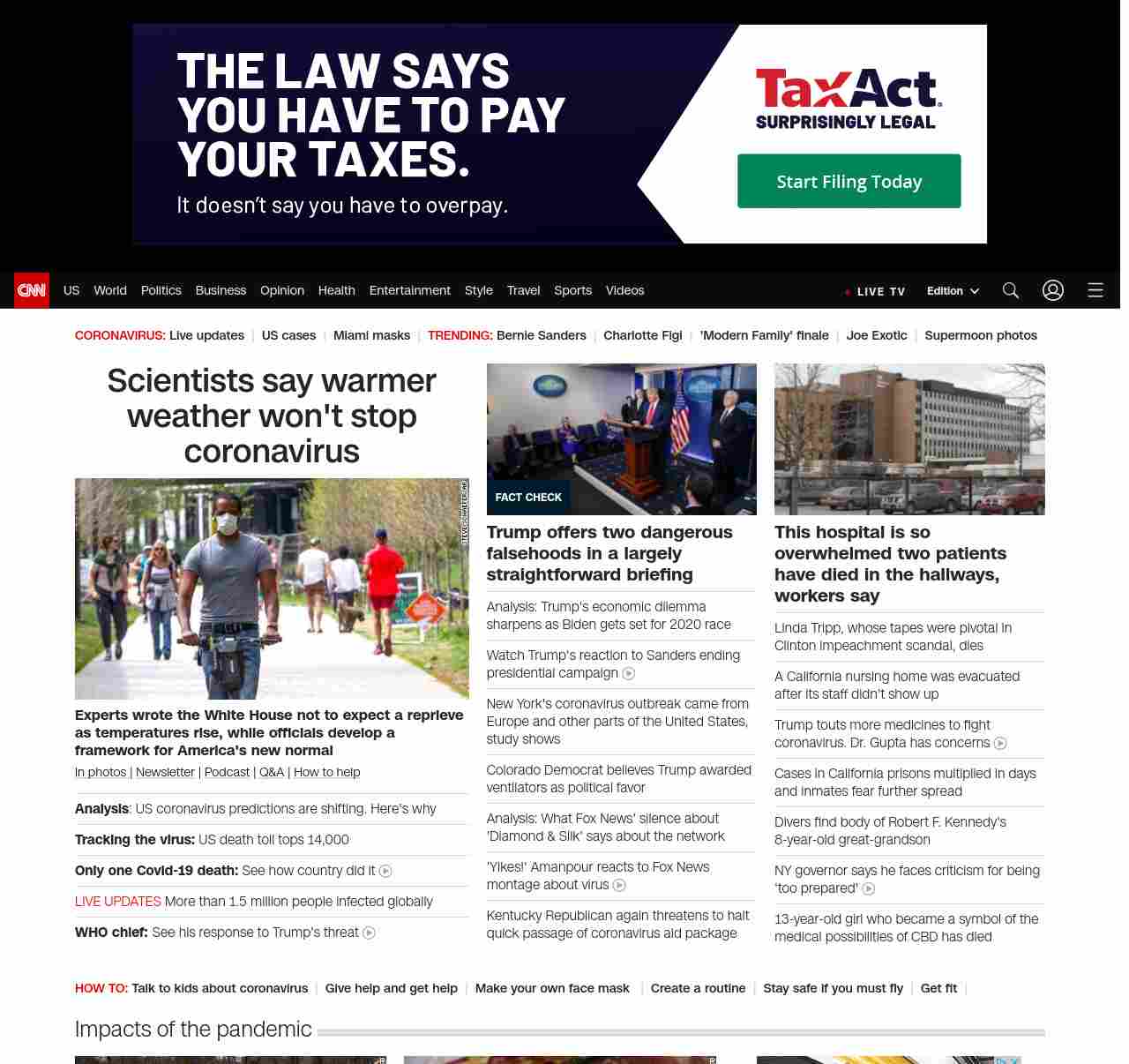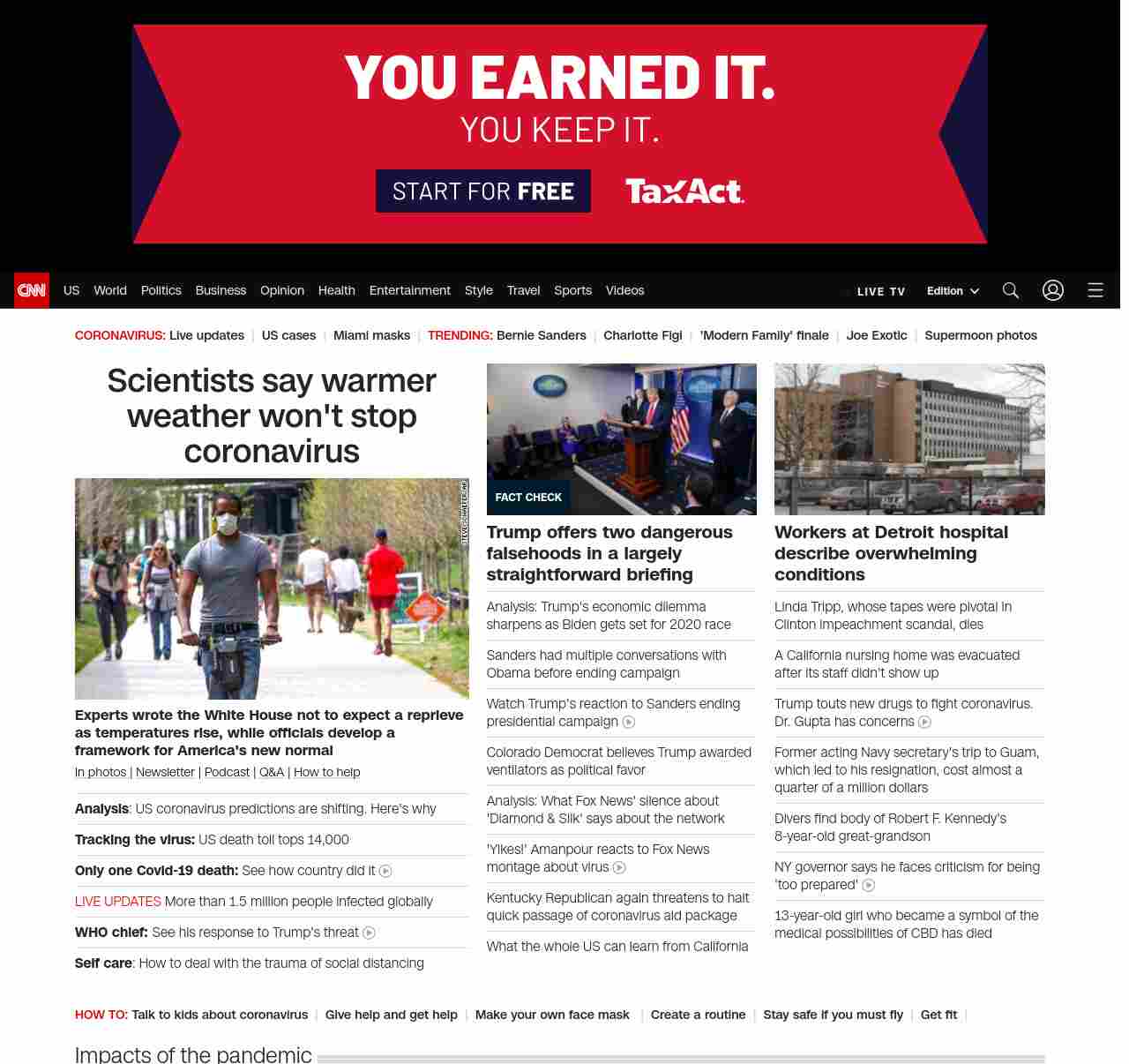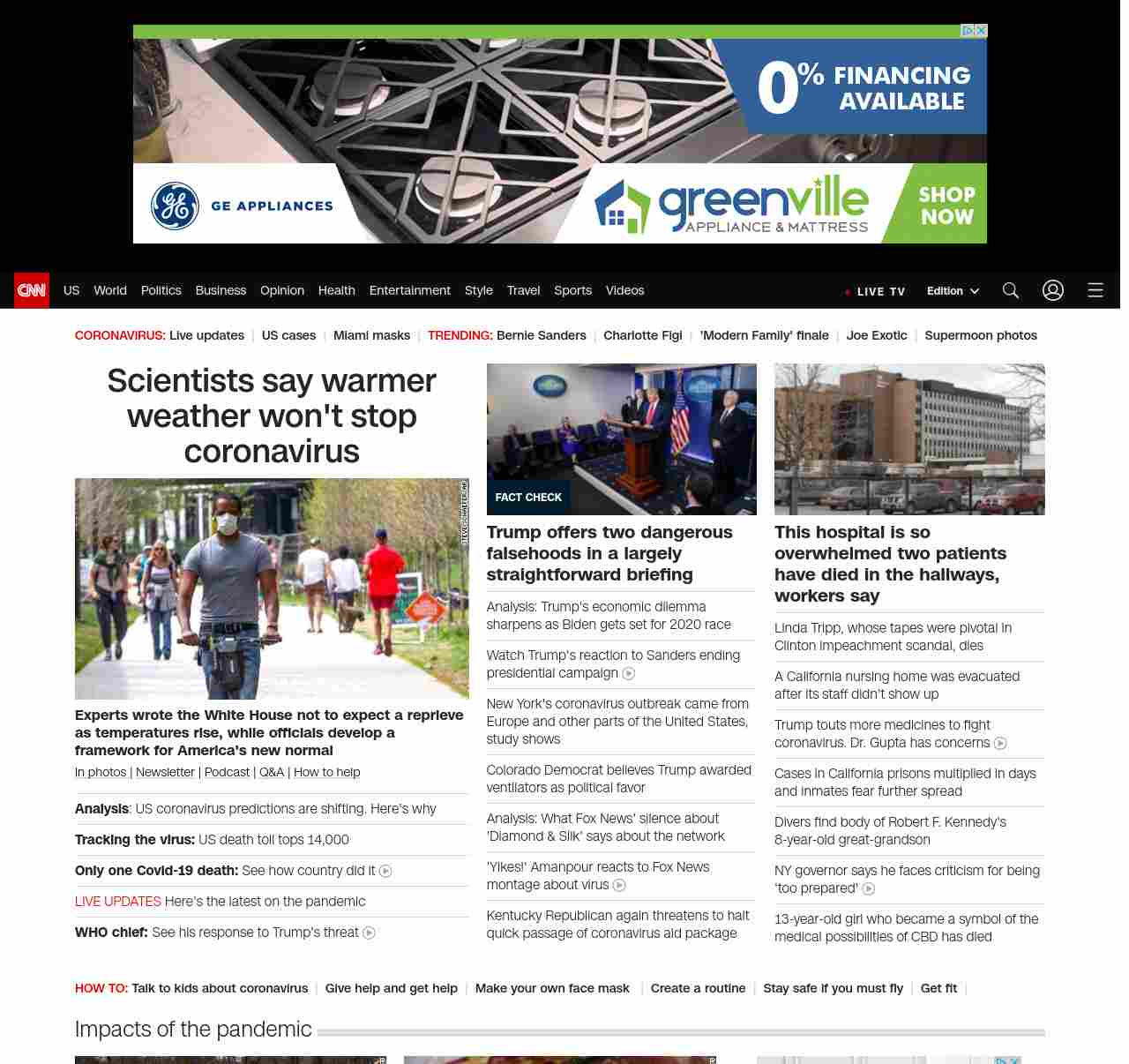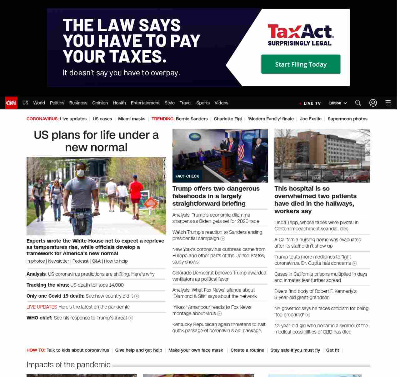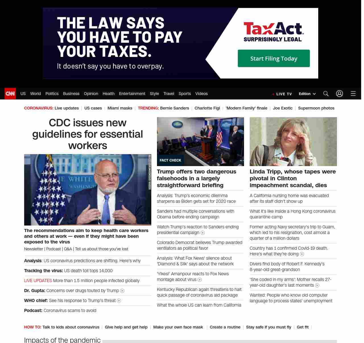 || screaming-banner-text banner-text-size–char-47″ data-analytics=”_list-hierarchical-xs_hyperlink_”> CDC issues new guidelines for essential workers ||” , title: “CNN – Breaking News, Latest News and Videos” , siblings: {“articleList”:[{“uri”:”/2020/04/08/politics/what-matters-april-8/index.html”,”headline”:”u003cstrong>Analysisu003c/strong>: US coronavirus predictions are shifting. Here’s why”,”thumbnail”:”//cdn.cnn.com/cnnnext/dam/assets/200408162250-04-hf-coronavirus-new-york-small-11.jpg”,”duration”:””,”description”:”Things are still getting worse. u003ca href=”https://www.cnn.com/2020/04/08/health/us-coronavirus-wednesday/index.html” target=”_blank”>The US death toll crossed 14,000 on Wednesday, with a record 1,858 deaths reported just on Tuesdayu003c/a>. Since the outbreak started, about u003ca href=”https://www.cnn.com/interactive/2020/health/coronavirus-us-maps-and-cases/” target=”_blank”>425,000 cases have been diagnosed in the USu003c/a>. And researchers say the peak has yet to come. “,”layout”:””