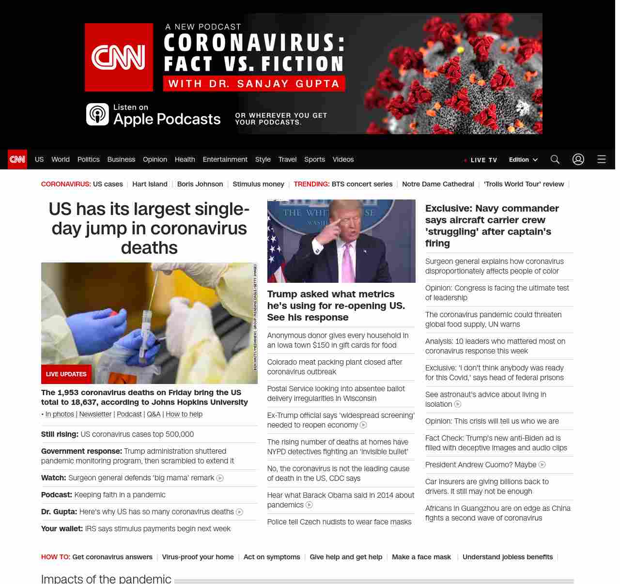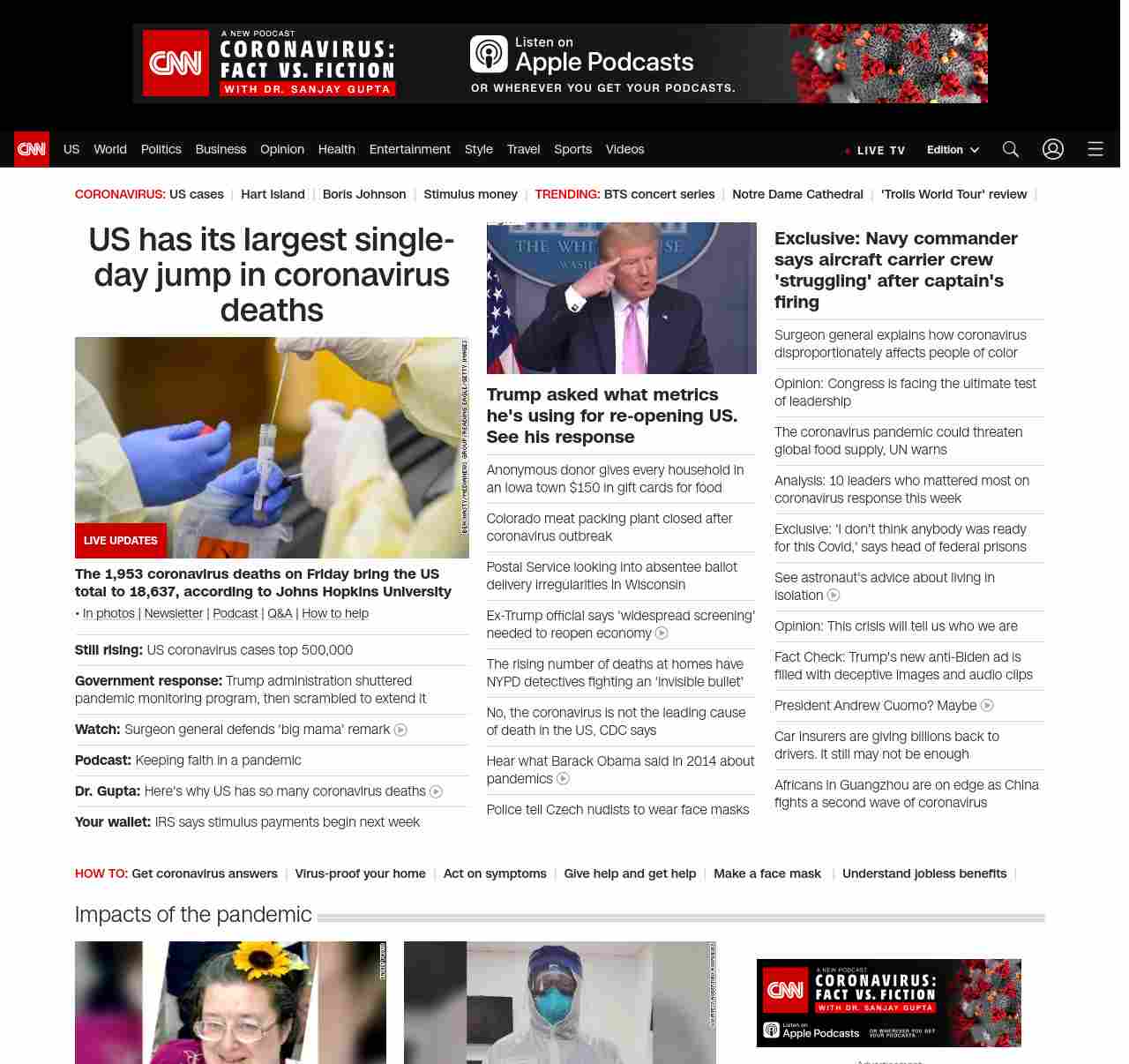 || screaming-banner-text banner-text-size–char-47″ data-analytics=”_list-hierarchical-xs_article_”> US has its largest single-day jump in coronavirus deaths ||” , title: “CNN – Breaking News, Latest News and Videos” , siblings: {“articleList”:[{“uri”:”/world/live-news/coronavirus-pandemic-04-11-20/index.html”,”headline”:”u003cstrong>The 1,953 coronavirus deaths on Friday bring the US total to 18,637, according to Johns Hopkins Universityu003c/strong>”,”thumbnail”:”//cdn.cnn.com/cnnnext/dam/assets/200410142735-01-coronavirus-testing-0327-restricted-small-11.jpg”,”duration”:””,”description”:”⢠u003ca href=”https://www.cnn.com/2020/03/19/world/gallery/novel-coronavirus-outbreak/index.html” target=”_blank”>In photos u003c/a>| u003ca href=”https://www.cnn.com/specials/coronavirus-newsletter?utm_source=hp&source=hp” target=”_blank”>Newsletteru003c/a> | u003ca href=”https://www.cnn.com/audio/podcasts/corona-virus”>Podcastu003c/a> | u003ca href=”https://www.cnn.com/interactive/2020/health/coronavirus-questions-answers/” target=”_blank”>Q&Au003c/a> | u003ca href=”https://www.cnn.com/interactive/2020/health/coronavirus-how-to-help/” target=”_blank”>How to helpu003c/a>”,”layout”:””