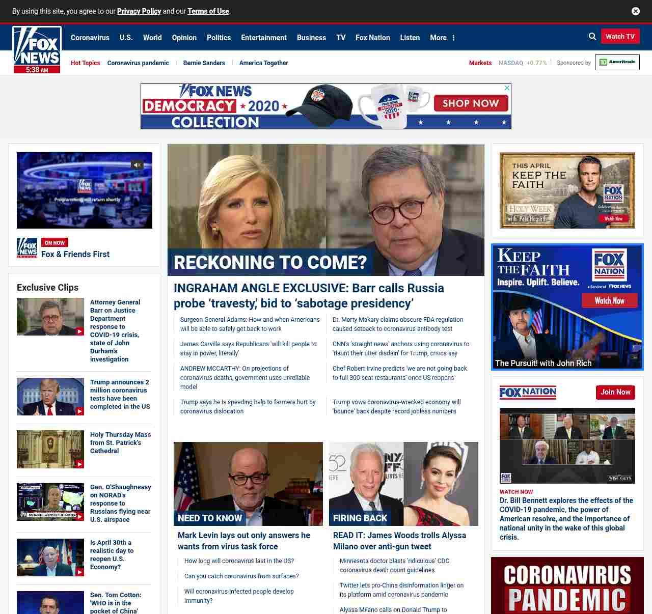 FN: [[RECKONING TO COME?]] INGRAHAM ANGLE EXCLUSIVE: Barr calls Russia probe ‘travesty,' bid to ‘sabotage presidency’ ((lubuntu at wor2))