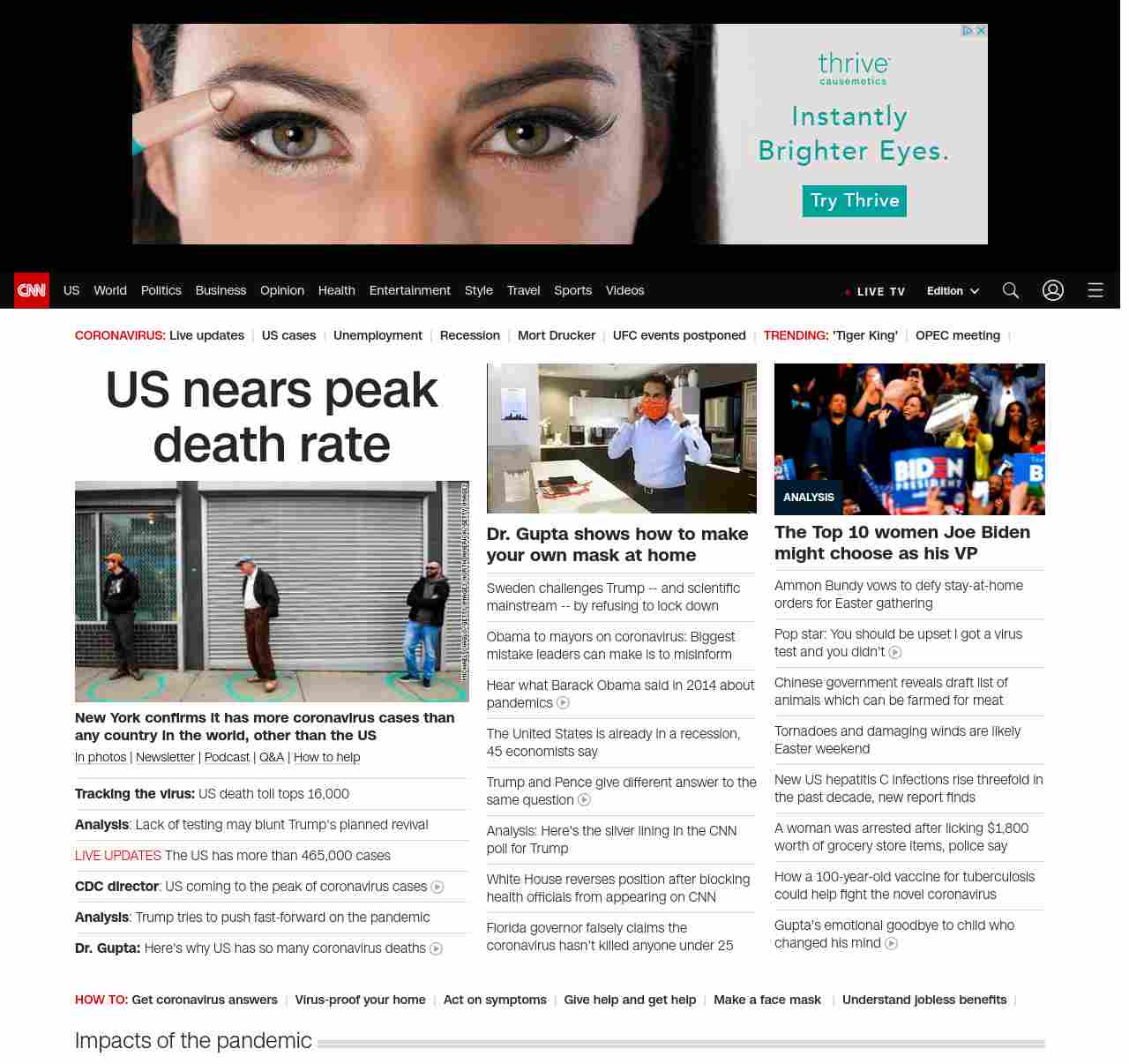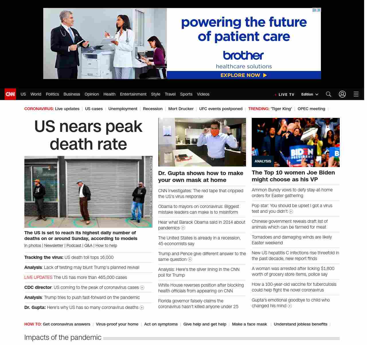 || screaming-banner-text banner-text-size–char-26″ data-analytics=”_list-hierarchical-xs_article_”> US nears peak death rate ||” , title: “CNN – Breaking News, Latest News and Videos” , siblings: {“articleList”:[{“uri”:”/2020/04/10/health/us-coronavirus-friday/index.html”,”headline”:”u003cstrong>The US is set to reach its highest daily number of deaths on or around Sunday, according to modelsu003c/strong>”,”thumbnail”:”//cdn.cnn.com/cnnnext/dam/assets/200410000439-social-distancing-small-11.jpg”,”duration”:””,”description”:”u003ca href=”https://www.cnn.com/2020/03/19/world/gallery/novel-coronavirus-outbreak/index.html” target=”_blank”>In photos u003c/a>| u003ca href=”https://www.cnn.com/specials/coronavirus-newsletter?utm_source=hp&source=hp” target=”_blank”>Newsletteru003c/a> | u003ca href=”https://www.cnn.com/audio/podcasts/corona-virus”>Podcastu003c/a> | u003ca href=”https://www.cnn.com/interactive/2020/health/coronavirus-questions-answers/” target=”_blank”>Q&Au003c/a> | u003ca href=”https://www.cnn.com/interactive/2020/health/coronavirus-how-to-help/” target=”_blank”>How to helpu003c/a>”,”layout”:””
