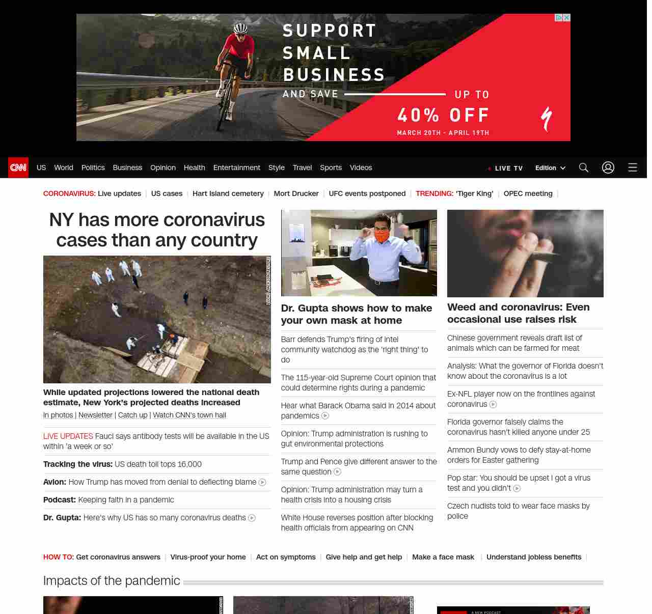 || screaming-banner-text banner-text-size–char-47″ data-analytics=”_list-hierarchical-xs_article_”> NY has more coronavirus cases than any country ||” , title: “CNN – Breaking News, Latest News and Videos” , siblings: {“articleList”:[{“uri”:”/2020/04/10/health/us-coronavirus-friday/index.html”,”headline”:”u003cstrong>While updated projections lowered the national death estimate, New York’s projected deaths increasedu003c/strong>”,”thumbnail”:”//cdn.cnn.com/cnnnext/dam/assets/200409184745-44-week-in-photos-0409-small-11.jpg”,”duration”:””,”description”:”u003ca href=”https://www.cnn.com/2020/03/19/world/gallery/novel-coronavirus-outbreak/index.html” target=”_blank”>In photos u003c/a>| u003ca href=”https://www.cnn.com/specials/coronavirus-newsletter?utm_source=hp&source=hp” target=”_blank”>Newsletteru003c/a> | u003ca href=”https://www.cnn.com/2020/04/10/world/coronavirus-newsletter-04-10-20-intl/index.html” target=”_blank”>Catch upu003c/a> | u003ca href=”https://www.cnn.com/videos/health/2020/04/09/entire-april-9-coronavirus-town-hall-part-1-sot-vpx.cnn” target=”_blank”>Watch CNN’s town hallu003c/a>”,”layout”:””