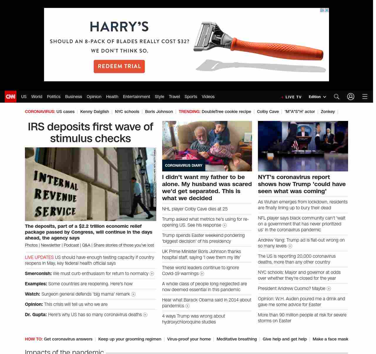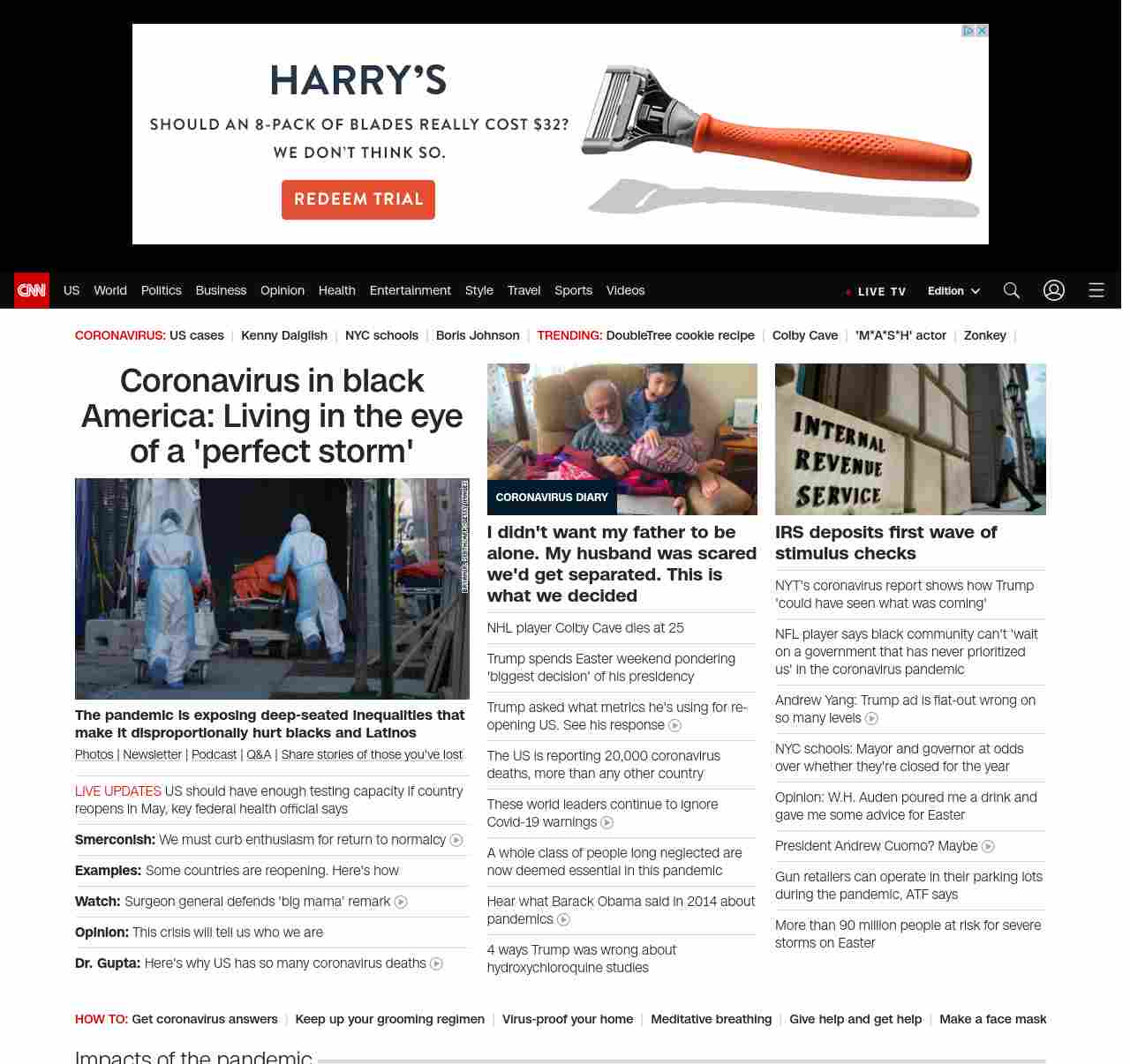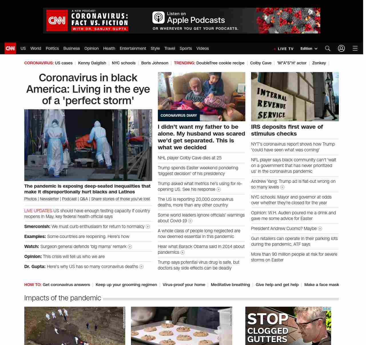 || screaming-banner-text banner-text-size–char-47″ data-analytics=”_list-hierarchical-xs_article_”> Coronavirus in black America: Living in the eye of a ‘perfect storm’ ||” , title: “CNN – Breaking News, Latest News and Videos” , siblings: {“articleList”:[{“uri”:”/2020/04/11/politics/irs-coronavirus-stimulus-check-deposit/index.html”,”headline”:”u003cstrong>The deposits, part of a $2.2 trillion economic relief package passed by Congress, will continue in the days ahead, the agency saysu003c/strong>”,”thumbnail”:”//cdn.cnn.com/cnnnext/dam/assets/180120150434-irs-building-small-11.jpg”,”duration”:””,”description”:”u003ca href=”https://www.cnn.com/2020/03/19/world/gallery/novel-coronavirus-outbreak/index.html” target=”_blank”>Photos u003c/a>| u003ca href=”https://www.cnn.com/specials/coronavirus-newsletter?utm_source=hp&source=hp” target=”_blank”>Newsletteru003c/a> | u003ca href=”https://www.cnn.com/audio/podcasts/corona-virus”>Podcastu003c/a> | u003ca href=”https://www.cnn.com/interactive/2020/health/coronavirus-questions-answers/” target=”_blank”>Q&Au003c/a> | u003ca href=”https://www.cnn.com/2020/04/08/health/share-coronavirus-covid19-victims-memories/index.html” target=”_blank”>Share stories of those you’ve lostu003c/a>”,”layout”:””