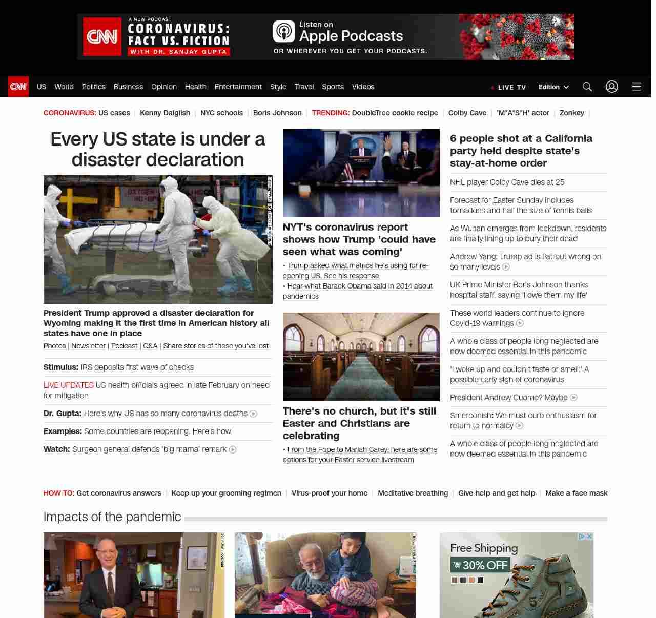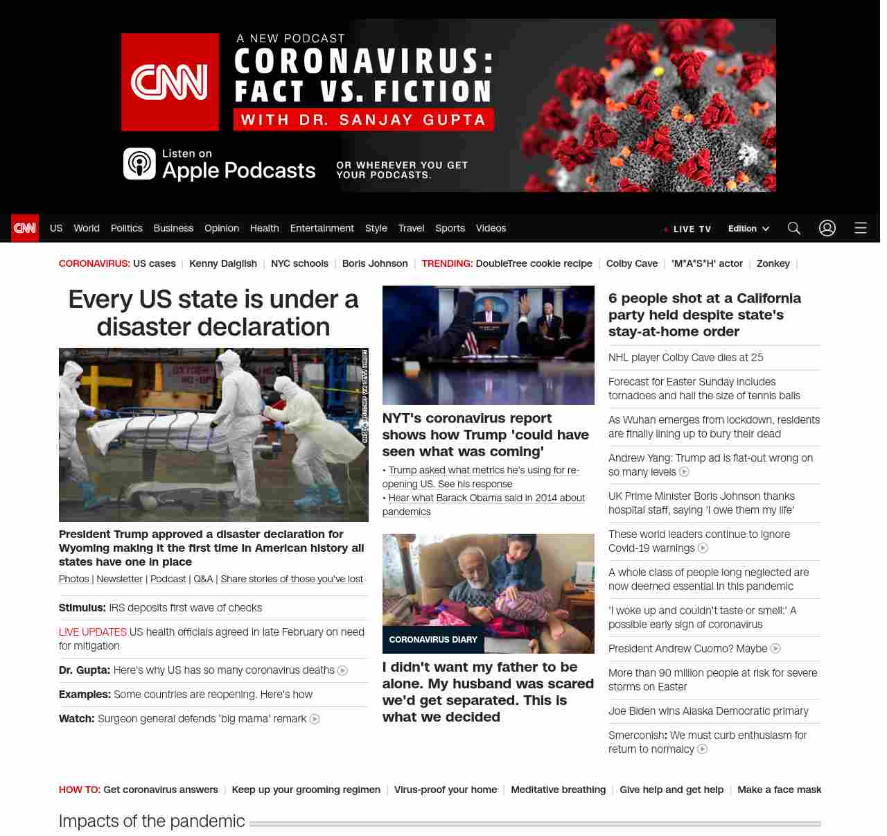|| screaming-banner-text banner-text-size–char-44″ data-analytics=”_list-hierarchical-xs_article_”> IRS deposits first wave of stimulus checks ||” , title: “CNN – Breaking News, Latest News and Videos” , siblings: {“articleList”:[{“uri”:”/2020/04/12/health/us-coronavirus-updates-sunday/index.html”,”headline”:”u003cstrong>President Trump approved a disaster declaration for Wyoming making it the first time in American history all states have one in placeu003c/strong>”,”thumbnail”:”//cdn.cnn.com/cnnnext/dam/assets/200411122206-01-covid-brooklyn-hospital-0409-small-11.jpg”,”duration”:””,”description”:”u003ca href=”https://www.cnn.com/2020/03/19/world/gallery/novel-coronavirus-outbreak/index.html” target=”_blank”>Photos u003c/a>| u003ca href=”https://www.cnn.com/specials/coronavirus-newsletter?utm_source=hp&source=hp” target=”_blank”>Newsletteru003c/a> | u003ca href=”https://www.cnn.com/audio/podcasts/corona-virus”>Podcastu003c/a> | u003ca href=”https://www.cnn.com/interactive/2020/health/coronavirus-questions-answers/” target=”_blank”>Q&Au003c/a> | u003ca href=”https://www.cnn.com/2020/04/08/health/share-coronavirus-covid19-victims-memories/index.html” target=”_blank”>Share stories of those you’ve lostu003c/a>”,”layout”:””