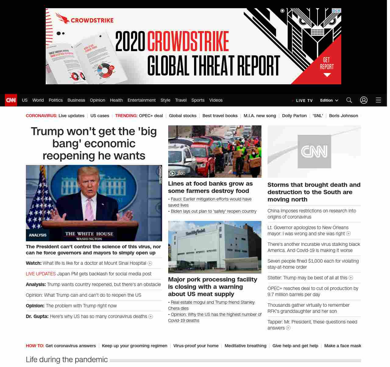 || screaming-banner-text banner-text-size–char-47″ data-analytics=”_list-hierarchical-xs_article_”> Trump won’t get the ‘big bang’ economic reopening he wants ||” , title: “CNN – Breaking News, Latest News and Videos” , siblings: {“articleList”:[{“uri”:”/2020/04/13/politics/donald-trump-coronavirus-economy-testing/index.html”,”headline”:”u003cstrong>The President can’t control the science of this virus, nor can he force governors and mayors to simply open upu003c/strong>”,”thumbnail”:”//cdn.cnn.com/cnnnext/dam/assets/200412003233-01-donald-trump-0410-small-11.jpg”,”duration”:””,”description”:”u003ca href=”https://www.cnn.com/2020/03/19/world/gallery/novel-coronavirus-outbreak/index.html” target=”_blank”>Photos u003c/a>| u003ca href=”https://www.cnn.com/specials/coronavirus-newsletter?utm_source=hp&source=hp” target=”_blank”>Newsletteru003c/a> | u003ca href=”https://www.cnn.com/audio/podcasts/corona-virus”>Podcastu003c/a> | u003ca href=”https://www.cnn.com/interactive/2020/health/coronavirus-questions-answers/” target=”_blank”>Q&Au003c/a> | u003ca href=”https://www.cnn.com/2020/04/08/health/share-coronavirus-covid19-victims-memories/index.html” target=”_blank”>Share stories of those you’ve lostu003c/a>”,”layout”:””