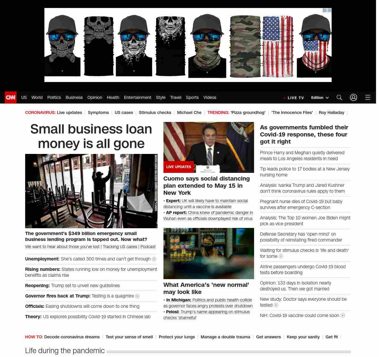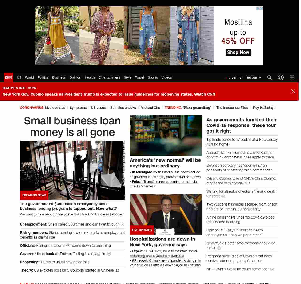 || screaming-banner-text banner-text-size–char-38″ data-analytics=”_list-hierarchical-xs_article_”> Small business loan money is all gone ||” , title: “CNN – Breaking News, Latest News and Videos” , siblings: {“articleList”:[{“uri”:”/2020/04/16/politics/small-business-loan-fight-congress-negotiations/index.html”,”headline”:”u003cstrong>As of Thursday morning, the government’s $349 billion emergency small business lending program is tapped out. Now what?u003c/strong>”,”thumbnail”:”//cdn.cnn.com/cnnnext/dam/assets/200416111134-01-restaurant-boston-0325-small-11.jpg”,”duration”:””,”description”:”u003ca href=”https://www.cnn.com/2020/04/08/health/share-coronavirus-covid19-victims-memories/index.html” target=”_blank”>We want to hear about those you’ve lostu003c/a> | u003ca href=”https://www.cnn.com/interactive/2020/health/coronavirus-us-maps-and-cases/” target=”_blank”>Tracking US casesu003c/a> | u003ca href=”https://www.cnn.com/audio/podcasts/corona-virus” target=”_blank”>Podcastu003c/a>”,”layout”:””