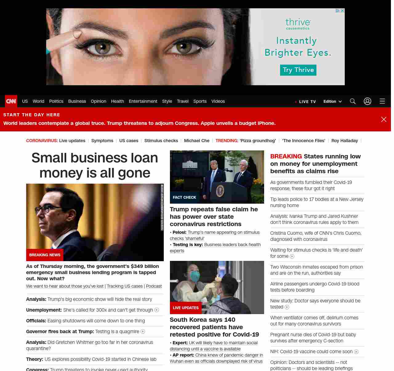 || screaming-banner-text banner-text-size–char-38″ data-analytics=”_list-hierarchical-xs_article_”> Small business loan money is all gone ||” , title: “CNN – Breaking News, Latest News and Videos” , siblings: {“articleList”:[{“uri”:”/2020/04/16/politics/small-business-loan-fight-congress-negotiations/index.html”,”headline”:”u003cstrong>As of Thursday morning, the government’s $349 billion emergency small business lending program is tapped out. Now what?u003c/strong>”,”thumbnail”:”//cdn.cnn.com/cnnnext/dam/assets/200303105041-steve-mnuchin-0212-small-11.jpg”,”duration”:””,”description”:”u003ca href=”https://www.cnn.com/2020/04/08/health/share-coronavirus-covid19-victims-memories/index.html” target=”_blank”>We want to hear about those you’ve lostu003c/a> | u003ca href=”https://www.cnn.com/interactive/2020/health/coronavirus-us-maps-and-cases/” target=”_blank”>Tracking US casesu003c/a> | u003ca href=”https://www.cnn.com/audio/podcasts/corona-virus” target=”_blank”>Podcastu003c/a>”,”layout”:””