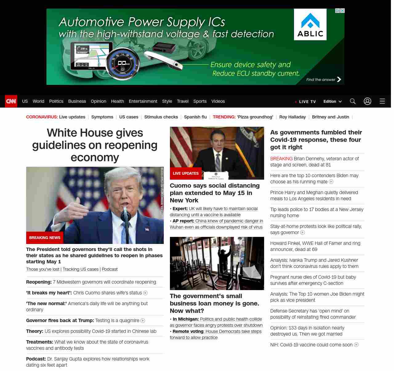 || screaming-banner-text banner-text-size–char-47″ data-analytics=”_list-hierarchical-xs_article_”> White House gives guidelines on reopening economy ||” , title: “CNN – Breaking News, Latest News and Videos” , siblings: {“articleList”:[{“uri”:”/2020/04/16/politics/donald-trump-reopening-guidelines-coronavirus/index.html”,”headline”:”u003cstrong>The President told governors they’ll call the shots in their states as he shared guidelines to reopen in phasesu003c/strong>”,”thumbnail”:”//cdn.cnn.com/cnnnext/dam/assets/200416013606-donald-trump-april-15-2020-01-small-11.jpg”,”duration”:””,”description”:”u003ca href=”https://www.cnn.com/2020/04/08/health/share-coronavirus-covid19-victims-memories/index.html” target=”_blank”> Those you’ve lostu003c/a> | u003ca href=”https://www.cnn.com/interactive/2020/health/coronavirus-us-maps-and-cases/” target=”_blank”>Tracking US casesu003c/a> | u003ca href=”https://www.cnn.com/audio/podcasts/corona-virus” target=”_blank”>Podcastu003c/a> “,”layout”:””