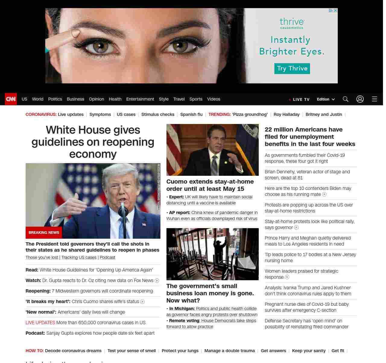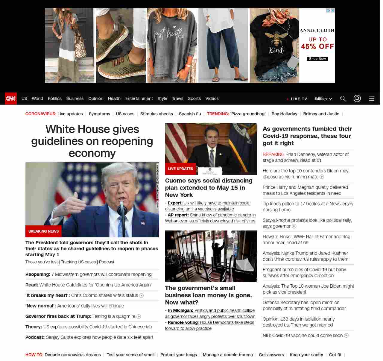 || screaming-banner-text banner-text-size–char-47″ data-analytics=”_list-hierarchical-xs_article_”> White House gives guidelines on reopening economy ||” , title: “CNN – Breaking News, Latest News and Videos” , siblings: {“articleList”:[{“uri”:”/2020/04/16/politics/donald-trump-reopening-guidelines-coronavirus/index.html”,”headline”:”u003cstrong>The President told governors they’ll call the shots in their states as he shared guidelines to reopen in phases starting May 1u003c/strong>”,”thumbnail”:”//cdn.cnn.com/cnnnext/dam/assets/200416013606-donald-trump-april-15-2020-01-small-11.jpg”,”duration”:””,”description”:”u003ca href=”https://www.cnn.com/2020/04/08/health/share-coronavirus-covid19-victims-memories/index.html” target=”_blank”> Those you’ve lostu003c/a> | u003ca href=”https://www.cnn.com/interactive/2020/health/coronavirus-us-maps-and-cases/” target=”_blank”>Tracking US casesu003c/a> | u003ca href=”https://www.cnn.com/audio/podcasts/corona-virus” target=”_blank”>Podcastu003c/a>”,”layout”:””