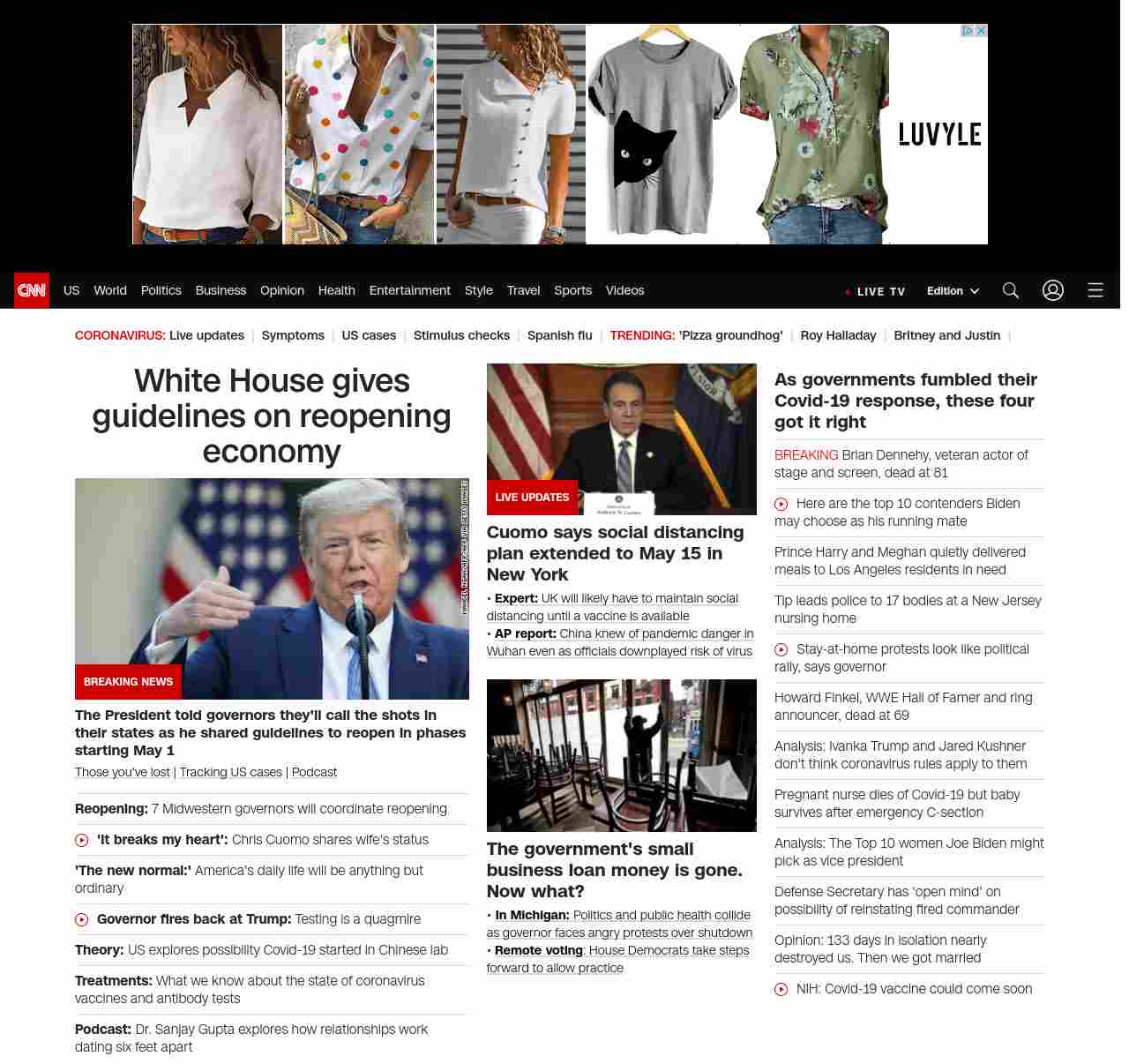 || screaming-banner-text banner-text-size–char-47″ data-analytics=”_list-hierarchical-xs_article_”> 7 Midwestern governors will coordinate reopening ||” , title: “CNN – Breaking News, Latest News and Videos” , siblings: {“articleList”:[{“uri”:”/2020/04/16/politics/midwest-governors-reopening-pact/index.html”,”headline”:”u003cstrong>`We will make decisions based on facts and science,’ a statement Democratic Michigan Gov. Whitmer saysu003c/strong>”,”thumbnail”:”//cdn.cnn.com/cnnnext/dam/assets/200409081401-lone-car-detroit-0408-small-11.jpg”,”duration”:””,”description”:”u003ca href=”https://www.cnn.com/2020/04/08/health/share-coronavirus-covid19-victims-memories/index.html” target=”_blank”> Those you’ve lostu003c/a> | u003ca href=”https://www.cnn.com/interactive/2020/health/coronavirus-us-maps-and-cases/” target=”_blank”>Tracking US casesu003c/a> | u003ca href=”https://www.cnn.com/audio/podcasts/corona-virus” target=”_blank”>Podcastu003c/a>”,”layout”:””