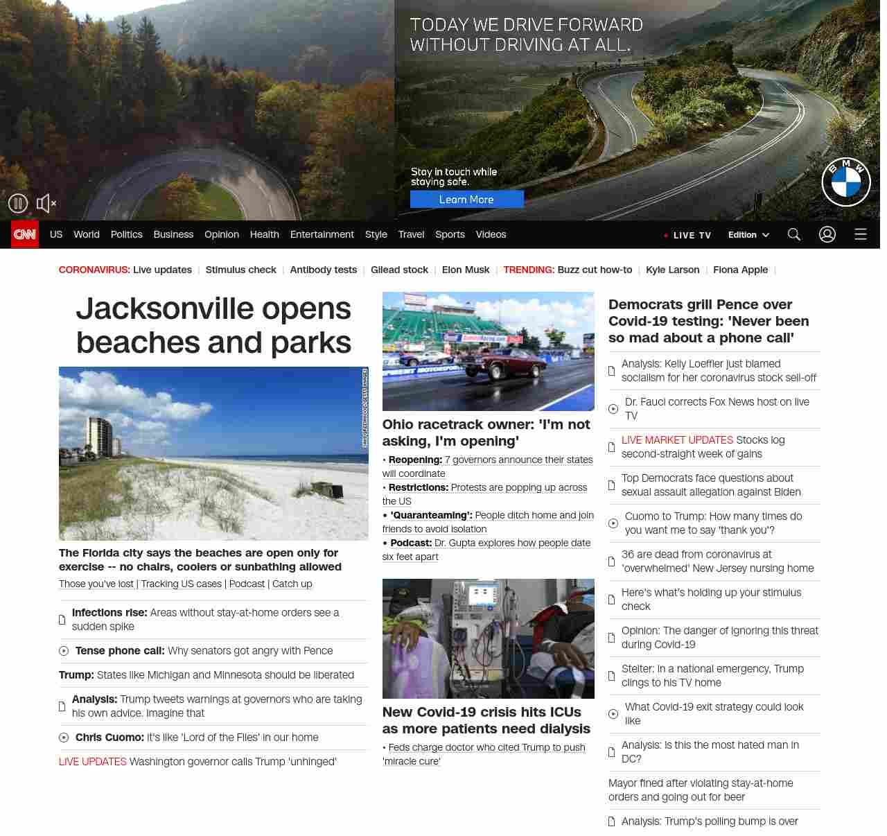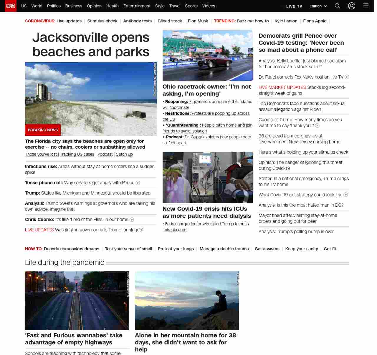 || screaming-banner-text banner-text-size–char-38″ data-analytics=”_list-hierarchical-xs_article_”> Jacksonville opens beaches and parks ||” , title: “CNN – Breaking News, Latest News and Videos” , siblings: {“articleList”:[{“uri”:”/2020/04/17/us/jacksonville-florida-beach-reopen/index.html”,”headline”:”u003cstrong>The mayor’s action comes while Florida is under a stay-at-home order until April 30u003c/strong>”,”thumbnail”:”//cdn.cnn.com/cnnnext/dam/assets/200417162608-jacksonville-florida-beach-0321-small-11.jpg”,”duration”:””,”description”:”u003ca href=”https://www.cnn.com/2020/04/08/health/share-coronavirus-covid19-victims-memories/index.html” target=”_blank”>Those you’ve lost u003c/a>| u003ca href=”https://www.cnn.com/interactive/2020/health/coronavirus-us-maps-and-cases/” target=”_blank”>Tracking US casesu003c/a> | u003ca href=”https://www.cnn.com/audio/podcasts/corona-virus” target=”_blank”>Podcastu003c/a> | u003ca href=”https://www.cnn.com/2020/04/17/world/coronavirus-newsletter-04-17-20-intl/index.html” target=”_blank”>Catch up u003c/a>”,”layout”:””