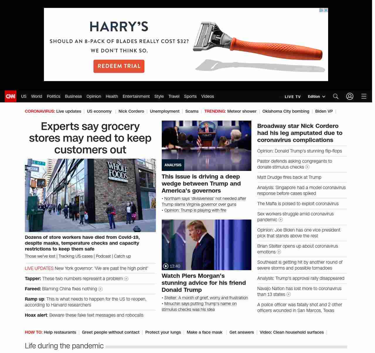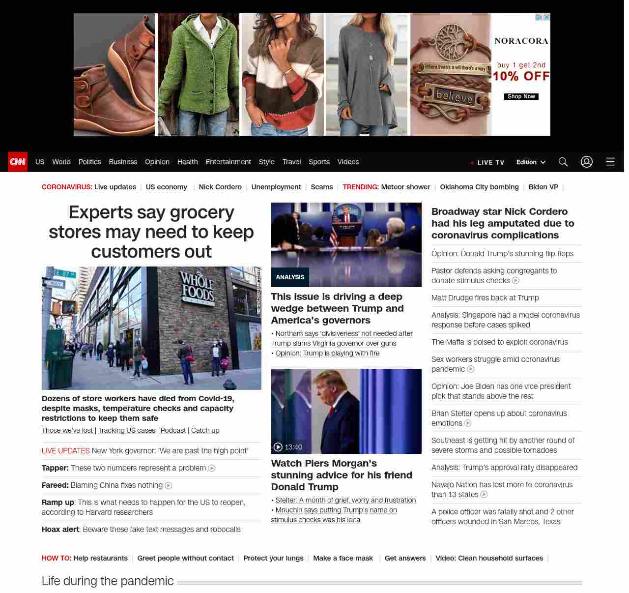 || screaming-banner-text banner-text-size–char-47″ data-analytics=”_list-hierarchical-xs_article_”> Experts say grocery stores may need to keep customers out ||” , title: “CNN – Breaking News, Latest News and Videos” , siblings: {“articleList”:[{“uri”:”/2020/04/19/health/us-coronavirus-sunday/index.html”,”headline”:”u003cstrong>Researchers say coronavirus testing must go up by at least 500,000 per day before the country can reopenu003c/strong>”,”thumbnail”:”//cdn.cnn.com/cnnnext/dam/assets/200419022643-coronavirus-us-main-write-0419-restricted-small-11.jpg”,”duration”:””,”description”:”u003ca href=”https://www.cnn.com/interactive/2020/health/coronavirus-victims-memories/” target=”_blank”>Those we’ve lost u003c/a>| u003ca href=”https://www.cnn.com/interactive/2020/health/coronavirus-us-maps-and-cases/” target=”_blank”>Tracking US casesu003c/a> | u003ca href=”https://www.cnn.com/audio/podcasts/corona-virus” target=”_blank”>Podcastu003c/a> | u003ca href=”https://www.cnn.com/2020/04/19/world/coronavirus-newsletter-04-19-20/index.html” target=”_blank”>Catch up u003c/a>”,”layout”:””