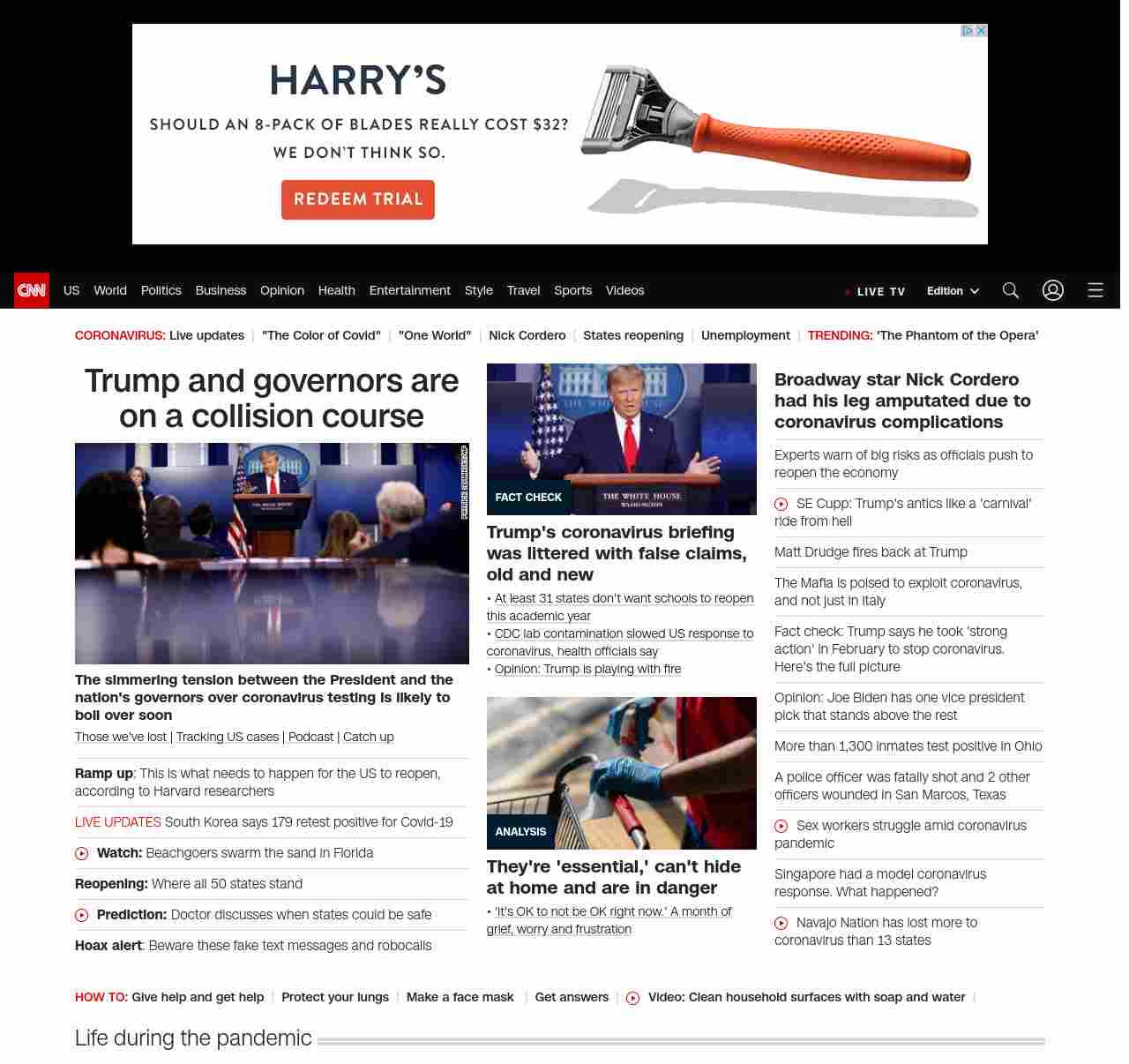 || screaming-banner-text banner-text-size–char-47″ data-analytics=”_list-hierarchical-xs_article_”> Trump and governors are on a collision course ||” , title: “CNN – Breaking News, Latest News and Videos” , siblings: {“articleList”:[{“uri”:”/2020/04/19/politics/trump-governors-coronavirus-testing/index.html”,”headline”:”u003cstrong>The simmering tension between the President and the nation’s governors over coronavirus testing is likely to boil over soonu003c/strong>”,”thumbnail”:”//cdn.cnn.com/cnnnext/dam/assets/200418201804-03-coronavirus-briefing-0418-small-11.jpg”,”duration”:””,”description”:”u003ca href=”https://www.cnn.com/interactive/2020/health/coronavirus-victims-memories/” target=”_blank”>Those we’ve lost u003c/a>| u003ca href=”https://www.cnn.com/interactive/2020/health/coronavirus-us-maps-and-cases/” target=”_blank”>Tracking US casesu003c/a> | u003ca href=”https://www.cnn.com/audio/podcasts/corona-virus” target=”_blank”>Podcastu003c/a> | u003ca href=”https://www.cnn.com/2020/04/18/world/coronavirus-newsletter-04-18-20/index.html” target=”_blank”>Catch up u003c/a>”,”layout”:””