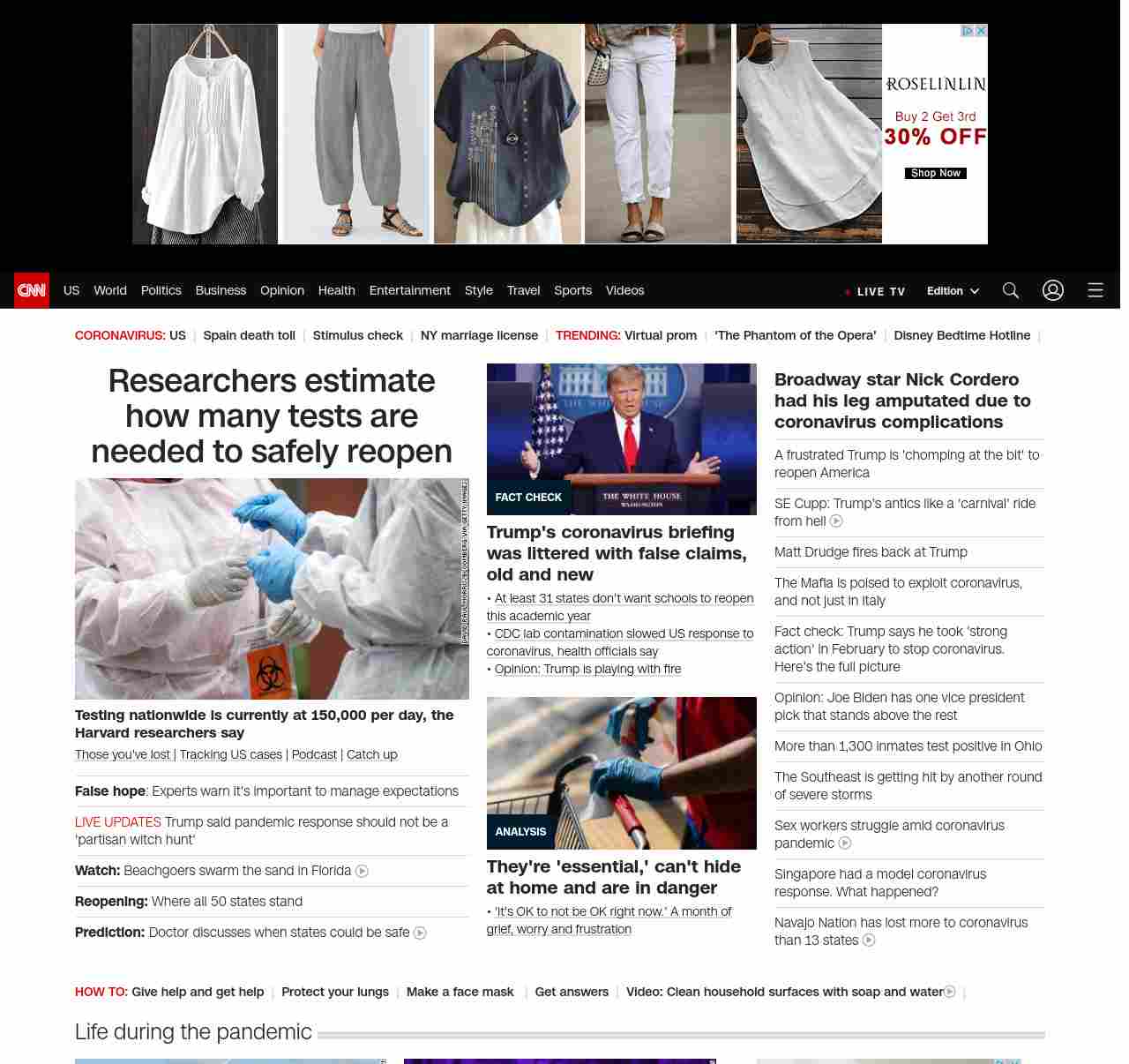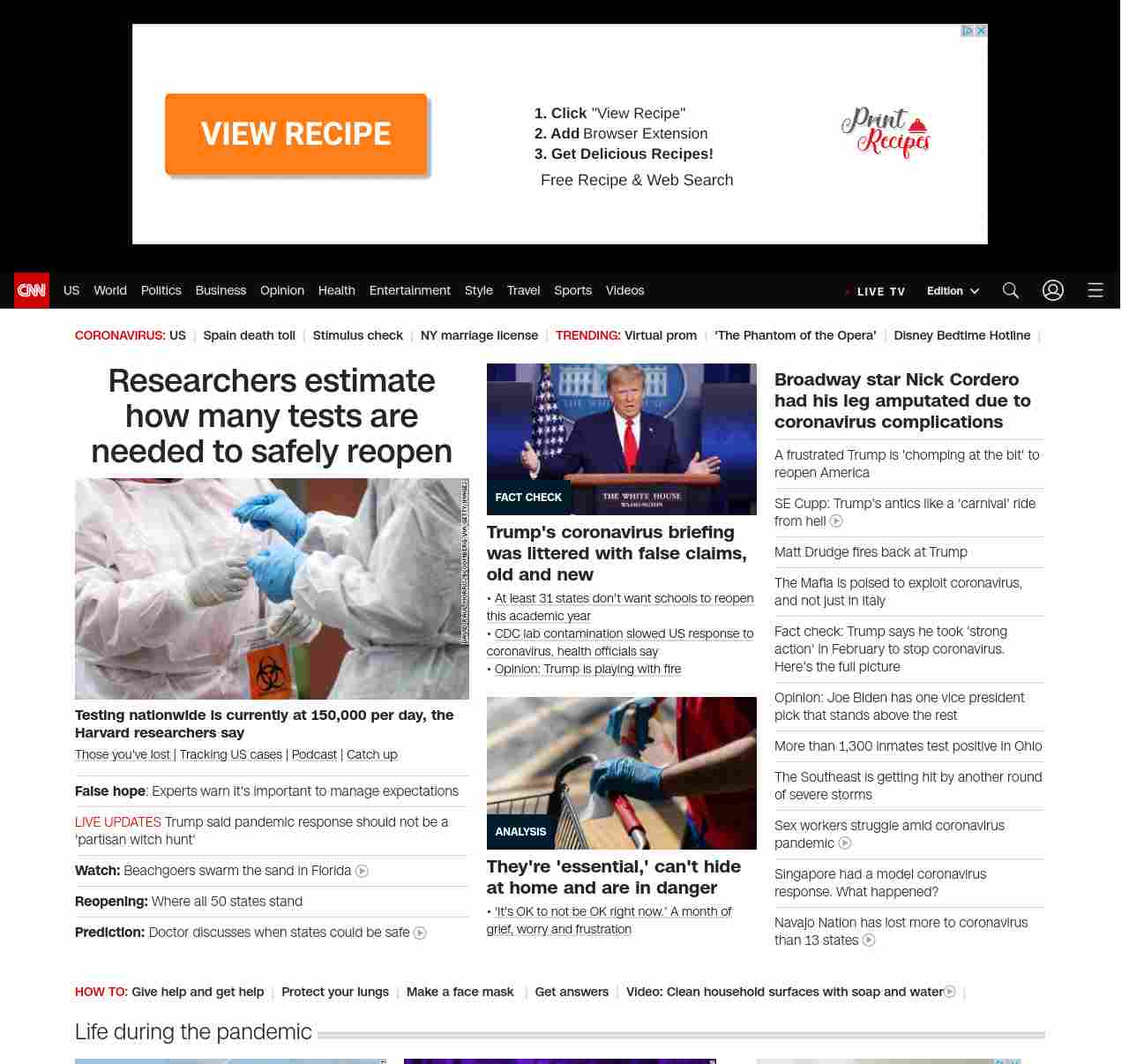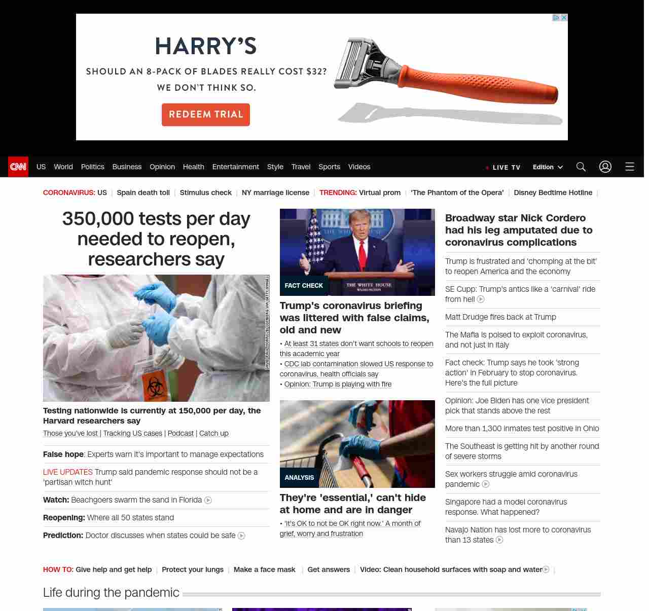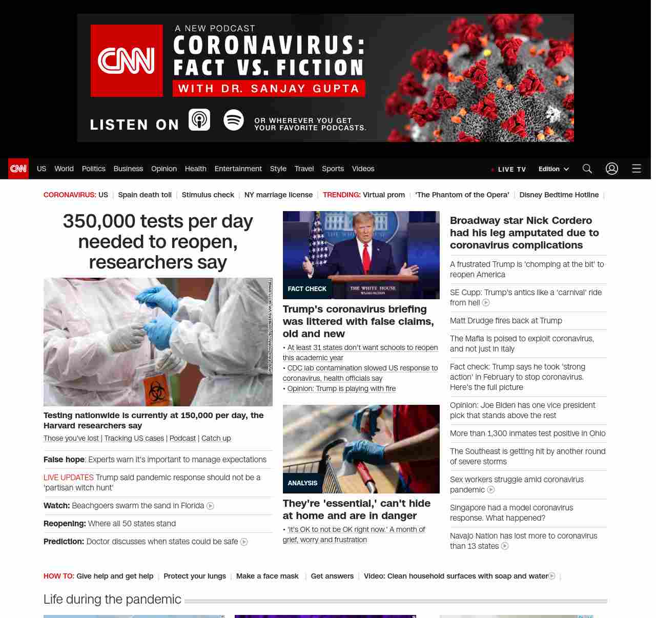 || screaming-banner-text banner-text-size–char-47″ data-analytics=”_list-hierarchical-xs_article_”> 350,000 tests per day needed to reopen, researchers say ||” , title: “CNN – Breaking News, Latest News and Videos” , siblings: {“articleList”:[{“uri”:”/2020/04/19/health/us-coronavirus-sunday/index.html”,”headline”:”u003cstrong>Testing nationwide is currently at 150,000 per day, the Harvard researchers sayu003c/strong>”,”thumbnail”:”//cdn.cnn.com/cnnnext/dam/assets/200419022643-coronavirus-us-main-write-0419-restricted-small-11.jpg”,”duration”:””,”description”:”u003ca href=”https://www.cnn.com/2020/04/08/health/share-coronavirus-covid19-victims-memories/index.html” target=”_blank”>Those you’ve lost u003c/a>| u003ca href=”https://www.cnn.com/interactive/2020/health/coronavirus-us-maps-and-cases/” target=”_blank”>Tracking US casesu003c/a> | u003ca href=”https://www.cnn.com/audio/podcasts/corona-virus” target=”_blank”>Podcastu003c/a> | u003ca href=”https://www.cnn.com/2020/04/18/world/coronavirus-newsletter-04-18-20/index.html” target=”_blank”>Catch up u003c/a>”,”layout”:””