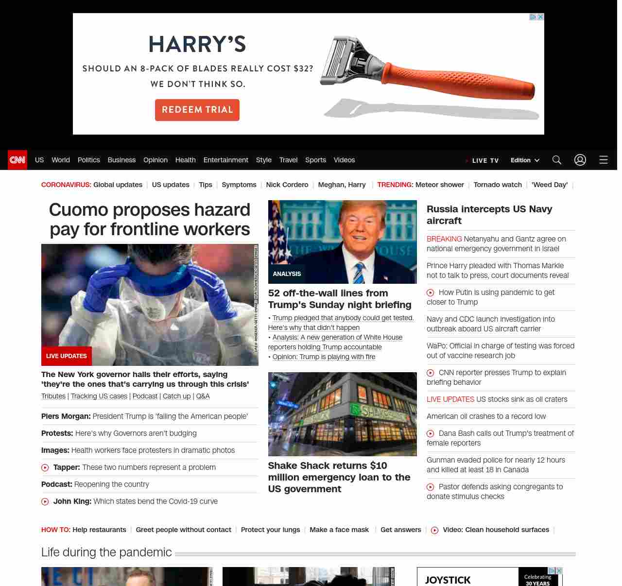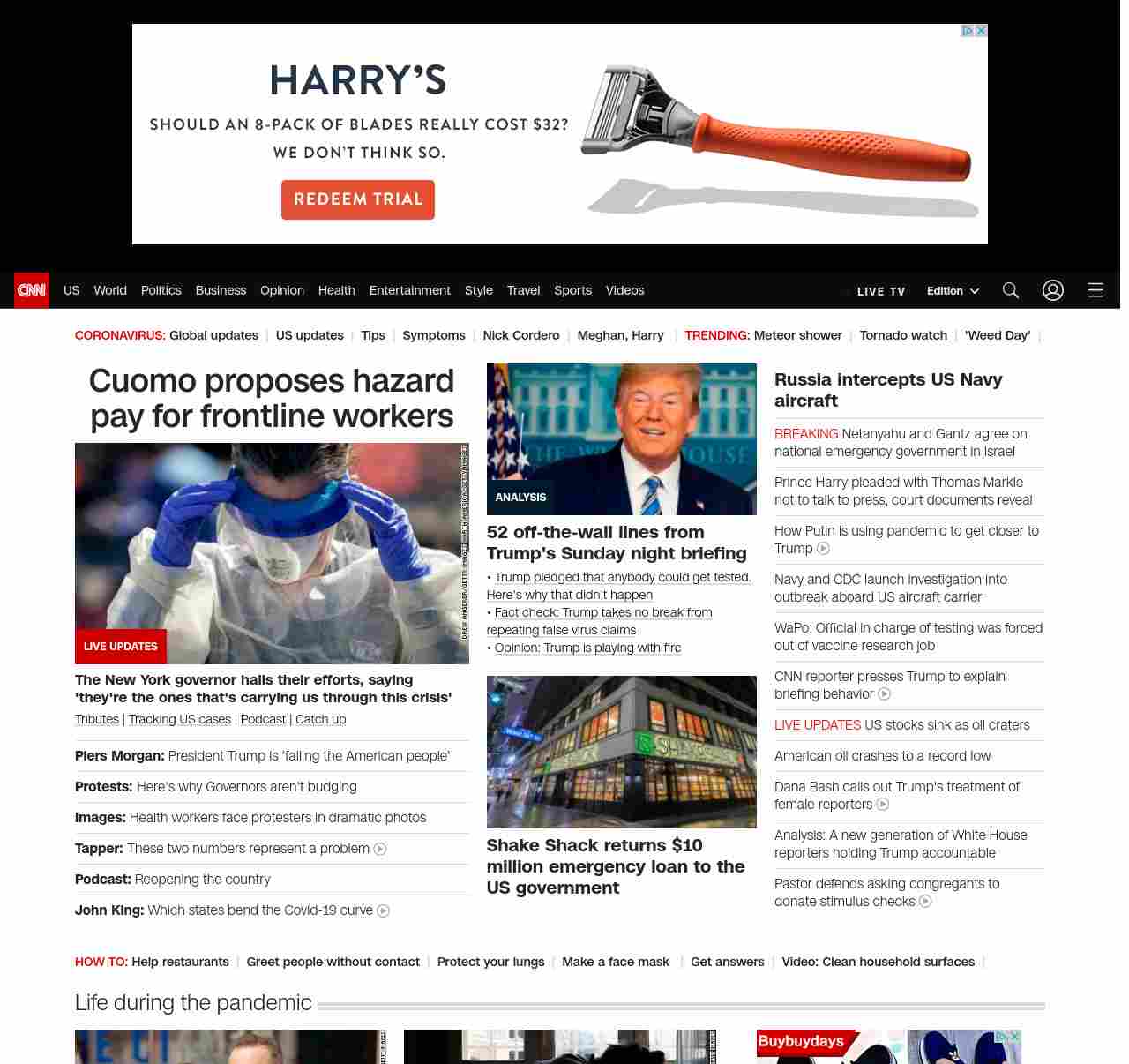 || screaming-banner-text banner-text-size–char-47″ data-analytics=”_list-hierarchical-xs_article_”> Cuomo proposes hazard pay for frontline workers ||” , title: “CNN – Breaking News, Latest News and Videos” , siblings: {“articleList”:[{“uri”:”/us/live-news/us-coronavirus-update-04-20-20/index.html”,”headline”:”u003cstrong>The New York governor hails their efforts, saying ‘they’re the ones that’s carrying us through this crisis’u003c/strong>”,”thumbnail”:”//cdn.cnn.com/cnnnext/dam/assets/200410001621-doctors-small-11.jpg”,”duration”:””,”description”:”u003ca href=”https://www.cnn.com/interactive/2020/health/coronavirus-victims-memories/” target=”_blank”>Tributesu003c/a> | u003ca href=”https://www.cnn.com/interactive/2020/health/coronavirus-us-maps-and-cases/” target=”_blank”>Tracking US casesu003c/a> | u003ca href=”https://www.cnn.com/audio/podcasts/corona-virus” target=”_blank”>Podcastu003c/a> | u003ca href=”https://www.cnn.com/2020/04/19/world/coronavirus-newsletter-04-19-20/index.html” target=”_blank”>Catch up u003c/a>”,”layout”:””