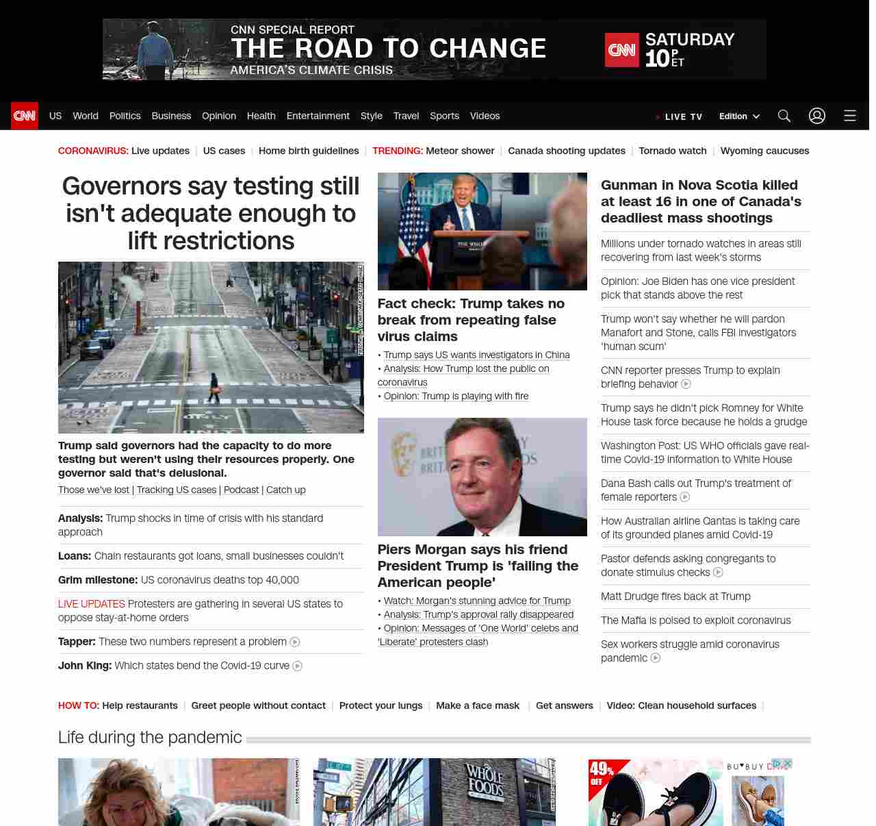 || screaming-banner-text banner-text-size–char-47″ data-analytics=”_list-hierarchical-xs_article_”> Governors say testing still isn’t adequate enough to lift restrictions ||” , title: “CNN – Breaking News, Latest News and Videos” , siblings: {“articleList”:[{“uri”:”/2020/04/20/us/coronavirus-updates-monday/index.html”,”headline”:”u003cstrong>Trump said governors had the capacity to do more testing but weren’t using their resources properly. One governor said that’s delusional.u003c/strong>”,”thumbnail”:”//cdn.cnn.com/cnnnext/dam/assets/200420025254-empty-street-new-york-city-0419-small-11.jpg”,”duration”:””,”description”:”u003ca href=”https://www.cnn.com/interactive/2020/health/coronavirus-victims-memories/” target=”_blank”>Those we’ve lost u003c/a>| u003ca href=”https://www.cnn.com/interactive/2020/health/coronavirus-us-maps-and-cases/” target=”_blank”>Tracking US casesu003c/a> | u003ca href=”https://www.cnn.com/audio/podcasts/corona-virus” target=”_blank”>Podcastu003c/a> | u003ca href=”https://www.cnn.com/2020/04/19/world/coronavirus-newsletter-04-19-20/index.html” target=”_blank”>Catch up u003c/a>”,”layout”:””