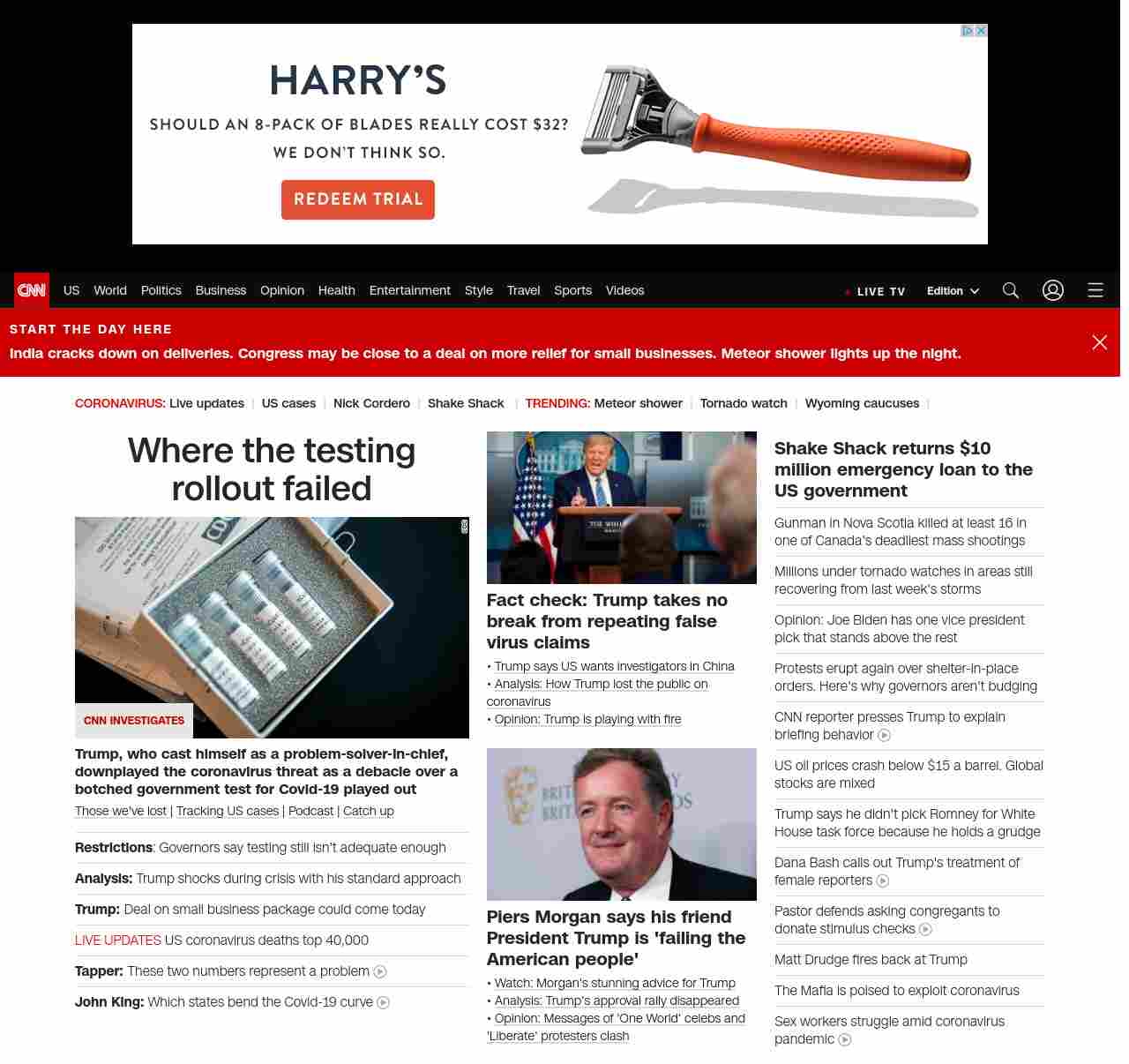 || screaming-banner-text banner-text-size–char-47″ data-analytics=”_list-hierarchical-xs_article_”> Governors say testing still isn’t adequate enough to lift restrictions ||” , title: “CNN – Breaking News, Latest News and Videos” , siblings: {“articleList”:[{“uri”:”/2020/04/20/politics/coronavirus-testing-trump-administration-response-invs/index.html”,”headline”:”u003cstrong>Trump, who cast himself as a problem-solver-in-chief, downplayed the coronavirus threat as a debacle over a botched government test for Covid-19 played outu003c/strong>”,”thumbnail”:”//cdn.cnn.com/cnnnext/dam/assets/200307115523-cdc-test-kit-coronavirus-small-11.jpg”,”duration”:””,”description”:”u003ca href=”https://www.cnn.com/interactive/2020/health/coronavirus-victims-memories/” target=”_blank”>Those we’ve lost u003c/a>| u003ca href=”https://www.cnn.com/interactive/2020/health/coronavirus-us-maps-and-cases/” target=”_blank”>Tracking US casesu003c/a> | u003ca href=”https://www.cnn.com/audio/podcasts/corona-virus” target=”_blank”>Podcastu003c/a> | u003ca href=”https://www.cnn.com/2020/04/19/world/coronavirus-newsletter-04-19-20/index.html” target=”_blank”>Catch up u003c/a>”,”layout”:””