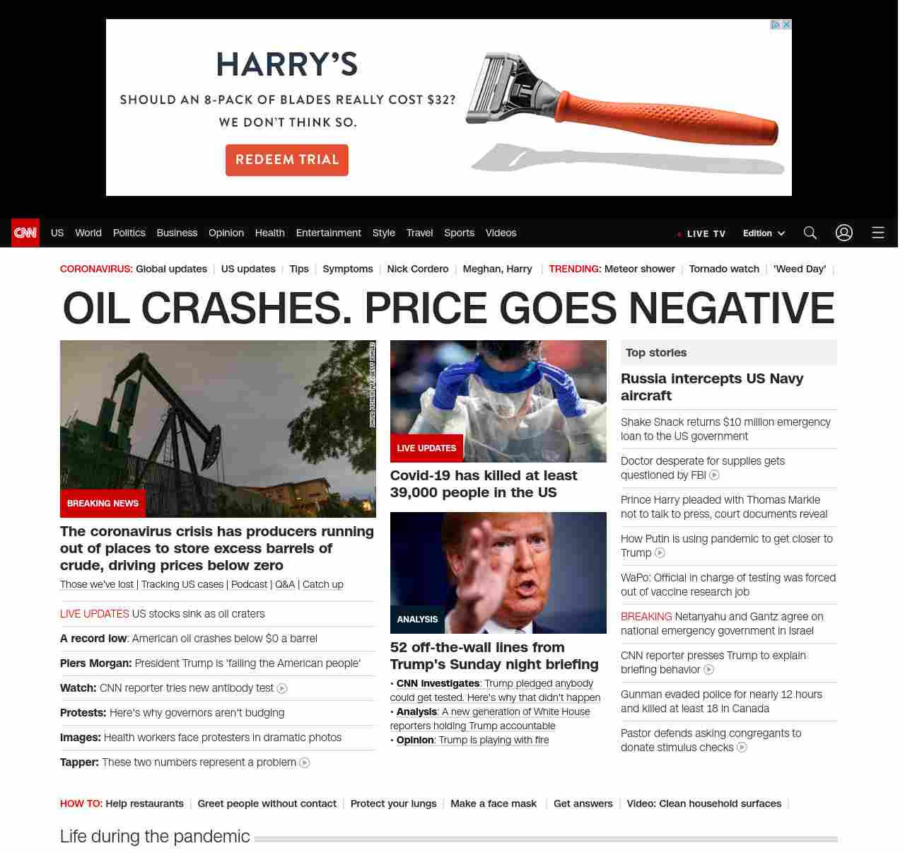 || banner-text–maximized banner-text-size–char-35-uc”> OIL CRASHES. PRICE GOES NEGATIVE ||” , title: “CNN – Breaking News, Latest News and Videos” , siblings: {“articleList”:[{“uri”:”/2020/04/20/investing/premarket-stocks-trading/index.html”,”headline”:”u003cstrong>The coronavirus crisis has producers running out of places to store excess barrels of crude, driving prices below zerou003c/strong>”,”thumbnail”:”//cdn.cnn.com/cnnnext/dam/assets/200420114847-oil-pump-jacks-crude-usa-0309-small-11.jpg”,”duration”:””,”description”:”u003ca href=”https://www.cnn.com/interactive/2020/health/coronavirus-victims-memories/” target=”_blank”>Those we’ve lost u003c/a>| u003ca href=”https://www.cnn.com/interactive/2020/health/coronavirus-us-maps-and-cases/” target=”_blank”>Tracking US casesu003c/a> | u003ca href=”https://www.cnn.com/audio/podcasts/corona-virus” target=”_blank”>Podcastu003c/a> | u003ca href=”https://www.cnn.com/interactive/2020/health/coronavirus-questions-answers/” target=”_blank”>Q&Au003c/a> | u003ca href=”https://www.cnn.com/2020/04/19/world/coronavirus-newsletter-04-19-20/index.html” target=”_blank”>Catch upu003c/a>”,”layout”:””