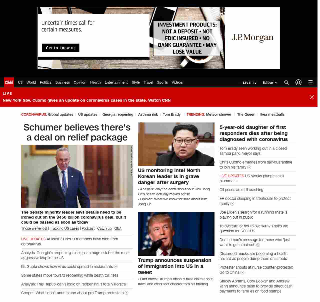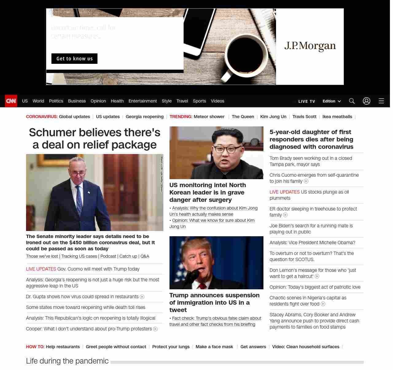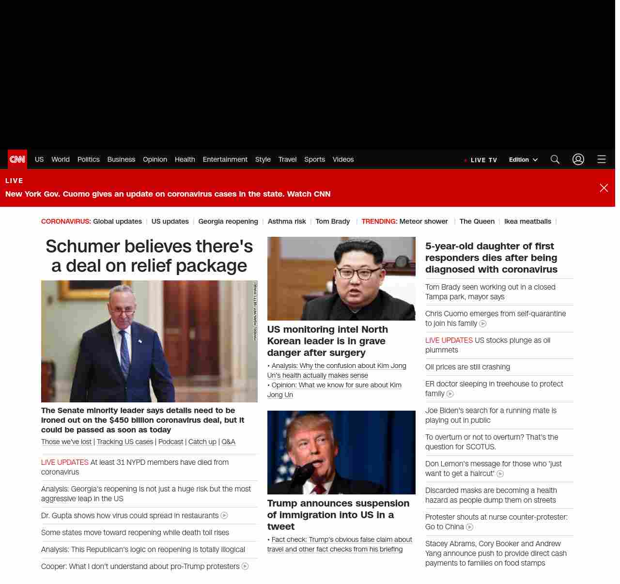 || screaming-banner-text banner-text-size–char-47″ data-analytics=”_list-hierarchical-xs_article_”> Schumer believes there’s a deal on relief package ||” , title: “CNN – Breaking News, Latest News and Videos” , siblings: {“articleList”:[{“uri”:”/2020/04/21/politics/donald-trump-georgia-coronavirus-economy/index.html”,”headline”:”u003cstrong>Reopening as the national death toll rises is not just a huge risk, but it’s the most aggressive leap in the USu003c/strong>”,”thumbnail”:”//cdn.cnn.com/cnnnext/dam/assets/181104134707-03-brian-kemp-0724-small-11.jpg”,”duration”:””,”description”:”u003ca href=”https://www.cnn.com/interactive/2020/health/coronavirus-victims-memories/” target=”_blank”>Those we’ve lost u003c/a>| u003ca href=”https://www.cnn.com/interactive/2020/health/coronavirus-us-maps-and-cases/” target=”_blank”>Tracking US casesu003c/a> | u003ca href=”https://www.cnn.com/audio/podcasts/corona-virus” target=”_blank”>Podcastu003c/a> | u003ca href=”https://www.cnn.com/2020/04/20/world/coronavirus-newsletter-04-20-20-intl/index.html” target=”_blank”>Catch upu003c/a> | u003ca href=”http://cnn.com/CoronavirusAnswers” target=”_blank”>Q&Au003c/a>”,”layout”:””