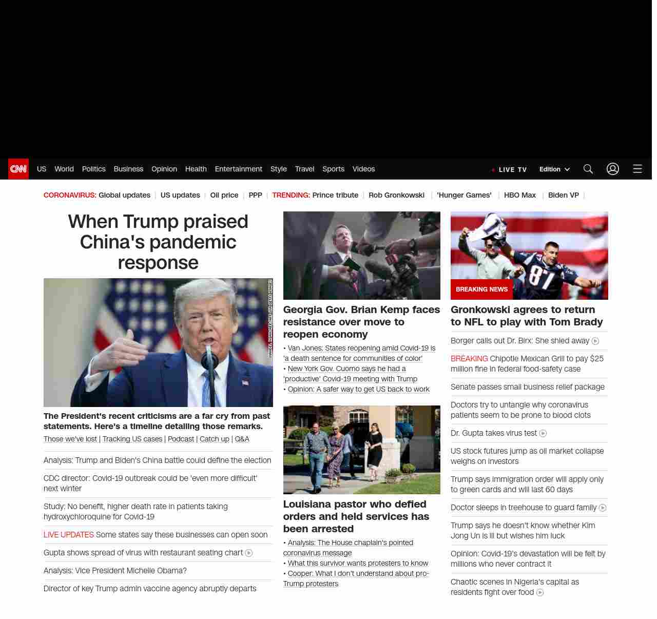 || screaming-banner-text banner-text-size–char-47″ data-analytics=”_list-hierarchical-xs_article_”> When Trump praised China’s pandemic response ||” , title: “CNN – Breaking News, Latest News and Videos” , siblings: {“articleList”:[{“uri”:”/2020/04/21/politics/trump-china-praise-coronavirus-timeline/index.html”,”headline”:”u003cstrong>The President’s recent criticisms are a far cry from past statements. Here’s a timeline detailing those remarks.u003c/strong>”,”thumbnail”:”//cdn.cnn.com/cnnnext/dam/assets/190824115956-trump-xi-split-small-1-1.jpg”,”duration”:””,”description”:” u003ca href=”https://www.cnn.com/interactive/2020/health/coronavirus-victims-memories/” target=”_blank”>Those we’ve lost u003c/a>| u003ca href=”https://www.cnn.com/interactive/2020/health/coronavirus-us-maps-and-cases/” target=”_blank”>Tracking US casesu003c/a> | u003ca href=”https://www.cnn.com/audio/podcasts/corona-virus” target=”_blank”>Podcastu003c/a> | u003ca href=”https://www.cnn.com/2020/04/20/world/coronavirus-newsletter-04-20-20-intl/index.html” target=”_blank”>Catch upu003c/a> | u003ca href=”http://cnn.com/CoronavirusAnswers” target=”_blank”>Q&Au003c/a>”,”layout”:””
