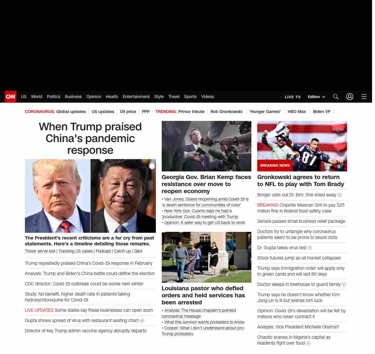 || screaming-banner-text banner-text-size–char-47″ data-analytics=”_list-hierarchical-xs_article_”> When Trump praised China’s pandemic response ||” , title: “CNN – Breaking News, Latest News and Videos” , siblings: {“articleList”:[{“uri”:”/2020/04/21/politics/trump-china-praise-coronavirus-timeline/index.html”,”headline”:”u003cstrong>The President’s recent criticisms are a far cry from past statements. Here’s a timeline detailing those remarks.u003c/strong>”,”thumbnail”:”//cdn.cnn.com/cnnnext/dam/assets/200416013606-donald-trump-april-15-2020-01-small-11.jpg”,”duration”:””,”description”:” u003ca href=”https://www.cnn.com/interactive/2020/health/coronavirus-victims-memories/” target=”_blank”>Those we’ve lost u003c/a>| u003ca href=”https://www.cnn.com/interactive/2020/health/coronavirus-us-maps-and-cases/” target=”_blank”>Tracking US casesu003c/a> | u003ca href=”https://www.cnn.com/audio/podcasts/corona-virus” target=”_blank”>Podcastu003c/a> | u003ca href=”https://www.cnn.com/2020/04/20/world/coronavirus-newsletter-04-20-20-intl/index.html” target=”_blank”>Catch upu003c/a> | u003ca href=”http://cnn.com/CoronavirusAnswers” target=”_blank”>Q&Au003c/a>”,”layout”:””