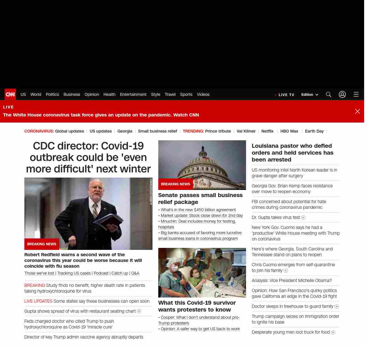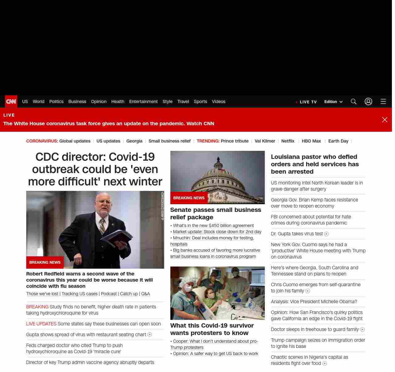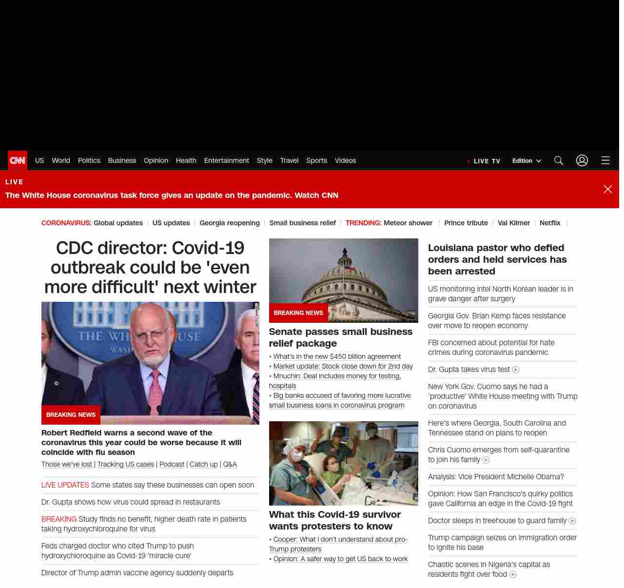 || screaming-banner-text banner-text-size–char-47″ data-analytics=”_list-hierarchical-xs_article_”> CDC director: Covid-19 outbreak could be ‘even more difficult’ next winter ||” , title: “CNN – Breaking News, Latest News and Videos” , siblings: {“articleList”:[{“uri”:”/2020/04/21/politics/second-coronavirus-cdc-director-robert-redfield/index.html”,”headline”:”u003cstrong>Robert Redfield warns a second wave of the coronavirus this year could be worse because it will coincide with flu seasonu003c/strong>”,”thumbnail”:”//cdn.cnn.com/cnnnext/dam/assets/200419190058-03-testing-trump-response-invs-small-11.jpg”,”duration”:””,”description”:” u003ca href=”https://www.cnn.com/interactive/2020/health/coronavirus-victims-memories/” target=”_blank”>Those we’ve lost u003c/a>| u003ca href=”https://www.cnn.com/interactive/2020/health/coronavirus-us-maps-and-cases/” target=”_blank”>Tracking US casesu003c/a> | u003ca href=”https://www.cnn.com/audio/podcasts/corona-virus” target=”_blank”>Podcastu003c/a> | u003ca href=”https://www.cnn.com/2020/04/20/world/coronavirus-newsletter-04-20-20-intl/index.html” target=”_blank”>Catch upu003c/a> | u003ca href=”http://cnn.com/CoronavirusAnswers” target=”_blank”>Q&Au003c/a>”,”layout”:””