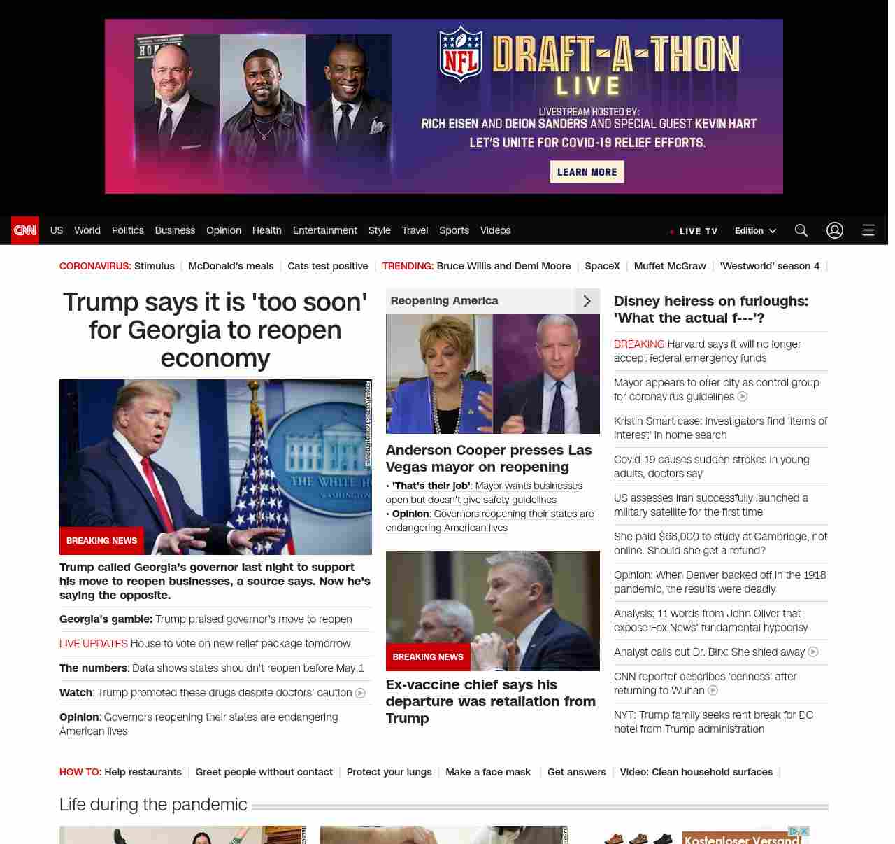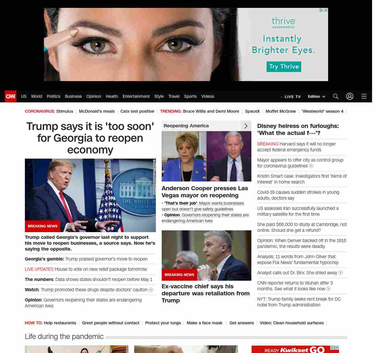 || screaming-banner-text banner-text-size–char-47″ data-analytics=”_list-hierarchical-xs_hyperlink_”> Trump says it is ‘too soon’ for Georgia to reopen economy ||” , title: “CNN – Breaking News, Latest News and Videos” , siblings: {“articleList”:[{“uri”:”/videos/politics/2020/04/22/hydroxychloroquine-trump-covid-19-study-mh-orig.cnn”,”headline”:”u003cstrong>Watchu003c/strong>: Trump promoted these drugs despite doctors’ caution”,”thumbnail”:”//cdn.cnn.com/cnnnext/dam/assets/200421192313-donald-trump-immigration-order-coronavirus-green-cards-briefing-acosta-bts-tsr-vpx-00000310-small-11.jpg”,”duration”:”01:51″,”description”:”President Donald Trump repeatedly suggested hydroxychloroquine as a treatment for Covid-19 patients. Early trials of the drug found it does not help and sometimes has negative side effects.”,”layout”:””,”iconType”:”video”
