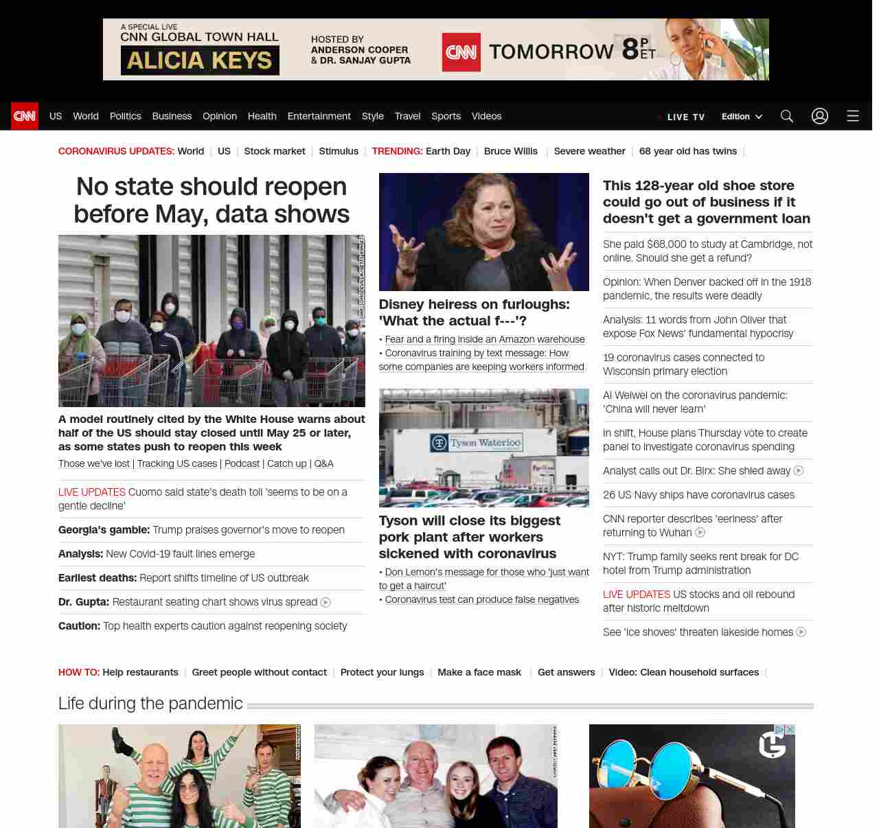 || screaming-banner-text banner-text-size–char-47″ data-analytics=”_list-hierarchical-xs_article_”> No state should reopen before May, data shows ||” , title: “CNN – Breaking News, Latest News and Videos” , siblings: {“articleList”:[{“uri”:”/2020/04/22/health/us-coronavirus-wednesday/index.html”,”headline”:”u003cstrong>A model routinely cited by the White House warns about half of the US should stay closed until May 25 or later, as some states push to reopen this weeku003c/strong>”,”thumbnail”:”//cdn.cnn.com/cnnnext/dam/assets/200420143421-grocery-masks-small-11.jpg”,”duration”:””,”description”:” u003ca href=”https://www.cnn.com/interactive/2020/health/coronavirus-victims-memories/” target=”_blank”>Those we’ve lost u003c/a>| u003ca href=”https://www.cnn.com/interactive/2020/health/coronavirus-us-maps-and-cases/” target=”_blank”>Tracking US casesu003c/a> | u003ca href=”https://www.cnn.com/audio/podcasts/corona-virus” target=”_blank”>Podcastu003c/a> | u003ca href=”http://www.cnn.com/2020/04/22/world/coronavirus-newsletter-04-22-20-intl/index.html” target=”_blank”>Catch upu003c/a> | u003ca href=”http://cnn.com/CoronavirusAnswers” target=”_blank”>Q&Au003c/a>”,”layout”:””