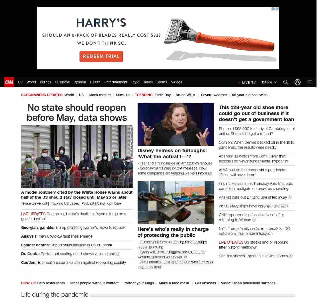 || screaming-banner-text banner-text-size–char-47″ data-analytics=”_list-hierarchical-xs_article_”> No state should reopen before May, data shows ||” , title: “CNN – Breaking News, Latest News and Videos” , siblings: {“articleList”:[{“uri”:”/2020/04/22/health/us-coronavirus-wednesday/index.html”,”headline”:”u003cstrong>A model routinely cited by the White House warns about half of the US should stay closed until May 25 or lateru003c/strong>”,”thumbnail”:”//cdn.cnn.com/cnnnext/dam/assets/200420143421-grocery-masks-small-11.jpg”,”duration”:””,”description”:” u003ca href=”https://www.cnn.com/interactive/2020/health/coronavirus-victims-memories/” target=”_blank”>Those we’ve lost u003c/a>| u003ca href=”https://www.cnn.com/interactive/2020/health/coronavirus-us-maps-and-cases/” target=”_blank”>Tracking US casesu003c/a> | u003ca href=”https://www.cnn.com/audio/podcasts/corona-virus” target=”_blank”>Podcastu003c/a> | u003ca href=”http://www.cnn.com/2020/04/22/world/coronavirus-newsletter-04-22-20-intl/index.html” target=”_blank”>Catch upu003c/a> | u003ca href=”http://cnn.com/CoronavirusAnswers” target=”_blank”>Q&Au003c/a>”,”layout”:””