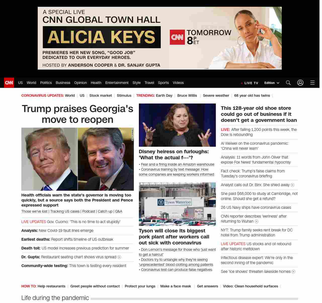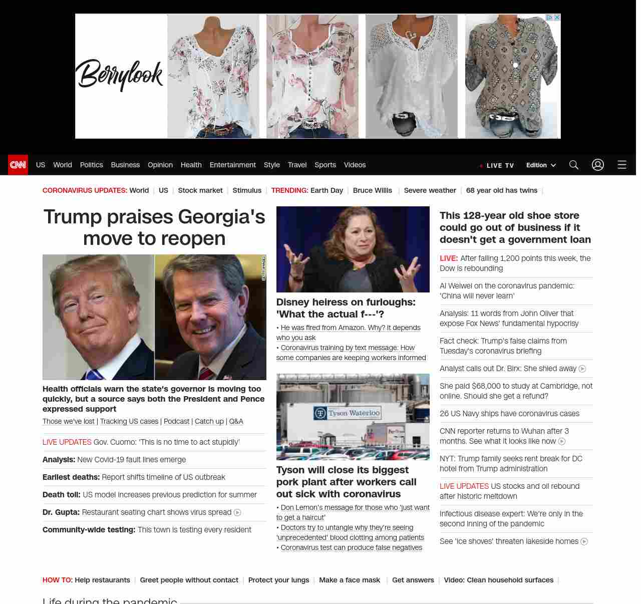 || screaming-banner-text banner-text-size–char-41″ data-analytics=”_list-hierarchical-xs_article_”> Trump praises Georgia’s move to reopen ||” , title: “CNN – Breaking News, Latest News and Videos” , siblings: {“articleList”:[{“uri”:”/2020/04/22/politics/trump-pence-georgia-governor-brian-kemp/index.html”,”headline”:”Health officials warn the state’s governor is moving too quickly, but a source says both the President and Pence expressed support”,”thumbnail”:”//cdn.cnn.com/cnnnext/dam/assets/200422123738-trump-kemp-split-small-11.jpg”,”duration”:””,”description”:” u003ca href=”https://www.cnn.com/interactive/2020/health/coronavirus-victims-memories/” target=”_blank”>Those we’ve lost u003c/a>| u003ca href=”https://www.cnn.com/interactive/2020/health/coronavirus-us-maps-and-cases/” target=”_blank”>Tracking US casesu003c/a> | u003ca href=”https://www.cnn.com/audio/podcasts/corona-virus” target=”_blank”>Podcastu003c/a> | u003ca href=”http://www.cnn.com/2020/04/22/world/coronavirus-newsletter-04-22-20-intl/index.html” target=”_blank”>Catch upu003c/a> | u003ca href=”http://cnn.com/CoronavirusAnswers” target=”_blank”>Q&Au003c/a>”,”layout”:””
