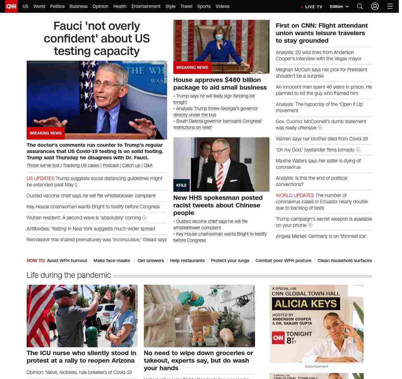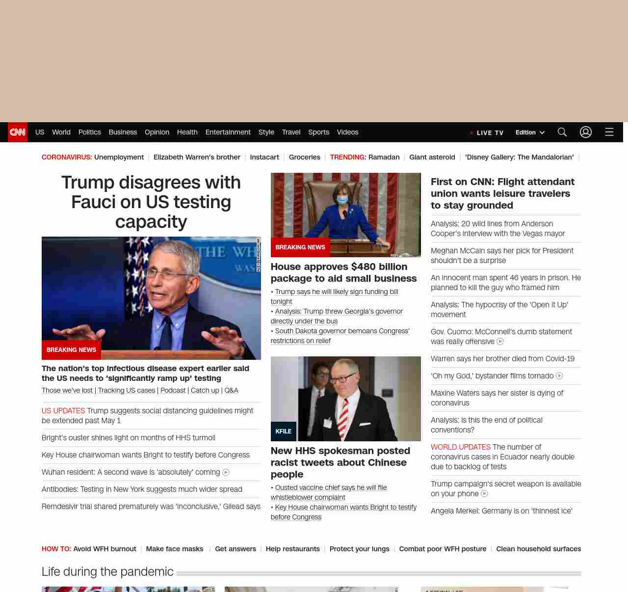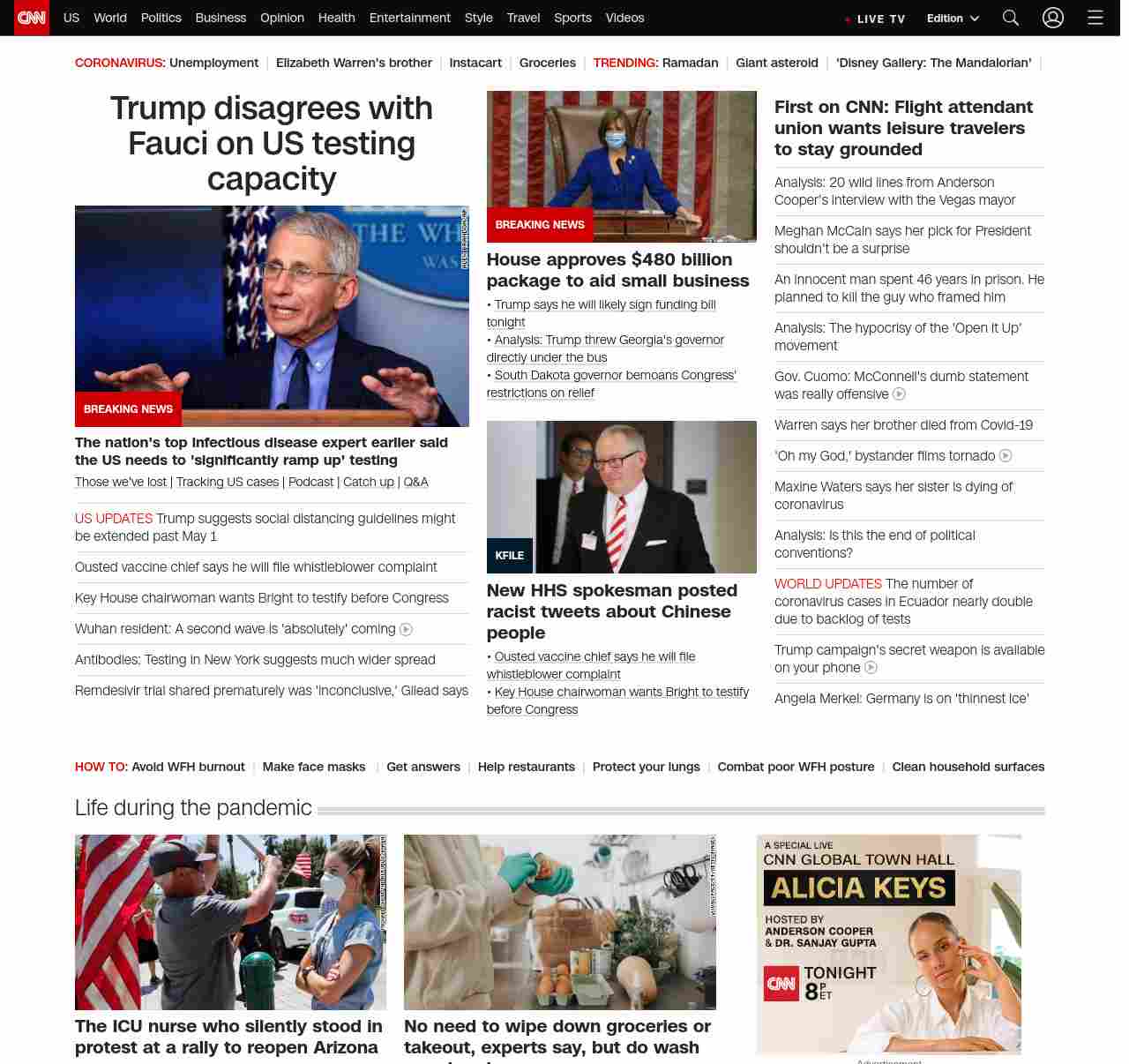 || screaming-banner-text banner-text-size–char-47″ data-analytics=”_list-hierarchical-xs_article_”> New HHS spokesman posted racist tweets about Chinese people ||” , title: “CNN – Breaking News, Latest News and Videos” , siblings: {“articleList”:[{“uri”:”/2020/04/23/politics/fauci-testing-capacity-not-overly-confident/index.html”,”headline”:”u003cstrong>The doctor’s comments run counter to Trump’s regular assurances that US Covid-19 testing is on solid footing. Trump said Thursday he disagrees with Dr. Fauci.u003c/strong>”,”thumbnail”:”//cdn.cnn.com/cnnnext/dam/assets/200422180137-fauci-trump-daily-briefing-0422-small-11.jpg”,”duration”:””,”description”:” u003ca href=”https://www.cnn.com/interactive/2020/health/coronavirus-victims-memories/” target=”_blank”>Those we’ve lost u003c/a>| u003ca href=”https://www.cnn.com/interactive/2020/health/coronavirus-us-maps-and-cases/” target=”_blank”>Tracking US casesu003c/a> | u003ca href=”https://www.cnn.com/audio/podcasts/corona-virus” target=”_blank”>Podcastu003c/a> | u003ca href=”https://www.cnn.com/2020/04/23/world/coronavirus-newsletter-04-23-20-intl/index.html” target=”_blank”>Catch upu003c/a> | u003ca href=”http://cnn.com/CoronavirusAnswers” target=”_blank”>Q&Au003c/a>”,”layout”:””