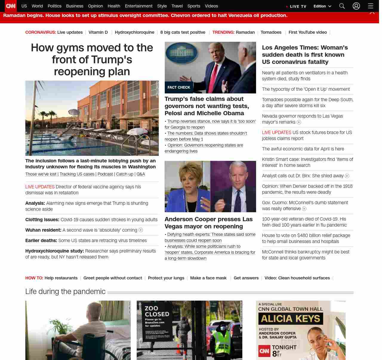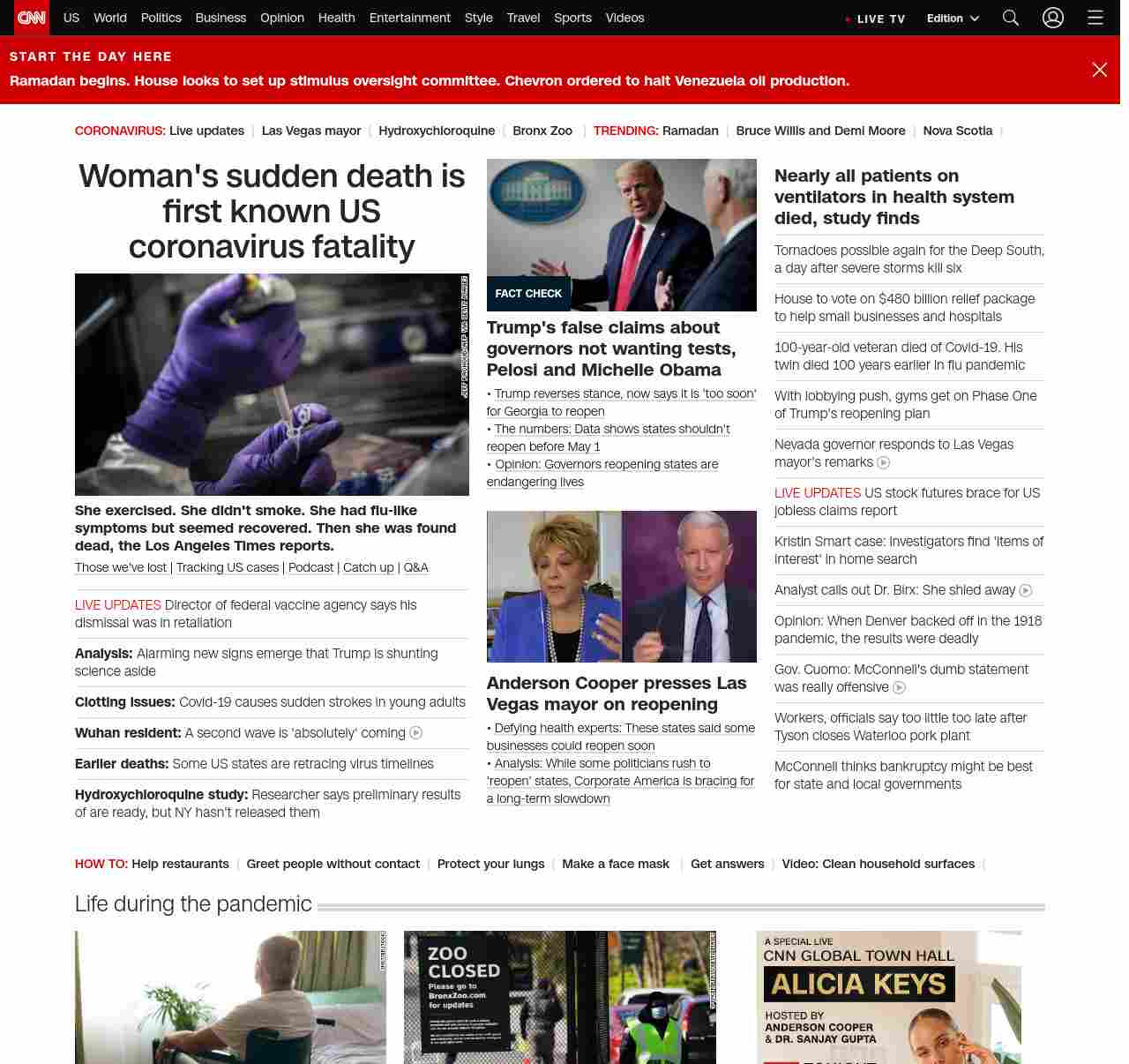 || screaming-banner-text banner-text-size–char-47″ data-analytics=”_list-hierarchical-xs_article_”> Woman’s sudden death is first known US coronavirus fatality ||” , title: “CNN – Breaking News, Latest News and Videos” , siblings: {“articleList”:[{“uri”:”/2020/04/23/us/california-woman-first-coronavirus-death/index.html”,”headline”:”u003cstrong>She exercised. She didn’t smoke. She had flu-like symptoms but seemed recovered. Then she was found dead, the Los Angeles Times reports.u003c/strong>”,”thumbnail”:”//cdn.cnn.com/cnnnext/dam/assets/200228111204-01-coronavirus-treatment-testing-0205-small-11.jpg”,”duration”:””,”description”:” u003ca href=”https://www.cnn.com/interactive/2020/health/coronavirus-victims-memories/” target=”_blank”>Those we’ve lost u003c/a>| u003ca href=”https://www.cnn.com/interactive/2020/health/coronavirus-us-maps-and-cases/” target=”_blank”>Tracking US casesu003c/a> | u003ca href=”https://www.cnn.com/audio/podcasts/corona-virus” target=”_blank”>Podcastu003c/a> | u003ca href=”http://www.cnn.com/2020/04/22/world/coronavirus-newsletter-04-22-20-intl/index.html” target=”_blank”>Catch upu003c/a> | u003ca href=”http://cnn.com/CoronavirusAnswers” target=”_blank”>Q&Au003c/a>”,”layout”:””