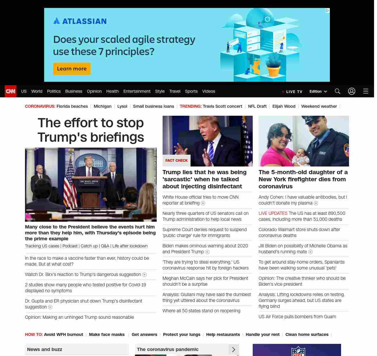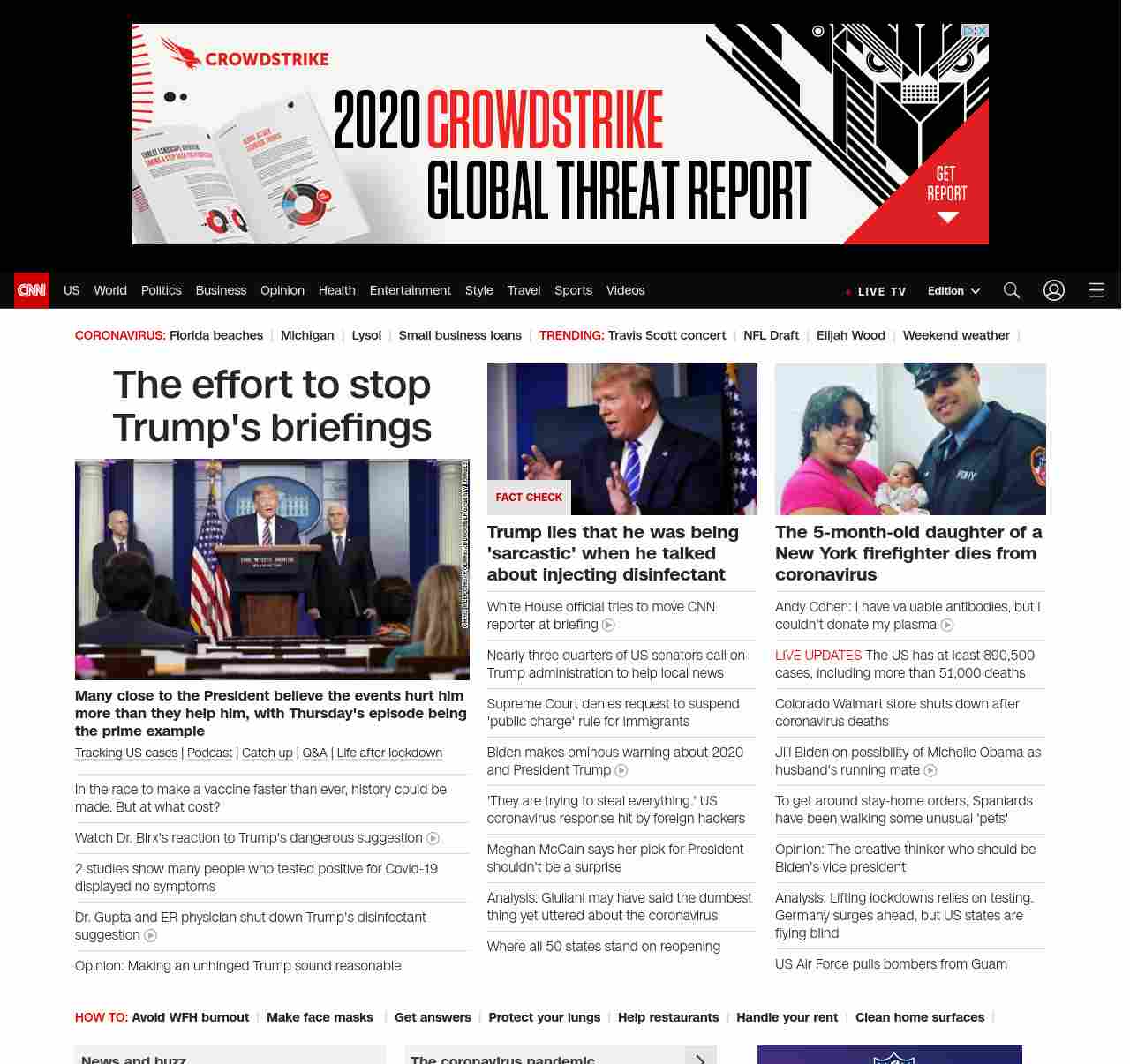 || screaming-banner-text banner-text-size–char-47″ data-analytics=”_list-hierarchical-xs_article_”> Trump peddles dangerous cures for coronavirus ||” , title: “CNN – Breaking News, Latest News and Videos” , siblings: {“articleList”:[{“uri”:”/2020/04/24/politics/white-house-briefings-coronavirus/index.html”,”headline”:”u003cstrong>Many close to the President believe the events hurt him more than they help him, with Thursday’s episode being the prime exampleu003c/strong>”,”thumbnail”:”//cdn.cnn.com/cnnnext/dam/assets/200424204547-01-coronavirus-briefing-0424-trump-small-11.jpg”,”duration”:””,”description”:”u003ca href=”https://www.cnn.com/interactive/2020/health/coronavirus-us-maps-and-cases/” target=”_blank”>Tracking US casesu003c/a> | u003ca href=”https://www.cnn.com/audio/podcasts/corona-virus” target=”_blank”>Podcastu003c/a> | u003ca href=”https://www.cnn.com/2020/04/20/world/coronavirus-newsletter-04-20-20-intl/index.html” target=”_blank”>Catch upu003c/a> | u003ca href=”http://cnn.com/CoronavirusAnswers” target=”_blank”>Q&Au003c/a> | u003ca href=”https://www.cnn.com/2020/04/24/world/gallery/coronavirus-after-lockdown/index.html” target=”_blank”>Life after lockdownu003c/a>”,”layout”:””