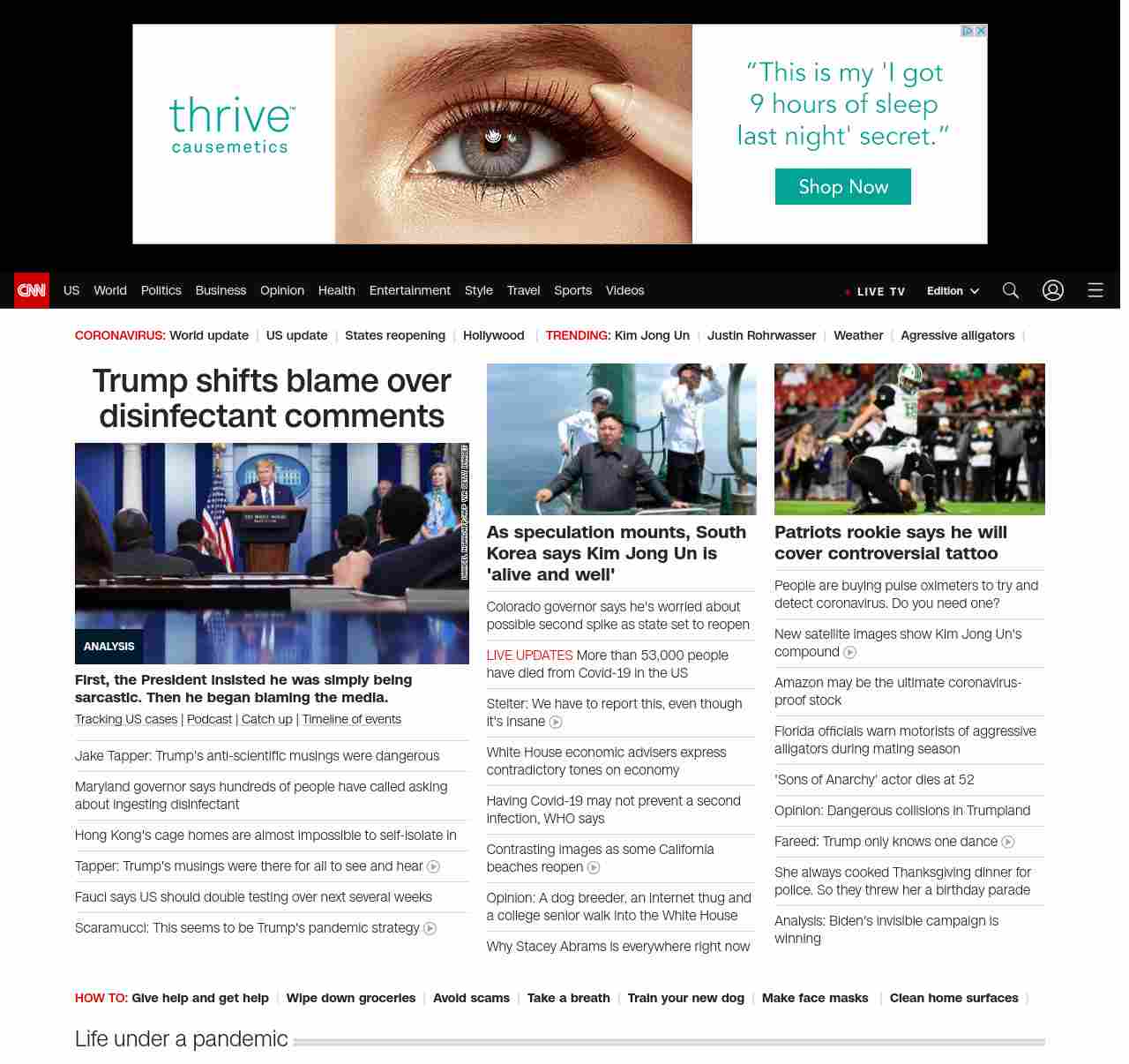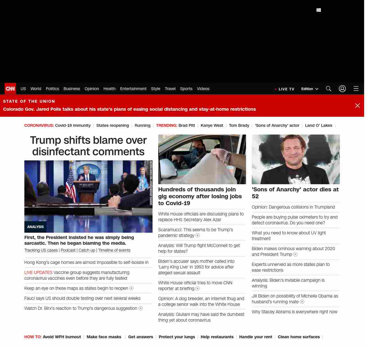 || screaming-banner-text banner-text-size–char-47″ data-analytics=”_list-hierarchical-xs_article_”> Trump shifts blame over disinfectant comments ||” , title: “CNN – Breaking News, Latest News and Videos” , siblings: {“articleList”:[{“uri”:”/2020/04/26/politics/trump-briefings-media-blame-disinfectant-comments/index.html”,”headline”:”u003cstrong>First, the President insisted he was simply being sarcastic. Then he began blaming the media.u003c/strong>”,”thumbnail”:”//cdn.cnn.com/cnnnext/dam/assets/200422005050-fact-check-donald-trump-coronavirus-briefing-harvard-social-distancing-georgia-dale-ctn-vpx-00004815-small-11.jpg”,”duration”:””,”description”:”u003ca href=”https://www.cnn.com/interactive/2020/health/coronavirus-us-maps-and-cases/” target=”_blank”>Tracking US casesu003c/a> | u003ca href=”https://www.cnn.com/audio/podcasts/corona-virus” target=”_blank”>Podcastu003c/a> |u003ca href=”https://www.cnn.com/2020/04/26/world/coronavirus-newsletter-04-26-20-intl/index.html” target=”_blank”> Catch upu003c/a> | u003ca href=”https://www.cnn.com/interactive/2020/health/covid19-pandemic-video-timeline/index.html” target=”_blank”>Timeline of eventsu003c/a>”,”layout”:””