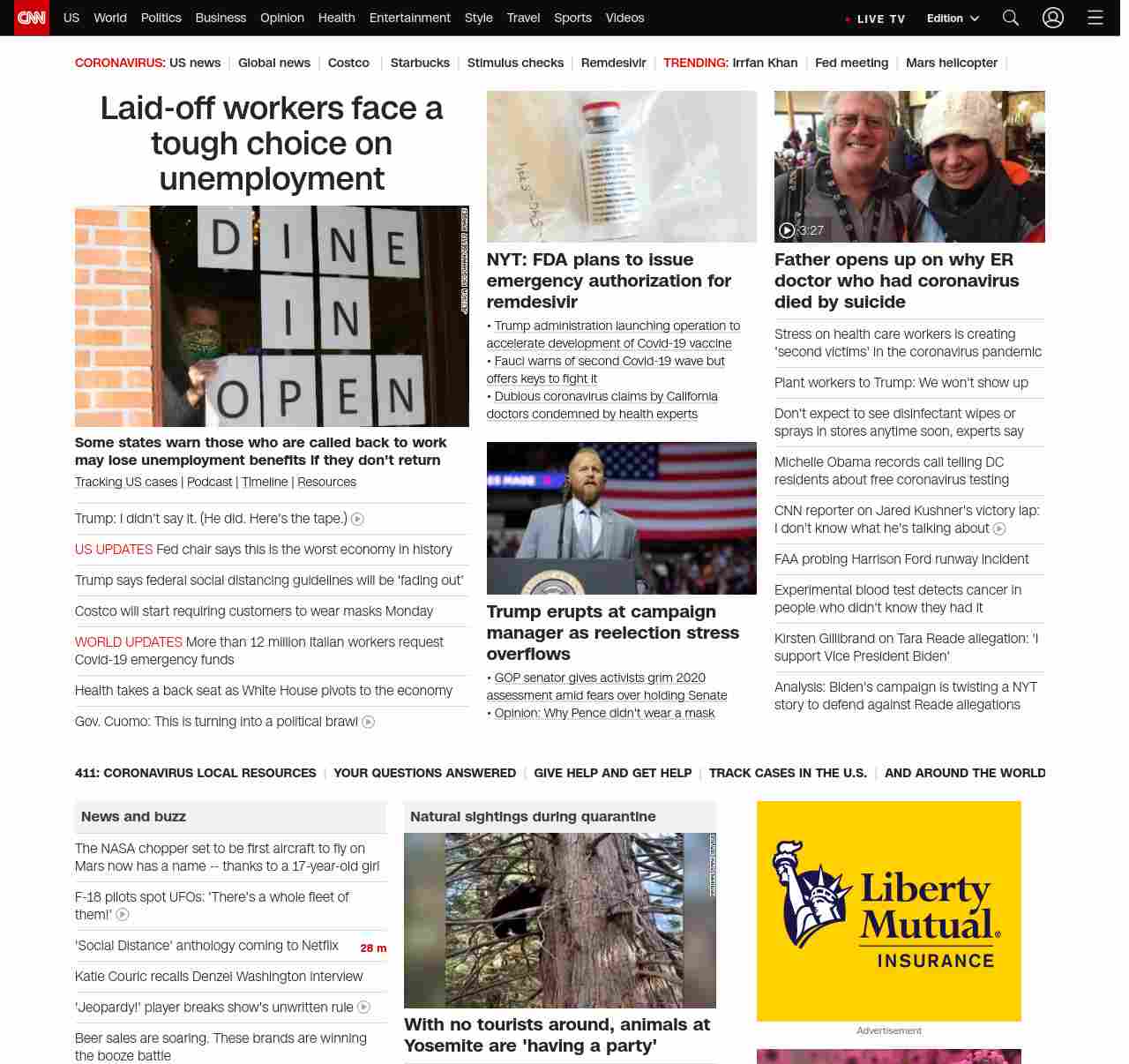 || screaming-banner-text banner-text-size–char-47″ data-analytics=”_list-hierarchical-xs_article_”> Laid-off workers face a tough choice on unemployment ||” , title: “CNN – Breaking News, Latest News and Videos” , siblings: {“articleList”:[{“uri”:”/2020/04/29/politics/states-reopening-unemployment-benefits/index.html”,”headline”:”u003cstrong>Some states warn those who are called back to work may lose unemployment benefits if they don’t returnu003c/strong>”,”thumbnail”:”//cdn.cnn.com/cnnnext/dam/assets/200429105818-02-georgia-reopening-0427-small-11.jpg”,”duration”:””,”description”:”u003ca href=”https://www.cnn.com/interactive/2020/health/coronavirus-us-maps-and-cases/” target=”_blank”>Tracking US casesu003c/a> | u003ca href=”https://www.cnn.com/audio/podcasts/corona-virus” target=”_blank”>Podcastu003c/a> | u003ca href=”https://www.cnn.com/interactive/2020/health/covid19-pandemic-video-timeline/index.html” target=”_blank”>Timelineu003c/a> | u003ca href=”https://www.cnn.com/resources/coronavirus-information” target=”_blank”>Resourcesu003c/a>”,”layout”:””