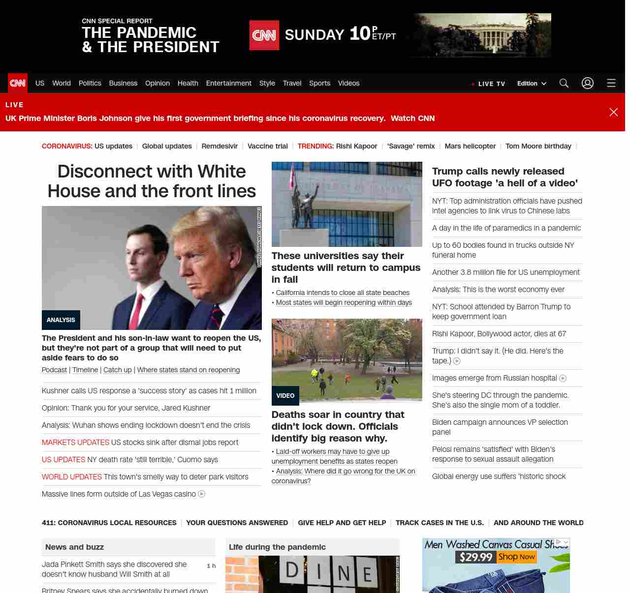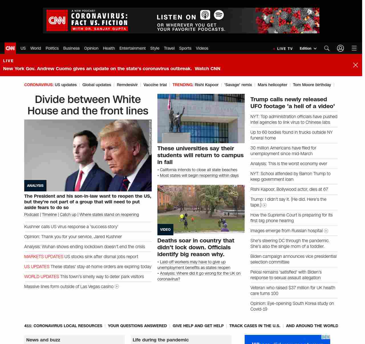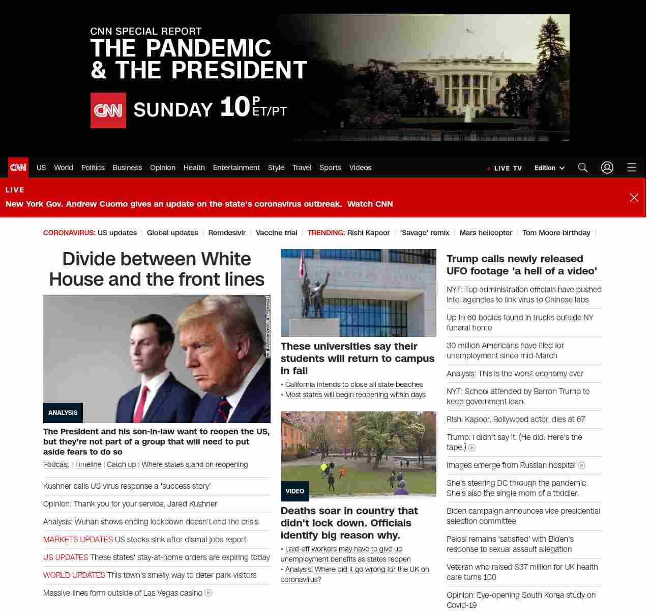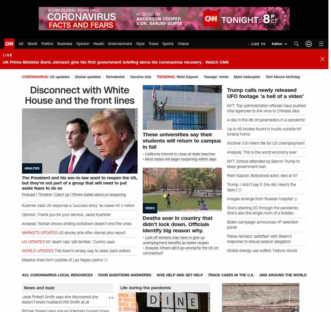 || screaming-banner-text banner-text-size–char-47″ data-analytics=”_list-hierarchical-xs_article_”> Divide between White House and the front lines ||” , title: “CNN – Breaking News, Latest News and Videos” , siblings: {“articleList”:[{“uri”:”/2020/04/30/politics/donald-trump-jared-kushner-economy-coronavirus/index.html”,”headline”:”u003cstrong>The President and his son-in-law want to reopen the US, but they’re not part of a group that will need to put aside fears to do sou003c/strong>”,”thumbnail”:”//cdn.cnn.com/cnnnext/dam/assets/200430104801-02-trump-kushner-0402-small-11.jpg”,”duration”:””,”description”:”u003ca href=”https://www.cnn.com/audio/podcasts/corona-virus” target=”_blank”>Podcastu003c/a> | u003ca href=”https://www.cnn.com/interactive/2020/health/covid19-pandemic-video-timeline/index.html” target=”_blank”>Timelineu003c/a> | u003ca href=”https://www.cnn.com/2020/04/30/world/coronavirus-newsletter-04-30-20-intl/index.html” target=”_blank”>Catch upu003c/a> | u003ca href=”https://www.cnn.com/interactive/2020/us/states-reopen-coronavirus-trnd/” target=”_blank”>Where states stand on reopeningu003c/a>”,”layout”:””