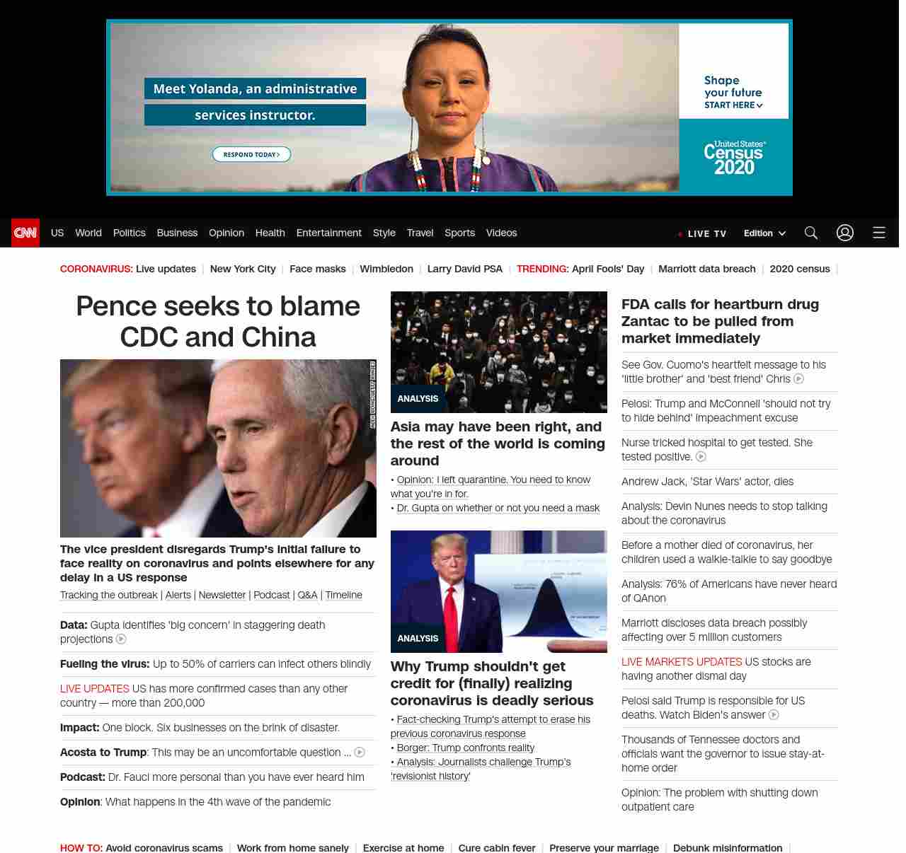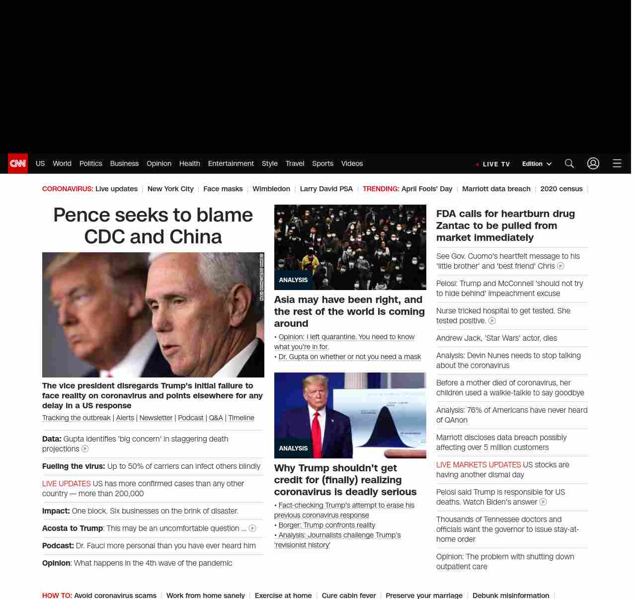 || screaming-banner-text banner-text-size–char-35″ data-analytics=”_list-hierarchical-xs_article_”> Pence seeks to blame CDC and China ||” , title: “CNN – Breaking News, Latest News and Videos” , siblings: {“articleList”:[{“uri”:”/2020/04/01/politics/mike-pence-coronavirus/index.html”,”headline”:”u003cstrong>The vice president disregards Trump’s initial failure to face reality on coronavirus and points elsewhere for any delay in a US responseu003c/strong>”,”thumbnail”:”//cdn.cnn.com/cnnnext/dam/assets/200319121047-01-mike-pence-coronavirus-small-11.jpg”,”duration”:””,”description”:”u003ca href=”https://www.cnn.com/interactive/2020/health/coronavirus-us-maps-and-cases/” target=”_blank”>Tracking the outbreaku003c/a> | u003ca href=”https://www.cnn.com/specials/mobile-apps” target=”_blank”>Alertsu003c/a> | u003ca href=”https://www.cnn.com/specials/coronavirus-newsletter?utm_source=hp&source=hp” target=”_blank”>Newsletteru003c/a> | u003ca href=”https://www.cnn.com/audio/podcasts/corona-virus”>Podcastu003c/a> | u003ca href=”https://www.cnn.com/interactive/2020/health/coronavirus-questions-answers/” target=”_blank”>Q&Au003c/a> | u003ca href=”https://www.cnn.com/2020/02/06/health/wuhan-coronavirus-timeline-fast-facts/index.html” target=”_blank”>Timelineu003c/a> “,”layout”:””