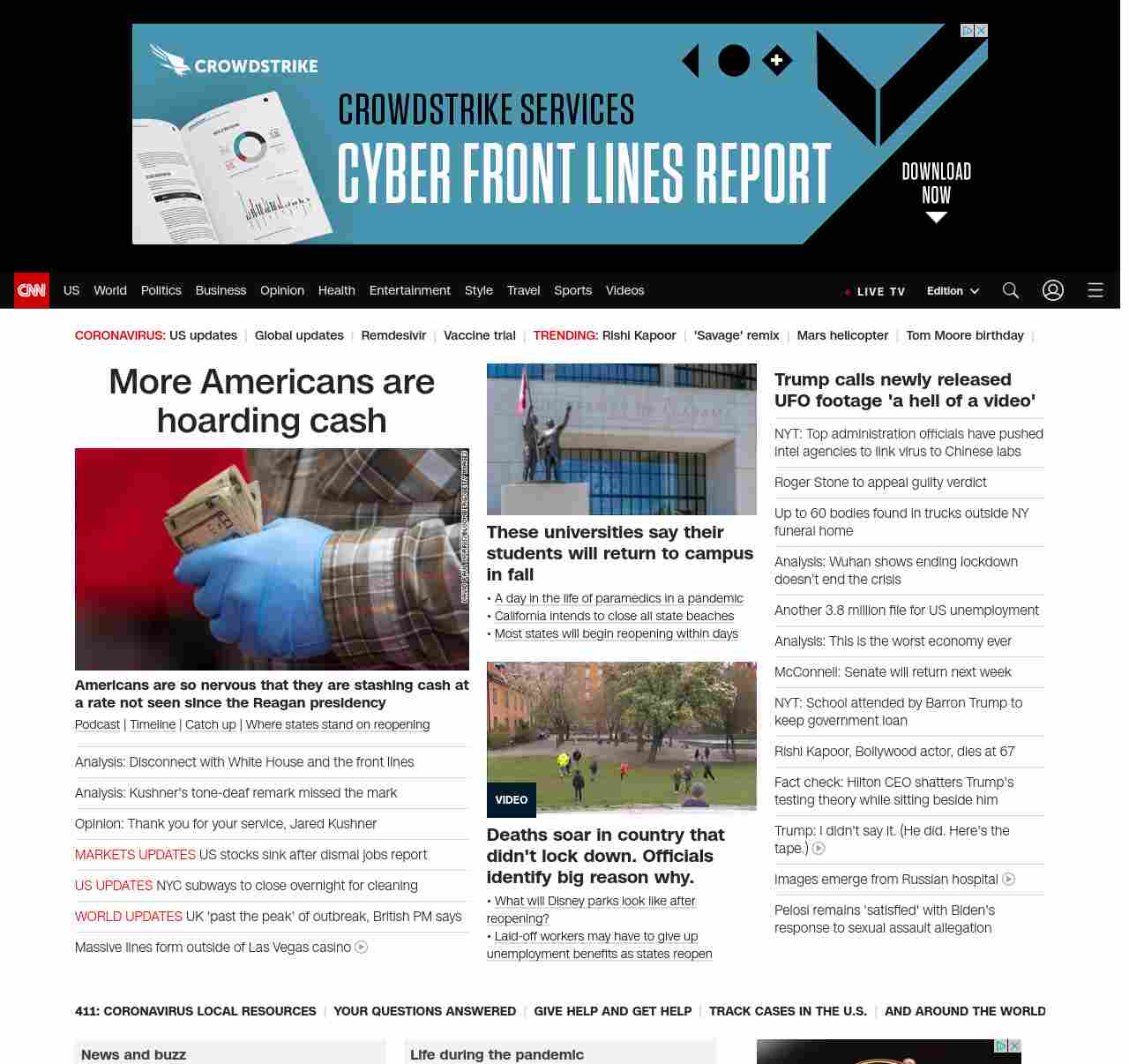 || screaming-banner-text banner-text-size–char-35″ data-analytics=”_list-hierarchical-xs_article_”> More Americans are hoarding cash ||” , title: “CNN – Breaking News, Latest News and Videos” , siblings: {“articleList”:[{“uri”:”/2020/04/30/investing/savings-rate-federal-reserve/index.html”,”headline”:”u003cstrong>Americans are so nervous u003c/strong>u003cstrong>that they are stashing cash at a rate not seen since the Reagan presidencyu003c/strong>”,”thumbnail”:”//cdn.cnn.com/cnnnext/dam/assets/200430094210-personal-savings-restricted-small-11.jpg”,”duration”:””,”description”:”u003ca href=”https://www.cnn.com/audio/podcasts/corona-virus” target=”_blank”>Podcastu003c/a> | u003ca href=”https://www.cnn.com/interactive/2020/health/covid19-pandemic-video-timeline/index.html” target=”_blank”>Timelineu003c/a> | u003ca href=”https://www.cnn.com/2020/04/30/world/coronavirus-newsletter-04-30-20-intl/index.html” target=”_blank”>Catch upu003c/a> | u003ca href=”https://www.cnn.com/interactive/2020/us/states-reopen-coronavirus-trnd/” target=”_blank”>Where states stand on reopeningu003c/a>”,”layout”:””