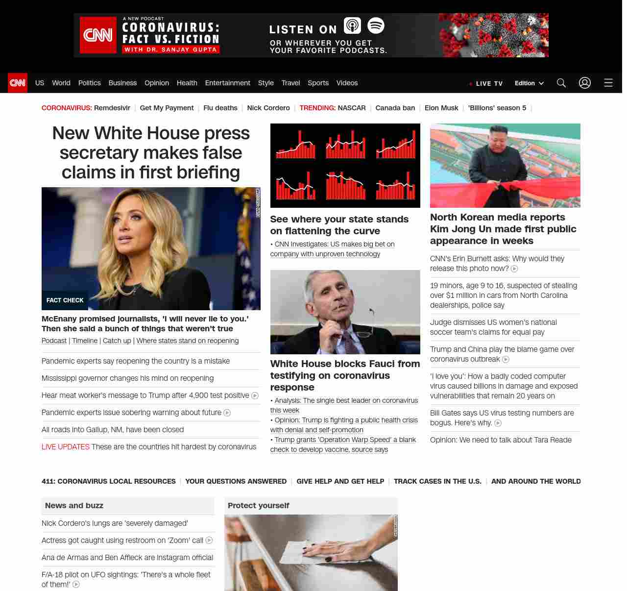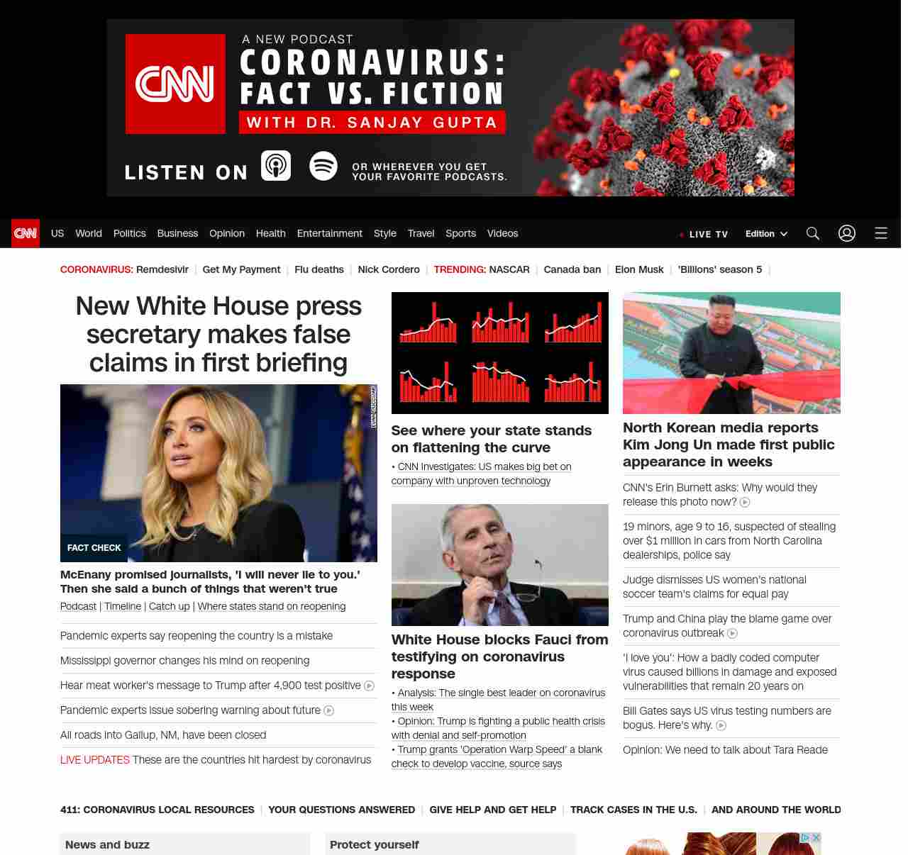 || screaming-banner-text banner-text-size–char-47″ data-analytics=”_list-hierarchical-xs_article_”> New White House press secretary makes false claims in first briefing ||” , title: “CNN – Breaking News, Latest News and Videos” , siblings: {“articleList”:[{“uri”:”/2020/05/01/politics/mcenany-first-briefing-fact-check-may-1/index.html”,”headline”:”u003cstrong>McEnany promised journalists, ‘I will never lie to you.’ Then she said a bunch of things that weren’t trueu003c/strong>”,”thumbnail”:”//cdn.cnn.com/cnnnext/dam/assets/200501141948-03-mcenany-presser-0501-small-11.jpg”,”duration”:””,”description”:”u003ca href=”https://www.cnn.com/audio/podcasts/corona-virus” target=”_blank”>Podcastu003c/a> | u003ca href=”https://www.cnn.com/interactive/2020/health/covid19-pandemic-video-timeline/index.html” target=”_blank”>Timelineu003c/a> | u003ca href=”https://www.cnn.com/2020/05/01/world/coronavirus-newsletter-05-01-20/index.html” target=”_blank”>Catch upu003c/a> | u003ca href=”https://www.cnn.com/interactive/2020/us/states-reopen-coronavirus-trnd/” target=”_blank”>Where states stand on reopeningu003c/a>”,”layout”:””
