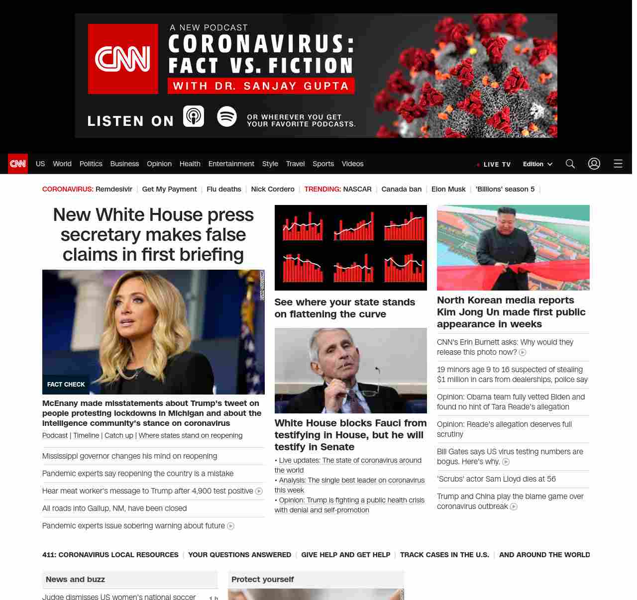 || screaming-banner-text banner-text-size–char-47″ data-analytics=”_list-hierarchical-xs_article_”> New White House press secretary makes false claims in first briefing ||” , title: “CNN – Breaking News, Latest News and Videos” , siblings: {“articleList”:[{“uri”:”/2020/05/01/politics/mcenany-first-briefing-fact-check-may-1/index.html”,”headline”:”u003cstrong>McEnany made misstatements about Trump’s tweet on people protesting lockdowns in Michigan and about the intelligence community’s stance on coronavirusu003c/strong>”,”thumbnail”:”//cdn.cnn.com/cnnnext/dam/assets/200501141948-03-mcenany-presser-0501-small-11.jpg”,”duration”:””,”description”:”u003ca href=”https://www.cnn.com/audio/podcasts/corona-virus” target=”_blank”>Podcastu003c/a> | u003ca href=”https://www.cnn.com/interactive/2020/health/covid19-pandemic-video-timeline/index.html” target=”_blank”>Timelineu003c/a> | u003ca href=”https://www.cnn.com/2020/05/01/world/coronavirus-newsletter-05-01-20/index.html” target=”_blank”>Catch upu003c/a> | u003ca href=”https://www.cnn.com/interactive/2020/us/states-reopen-coronavirus-trnd/” target=”_blank”>Where states stand on reopeningu003c/a>”,”layout”:””