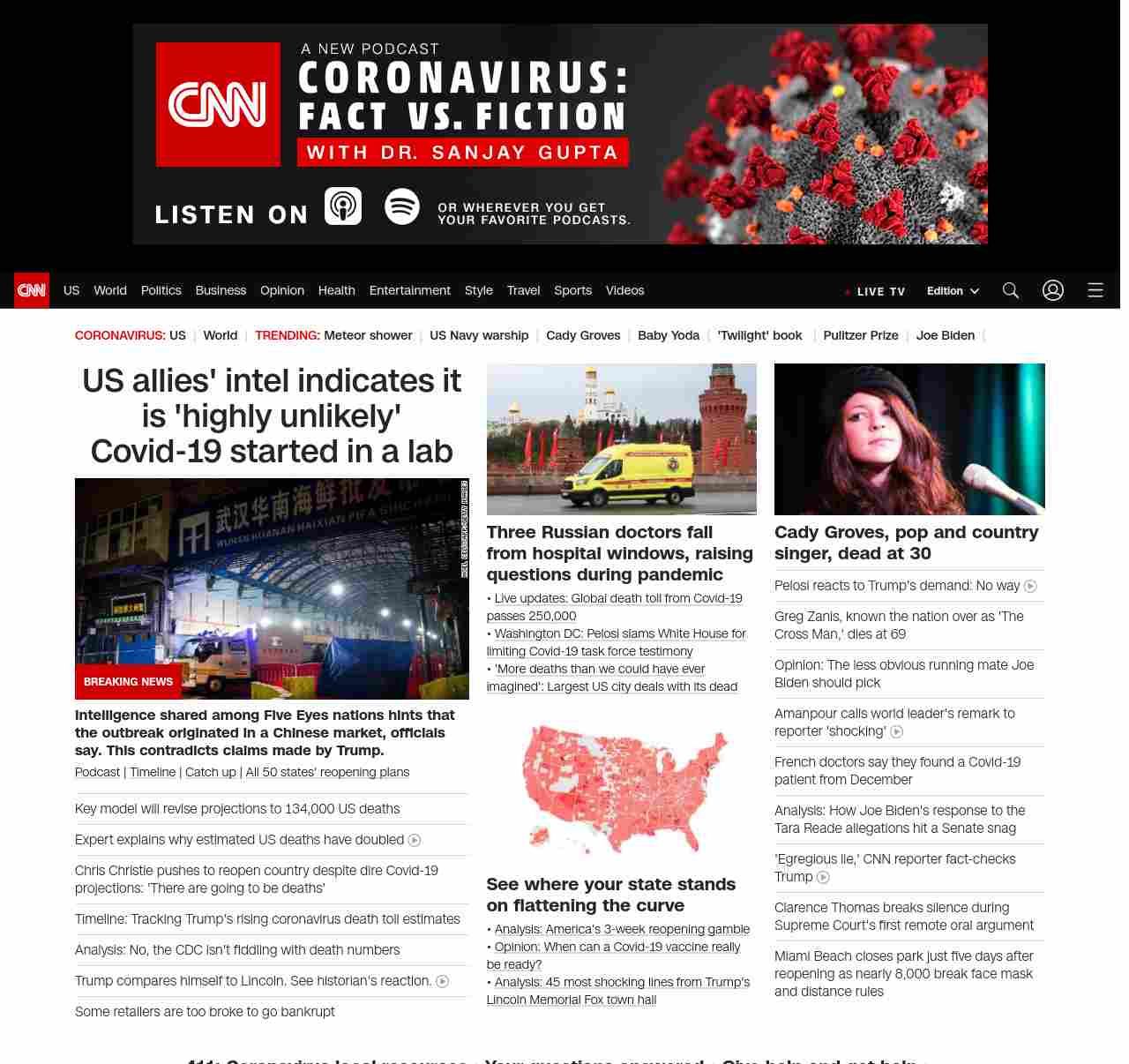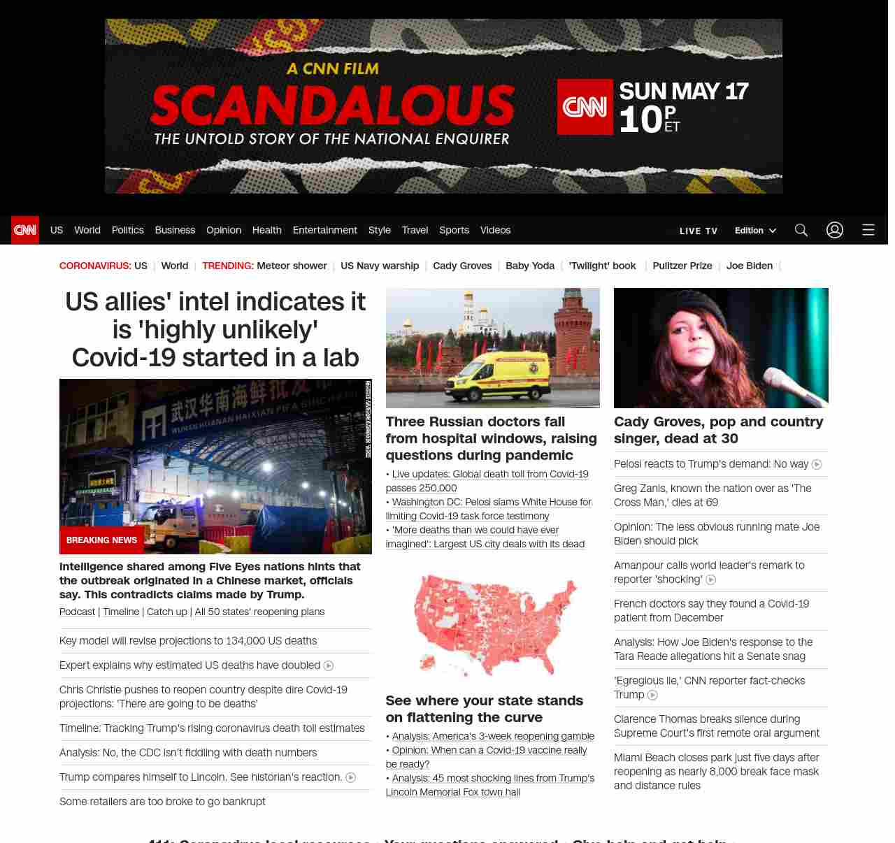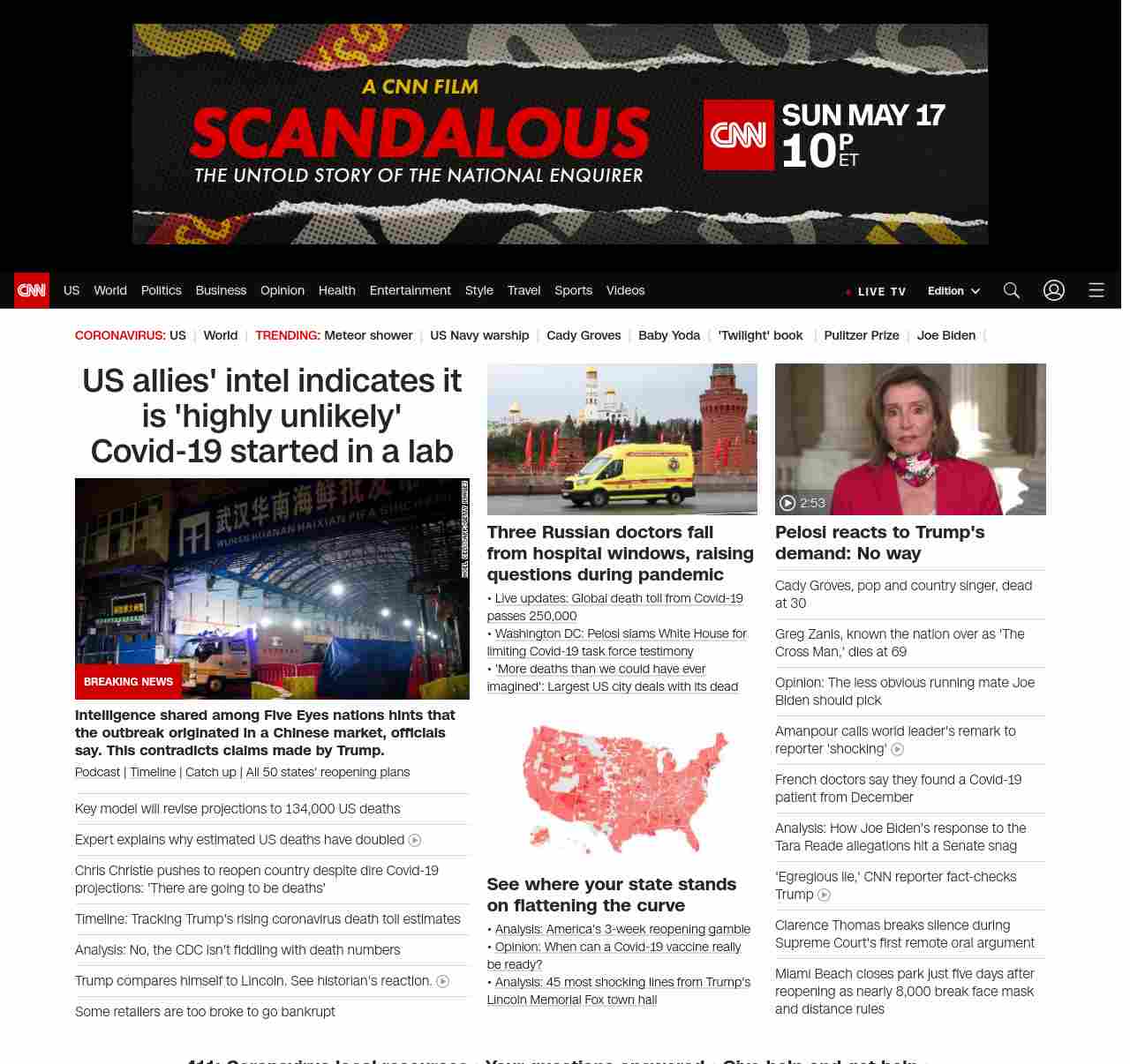|| screaming-banner-text banner-text-size–char-47″ data-analytics=”_list-hierarchical-xs_article_”> US allies’ intel indicates it is ‘highly unlikely’ Covid-19 started in a lab ||” , title: “CNN – Breaking News, Latest News and Videos” , siblings: {“articleList”:[{“uri”:”/2020/05/04/politics/coronavirus-intelligence/index.html”,”headline”:”u003cstrong>Intelligence shared among Five Eyes nations hints that the outbreak originated in a Chinese market, officials say. This contradicts claims made by Trump.u003c/strong>”,”thumbnail”:”//cdn.cnn.com/cnnnext/dam/assets/200127165502-wuhan-seafood-market-jan-11-small-11.jpg”,”duration”:””,”description”:”u003ca href=”https://www.cnn.com/audio/podcasts/corona-virus” target=”_blank”>Podcastu003c/a> | u003ca href=”https://www.cnn.com/interactive/2020/health/covid19-pandemic-video-timeline/index.html” target=”_blank”>Timelineu003c/a> | u003ca href=”https://www.cnn.com/2020/05/04/world/coronavirus-newsletter-05-04-20-intl/index.html” target=”_blank”>Catch upu003c/a> | u003ca href=”https://www.cnn.com/interactive/2020/us/states-reopen-coronavirus-trnd/” target=”_blank”>All 50 states’ reopening plansu003c/a>”,”layout”:””