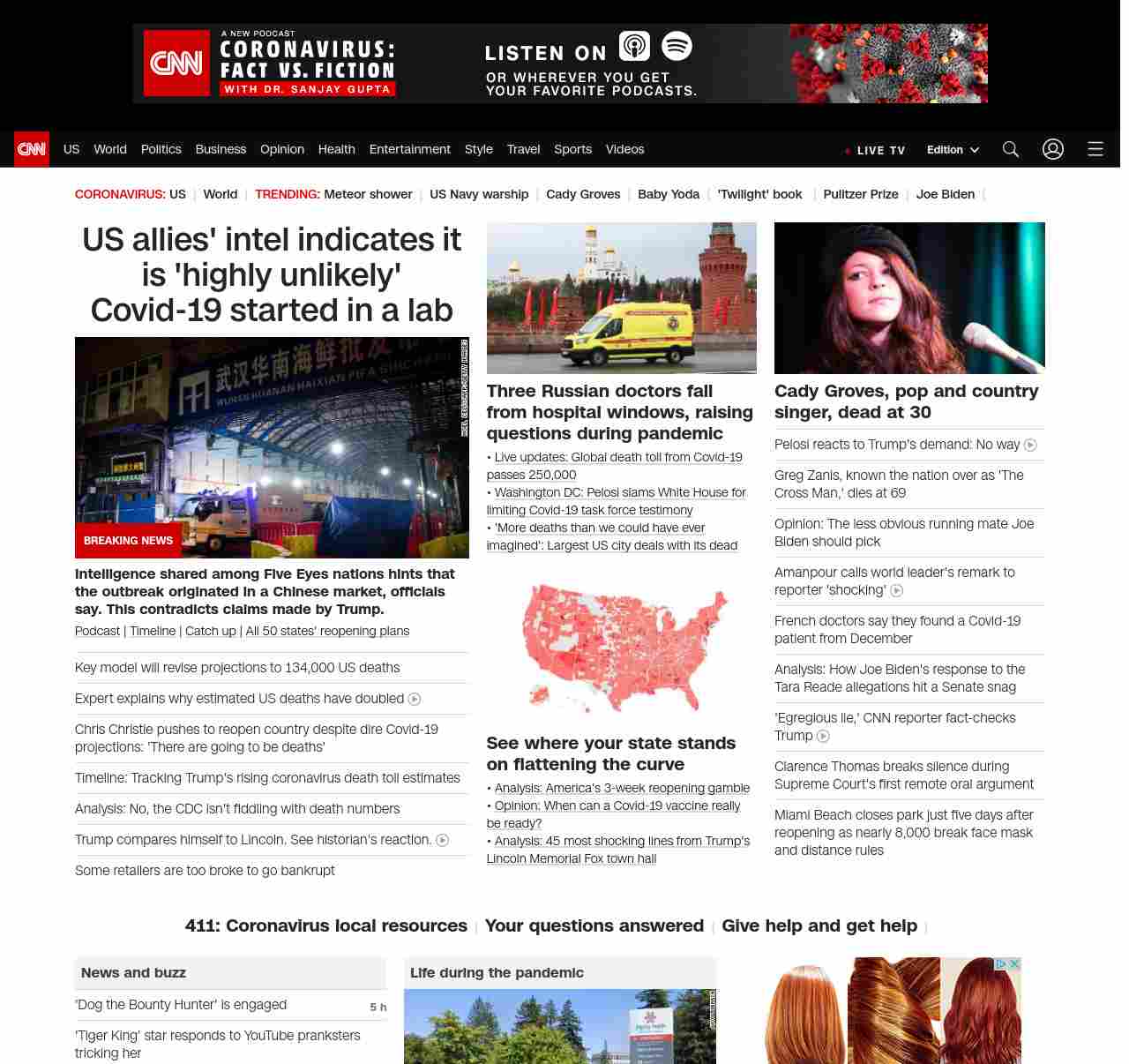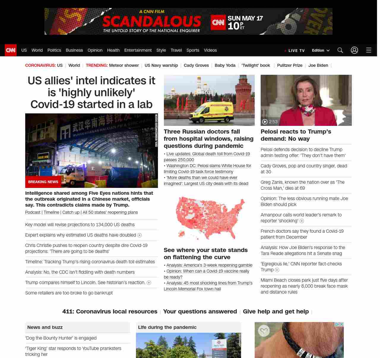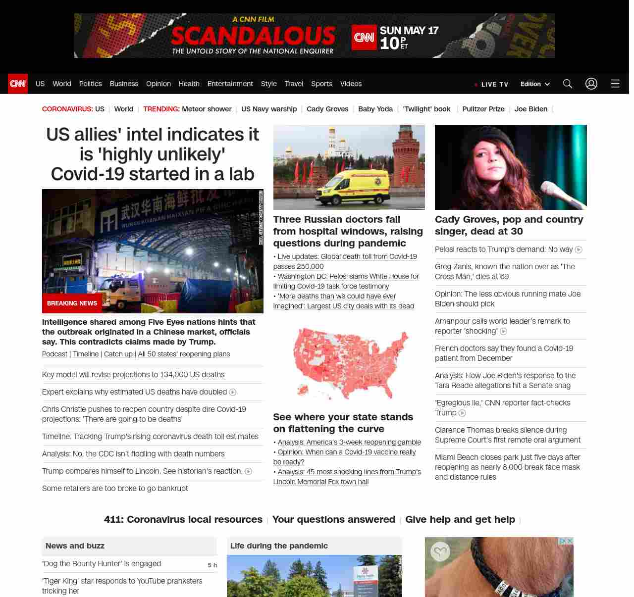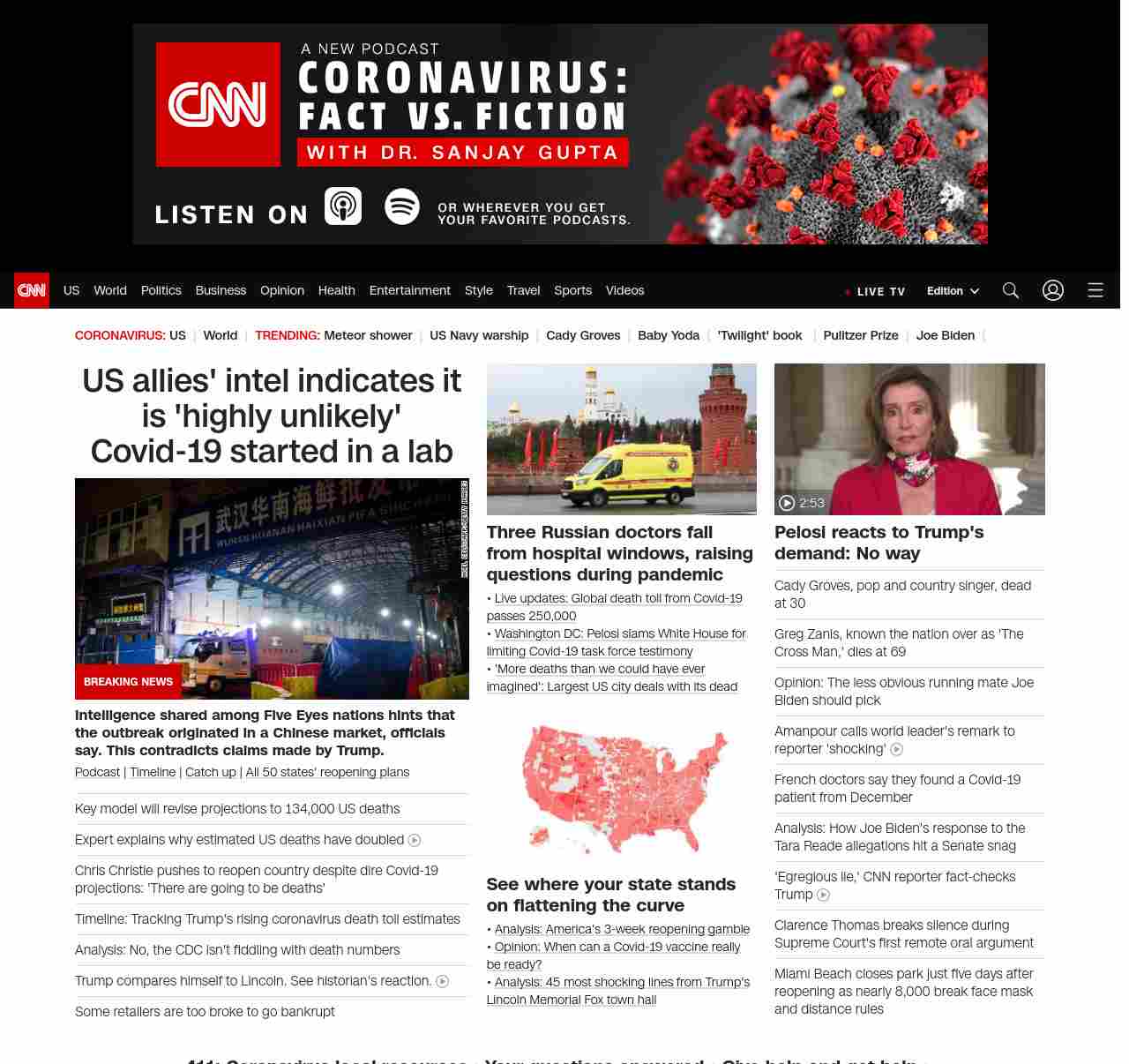 || screaming-banner-text banner-text-size–char-47″ data-analytics=”_list-hierarchical-xs_article_”> US allies’ intel indicates it is ‘highly unlikely’ Covid-19 started in a lab ||” , title: “CNN – Breaking News, Latest News and Videos” , siblings: {“articleList”:[{“uri”:”/2020/05/04/politics/coronavirus-intelligence/index.html”,”headline”:”u003cstrong>Intelligence shared among Five Eyes nations hints that the outbreak originated in a Chinese market, officials say. This contradicts claims made by Trump.u003c/strong>”,”thumbnail”:”//cdn.cnn.com/cnnnext/dam/assets/200127165502-wuhan-seafood-market-jan-11-small-11.jpg”,”duration”:””,”description”:”u003ca href=”https://www.cnn.com/audio/podcasts/corona-virus” target=”_blank”>Podcastu003c/a> | u003ca href=”https://www.cnn.com/interactive/2020/health/covid19-pandemic-video-timeline/index.html” target=”_blank”>Timelineu003c/a> | u003ca href=”https://www.cnn.com/2020/05/04/world/coronavirus-newsletter-05-04-20-intl/index.html” target=”_blank”>Catch upu003c/a> | u003ca href=”https://www.cnn.com/interactive/2020/us/states-reopen-coronavirus-trnd/” target=”_blank”>All 50 states’ reopening plansu003c/a>”,”layout”:””