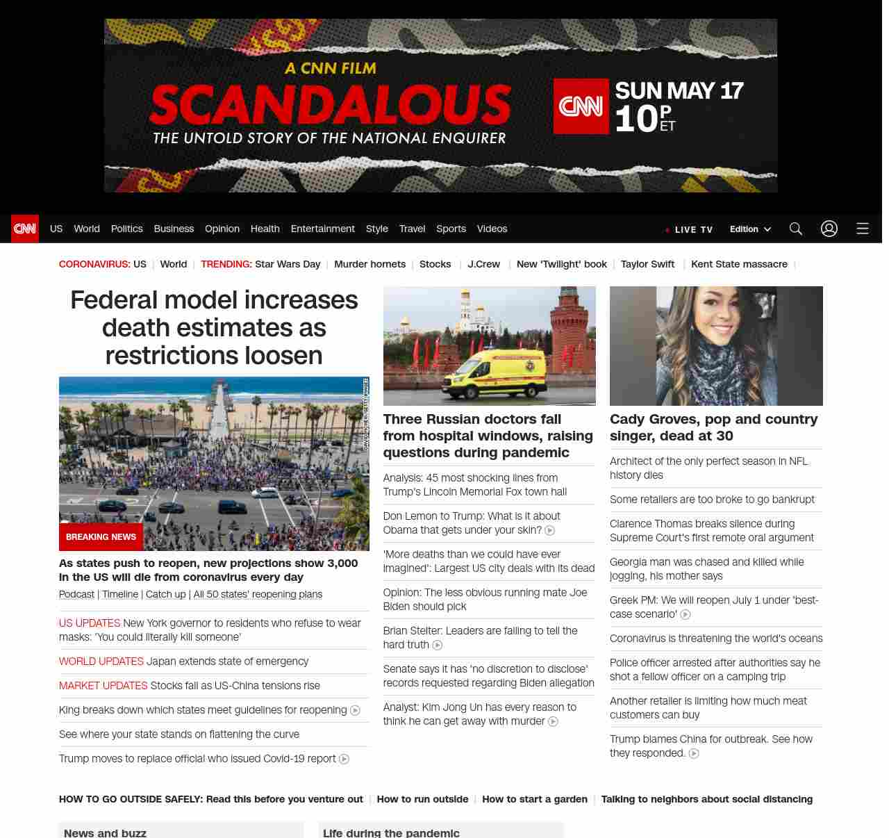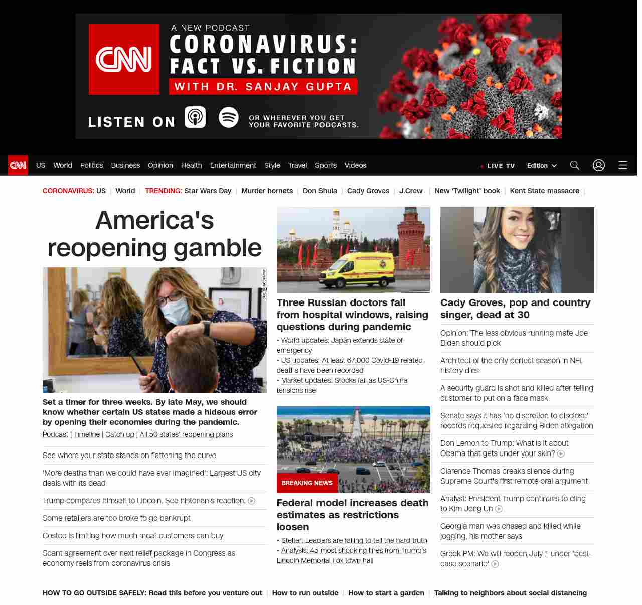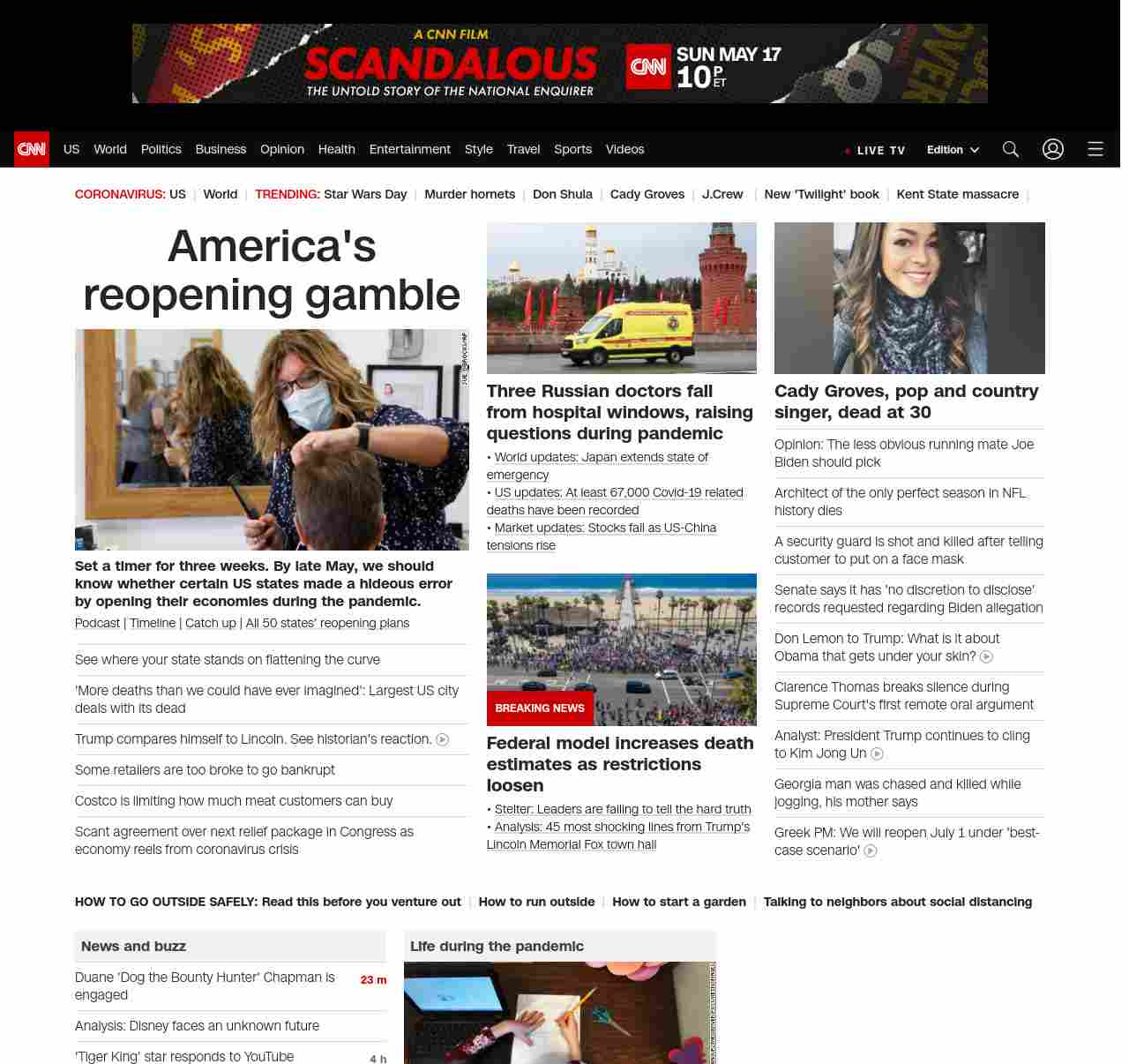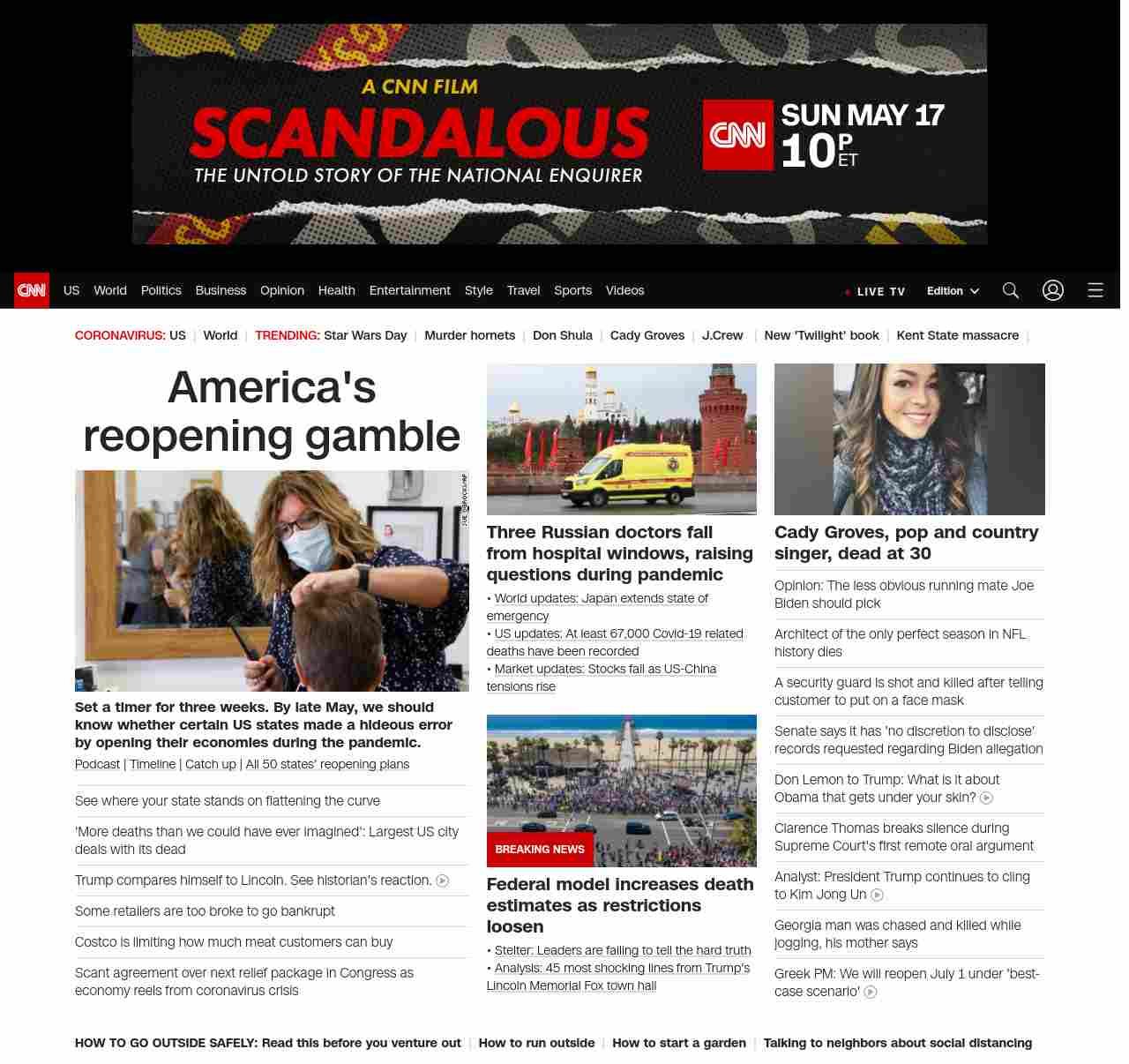 || screaming-banner-text banner-text-size–char-29″ data-analytics=”_list-hierarchical-xs_article_”> America’s reopening gamble ||” , title: “CNN – Breaking News, Latest News and Videos” , siblings: {“articleList”:[{“uri”:”/2020/05/03/us/coronavirus-funerals-bodies/index.html”,”headline”:”‘More deaths than we could have ever imagined’: Largest US city deals with its dead”,”thumbnail”:”//cdn.cnn.com/cnnnext/dam/assets/200503175252-01-new-york-funeral-homes-small-11.jpg”,”duration”:””,”description”:””,”layout”:””