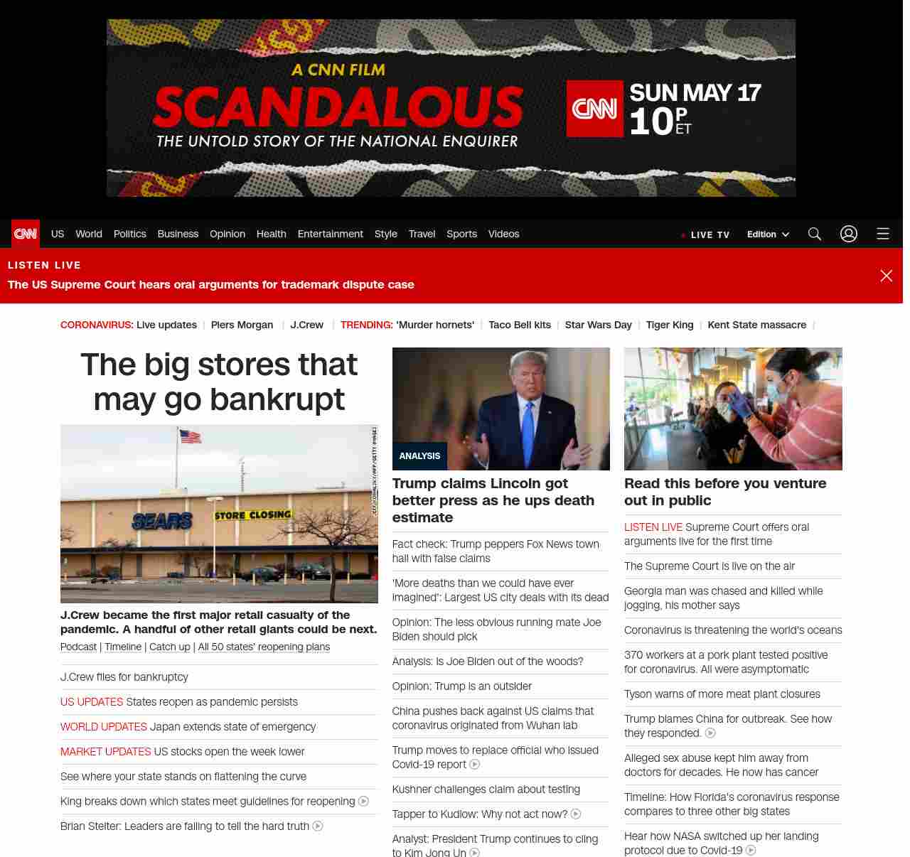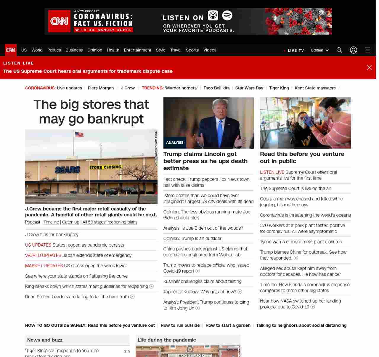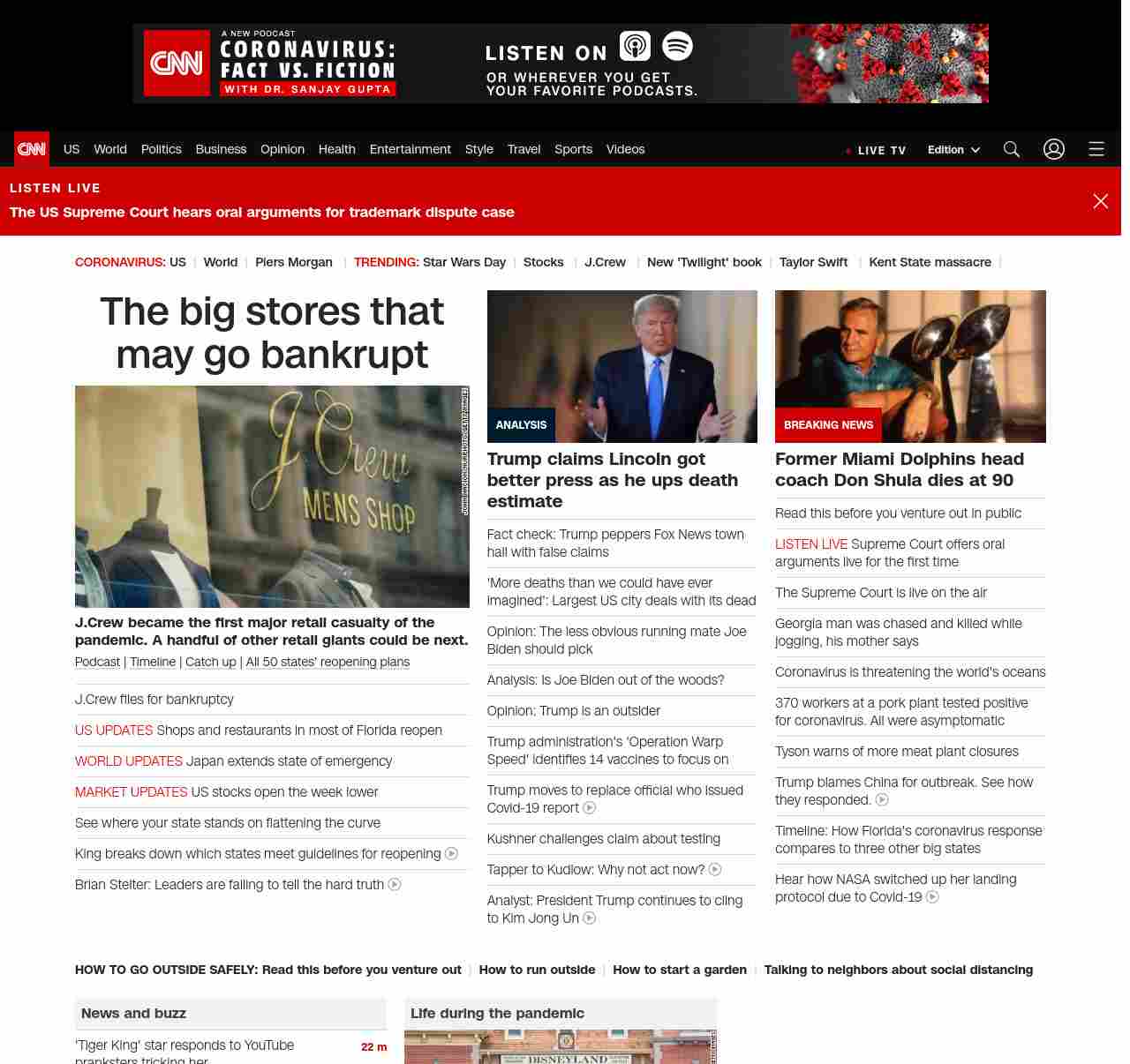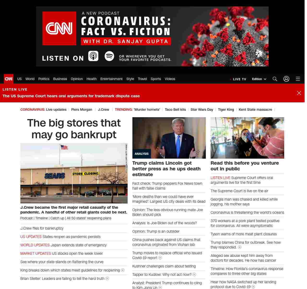 || screaming-banner-text banner-text-size–char-47″ data-analytics=”_list-hierarchical-xs_article_”> Trump claims Lincoln got better press as he ups Covid-19 death estimate ||” , title: “CNN – Breaking News, Latest News and Videos” , siblings: {“articleList”:[{“uri”:”/2020/05/04/business/j-crew-bankruptcy-jcpenney-sears-neiman-marcus-retailers-coronavirus/index.html”,”headline”:”u003cstrong>J.Crew became the first major retail casualty of the pandemic. A handful of other retail giants could be next.u003c/strong>”,”thumbnail”:”//cdn.cnn.com/cnnnext/dam/assets/200406163628-sears-store-closing-0326-small-11.jpg”,”duration”:””,”description”:”u003ca href=”https://www.cnn.com/audio/podcasts/corona-virus” target=”_blank”>Podcastu003c/a> | u003ca href=”https://www.cnn.com/interactive/2020/health/covid19-pandemic-video-timeline/index.html” target=”_blank”>Timelineu003c/a> | u003ca href=”https://www.cnn.com/2020/05/04/world/coronavirus-newsletter-05-04-20-intl/index.html” target=”_blank”>Catch upu003c/a> | u003ca href=”https://www.cnn.com/interactive/2020/us/states-reopen-coronavirus-trnd/” target=”_blank”>All 50 states’ reopening plansu003c/a>”,”layout”:””