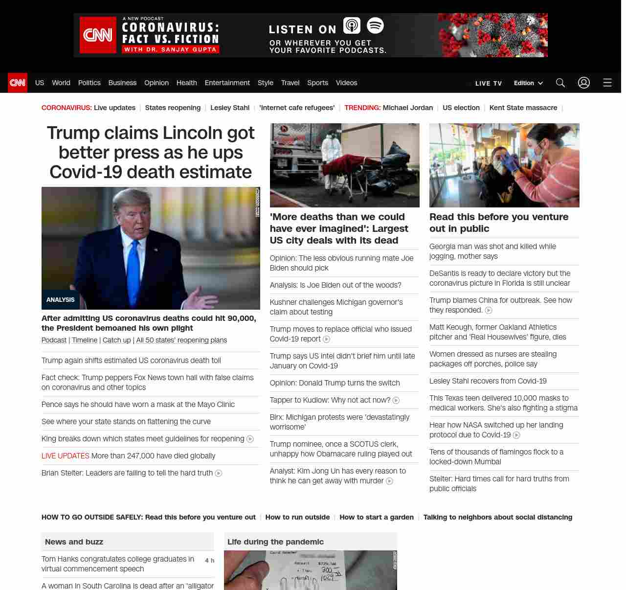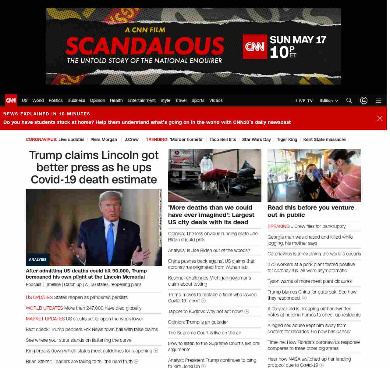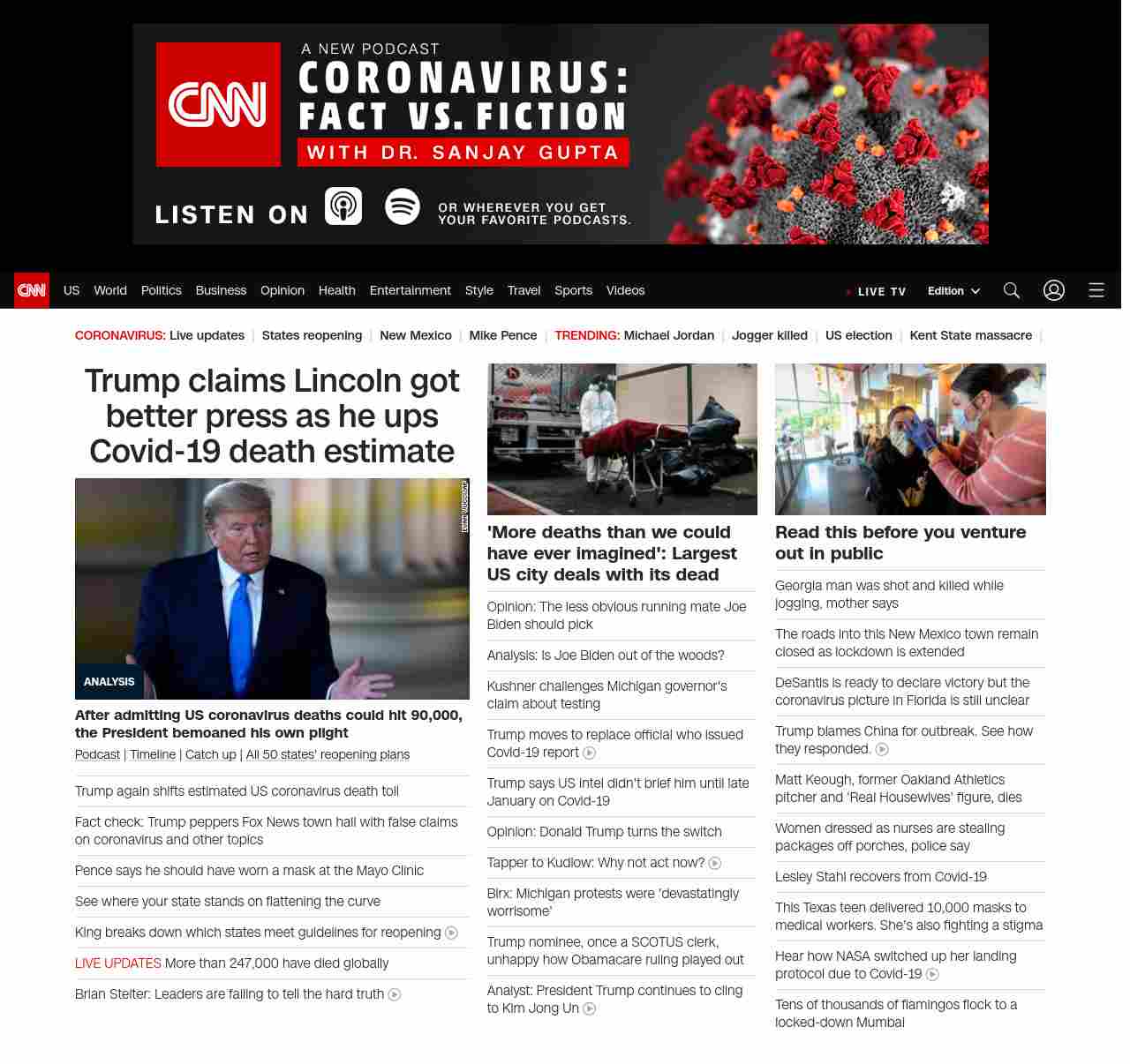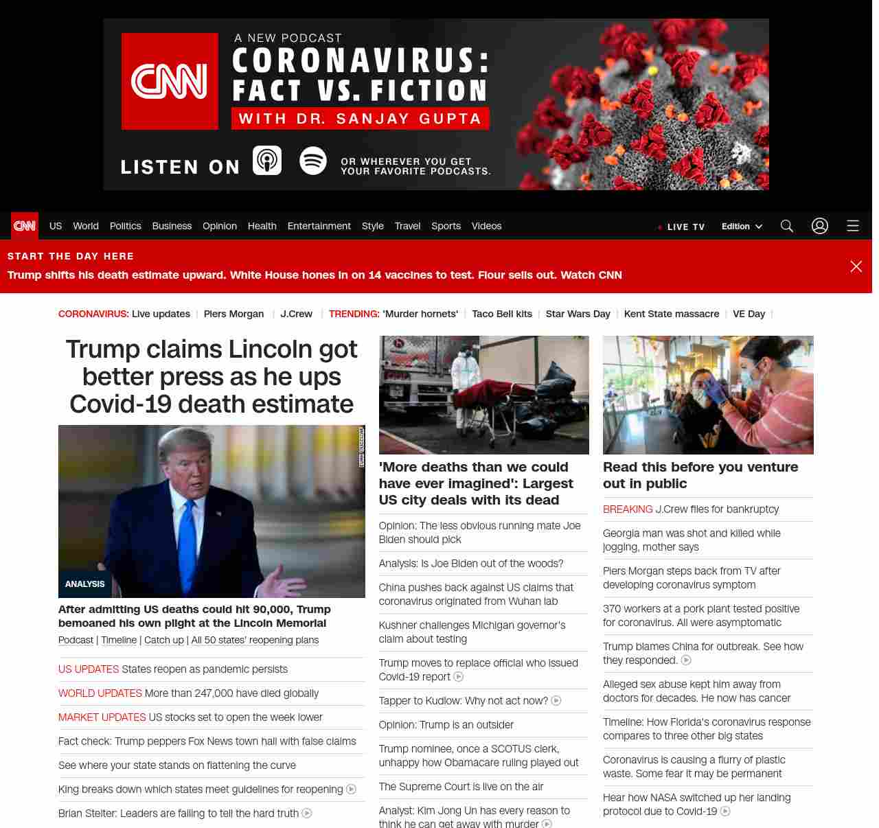 || screaming-banner-text banner-text-size–char-47″ data-analytics=”_list-hierarchical-xs_article_”> Trump claims Lincoln got better press as he ups Covid-19 death estimate ||” , title: “CNN – Breaking News, Latest News and Videos” , siblings: {“articleList”:[{“uri”:”/2020/05/04/politics/trump-lincoln-press-treatment-deaths/index.html”,”headline”:”u003cstrong>After admitting US deaths could hit 90,000, Trump bemoaned his own plight at the Lincoln Memorialu003c/strong>”,”thumbnail”:”//cdn.cnn.com/cnnnext/dam/assets/200504090717-05-trump-fox-town-hall-restricted-small-11.jpg”,”duration”:””,”description”:”u003ca href=”https://www.cnn.com/audio/podcasts/corona-virus” target=”_blank”>Podcastu003c/a> | u003ca href=”https://www.cnn.com/interactive/2020/health/covid19-pandemic-video-timeline/index.html” target=”_blank”>Timelineu003c/a> | u003ca href=”https://www.cnn.com/2020/05/04/world/coronavirus-newsletter-05-04-20-intl/index.html” target=”_blank”>Catch upu003c/a> | u003ca href=”https://www.cnn.com/interactive/2020/us/states-reopen-coronavirus-trnd/” target=”_blank”>All 50 states’ reopening plansu003c/a>”,”layout”:””