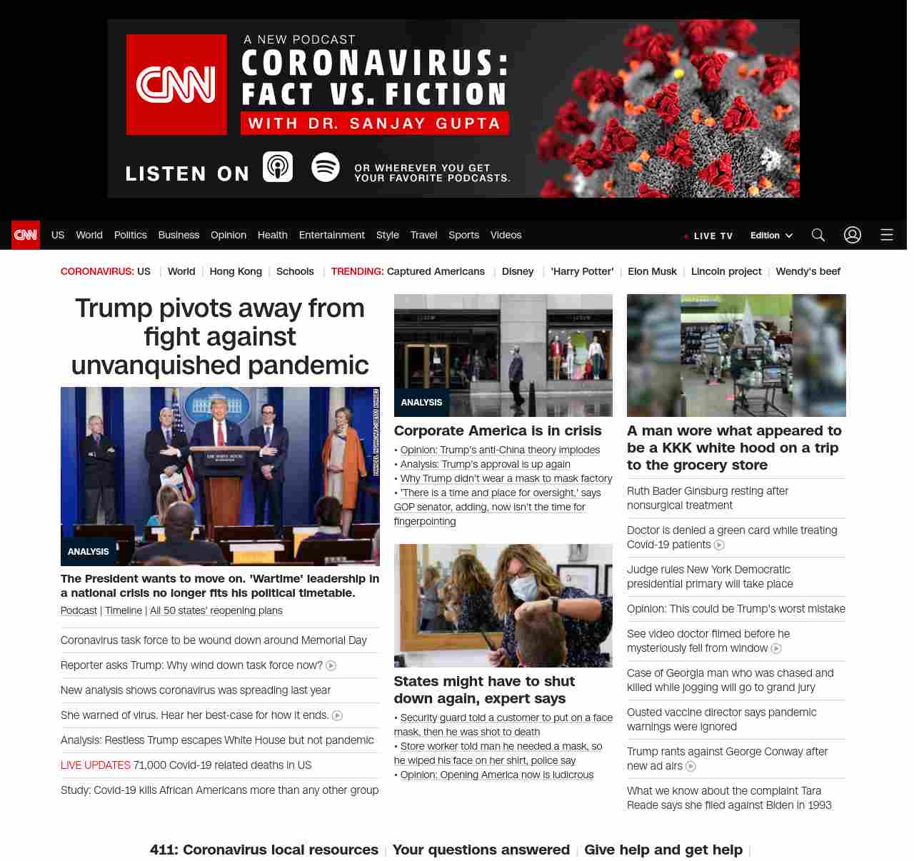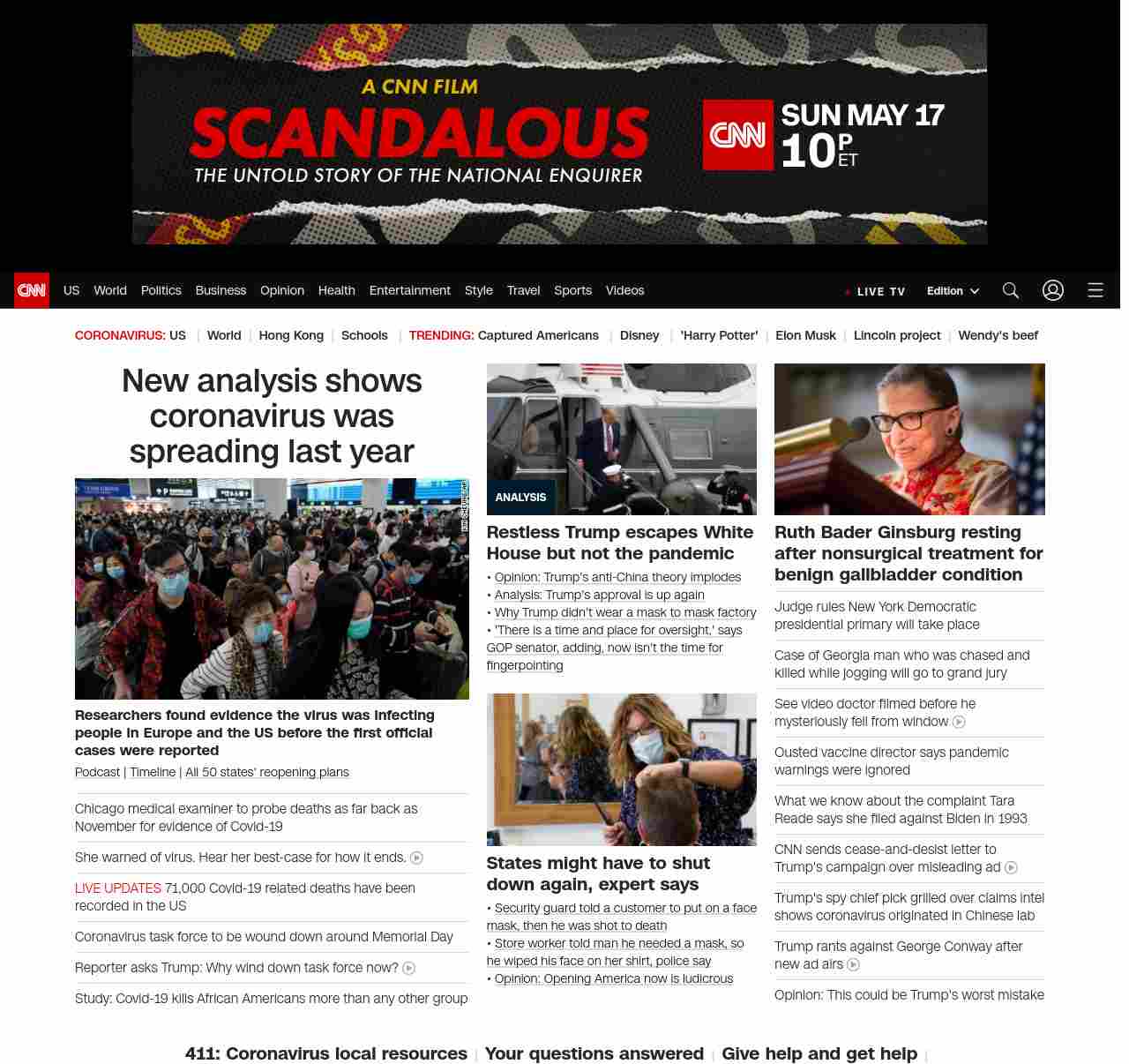 || screaming-banner-text banner-text-size–char-47″ data-analytics=”_list-hierarchical-xs_hyperlink_”> New analysis shows coronavirus was spreading last year ||” , title: “CNN – Breaking News, Latest News and Videos” , siblings: {“articleList”:[{“uri”:”/2020/05/06/politics/donald-trump-coronavirus/index.html”,”headline”:”u003cstrong>The President wants to move on. ‘Wartime’ leadership in a national crisis no longer fits his political timetable.u003c/strong>”,”thumbnail”:”//cdn.cnn.com/cnnnext/dam/assets/200505150639-02-coronavirus-task-force-briefing-0325-small-11.jpg”,”duration”:””,”description”:”u003ca href=”https://www.cnn.com/audio/podcasts/corona-virus” target=”_blank”>Podcastu003c/a> | u003ca href=”https://www.cnn.com/interactive/2020/health/covid19-pandemic-video-timeline/index.html” target=”_blank”>Timelineu003c/a> | u003ca href=”https://www.cnn.com/interactive/2020/us/states-reopen-coronavirus-trnd/” target=”_blank”>All 50 states’ reopening plansu003c/a>”,”layout”:””