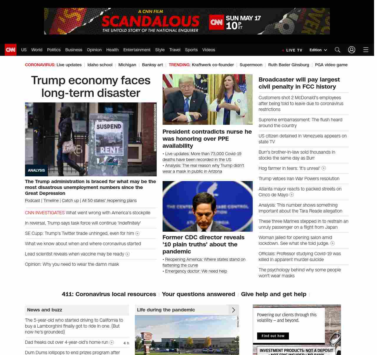 || screaming-banner-text banner-text-size–char-41″ data-analytics=”_list-hierarchical-xs_article_”> Trump economy faces long-term disaster ||” , title: “CNN – Breaking News, Latest News and Videos” , siblings: {“articleList”:[{“uri”:”/2020/05/07/politics/donald-trump-coronavirus-economy/index.html”,”headline”:”u003cstrong>The Trump administration is braced for what may be the most disastrous unemployment numbers since the Great Depressionu003c/strong>”,”thumbnail”:”//cdn.cnn.com/cnnnext/dam/assets/200506205742-07-april-jobs-report-2020-restricted-small-11.jpg”,”duration”:””,”description”:”u003ca href=”https://www.cnn.com/audio/podcasts/corona-virus” target=”_blank”>Podcastu003c/a> | u003ca href=”https://www.cnn.com/interactive/2020/health/covid19-pandemic-video-timeline/index.html” target=”_blank”>Timelineu003c/a> | u003ca href=”https://www.cnn.com/2020/05/06/world/coronavirus-newsletter-05-06-20-intl/index.html” target=”_blank”>Catch upu003c/a> | u003ca href=”https://www.cnn.com/interactive/2020/us/states-reopen-coronavirus-trnd/” target=”_blank”>All 50 states’ reopening plansu003c/a>”,”layout”:””