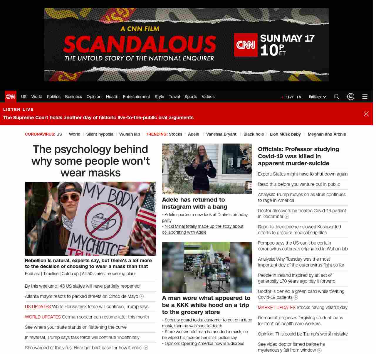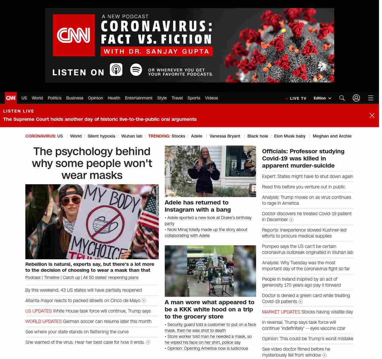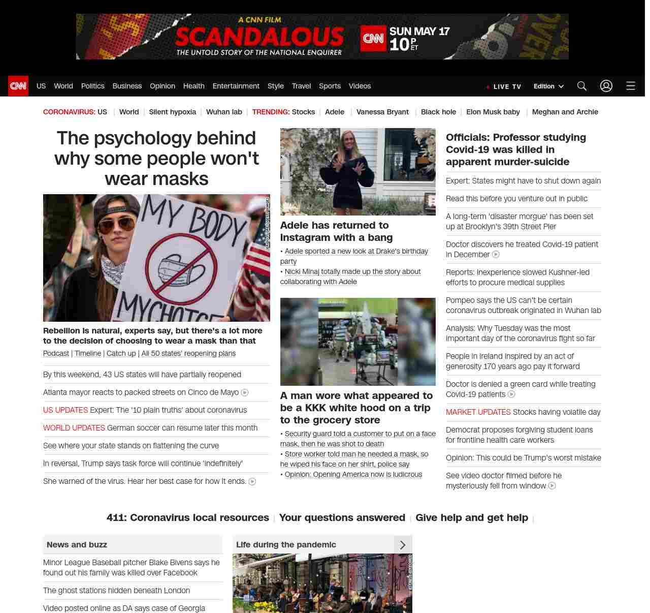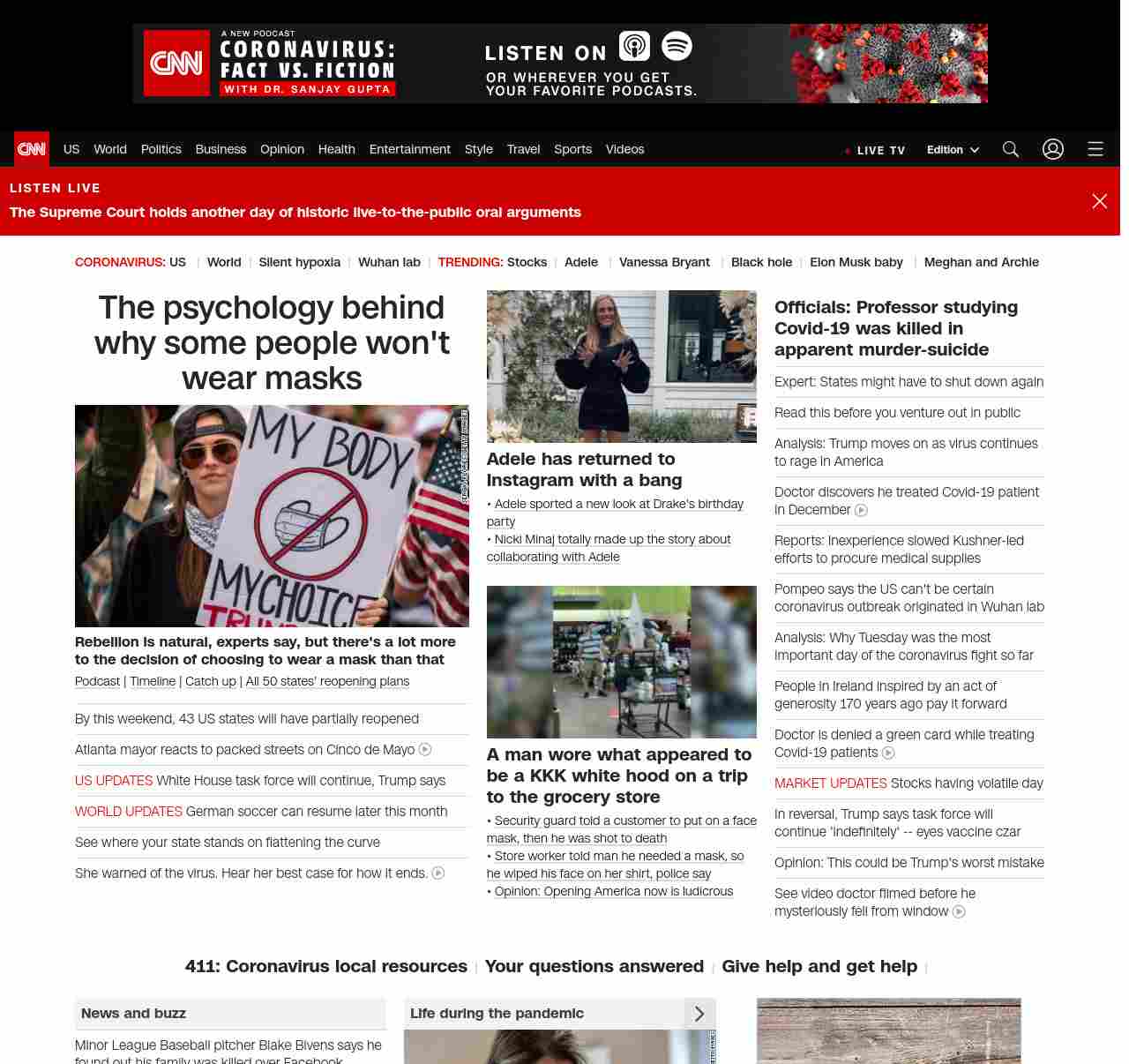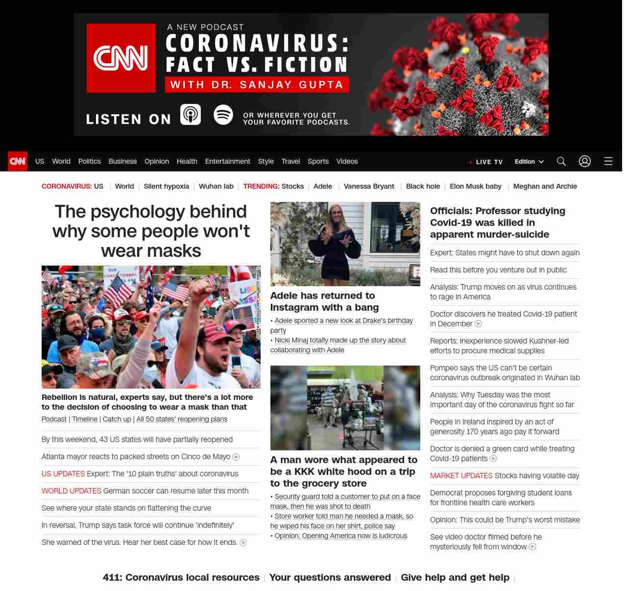 || screaming-banner-text banner-text-size–char-47″ data-analytics=”_list-hierarchical-xs_article_”> The psychology behind why some people won’t wear masks ||” , title: “CNN – Breaking News, Latest News and Videos” , siblings: {“articleList”:[{“uri”:”/2020/05/06/health/why-people-dont-wear-masks-wellness-trnd/index.html”,”headline”:”u003cstrong>Rebellion is natural, experts say, but there’s a lot more to the decision of choosing to wear a mask than thatu003c/strong>”,”thumbnail”:”//cdn.cnn.com/cnnnext/dam/assets/200506113757-01-coronavirus-protest-boston-0504-small-11.jpg”,”duration”:””,”description”:”u003ca href=”https://www.cnn.com/audio/podcasts/corona-virus” target=”_blank”>Podcastu003c/a> | u003ca href=”https://www.cnn.com/interactive/2020/health/covid19-pandemic-video-timeline/index.html” target=”_blank”>Timelineu003c/a> | u003ca href=”https://www.cnn.com/2020/05/06/world/coronavirus-newsletter-05-06-20-intl/index.html” target=”_blank”>Catch upu003c/a> | u003ca href=”https://www.cnn.com/interactive/2020/us/states-reopen-coronavirus-trnd/” target=”_blank”>All 50 states’ reopening plansu003c/a>”,”layout”:””