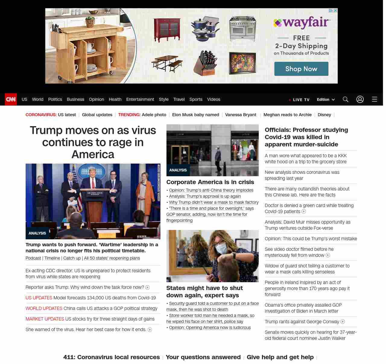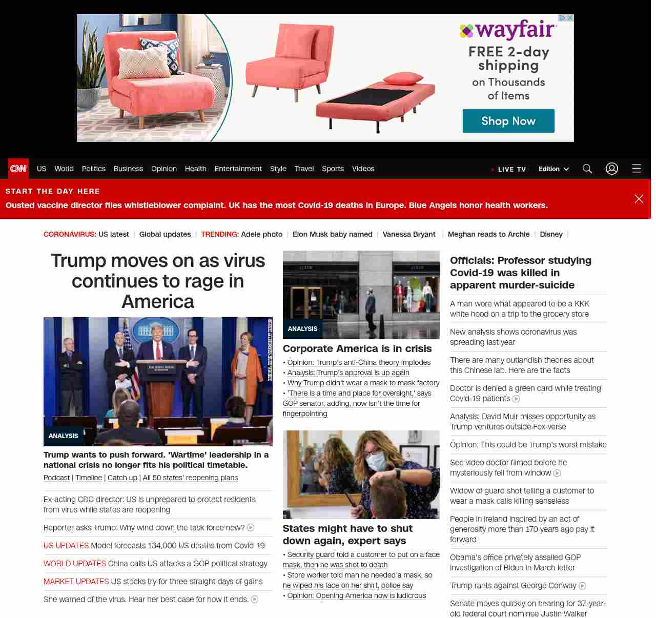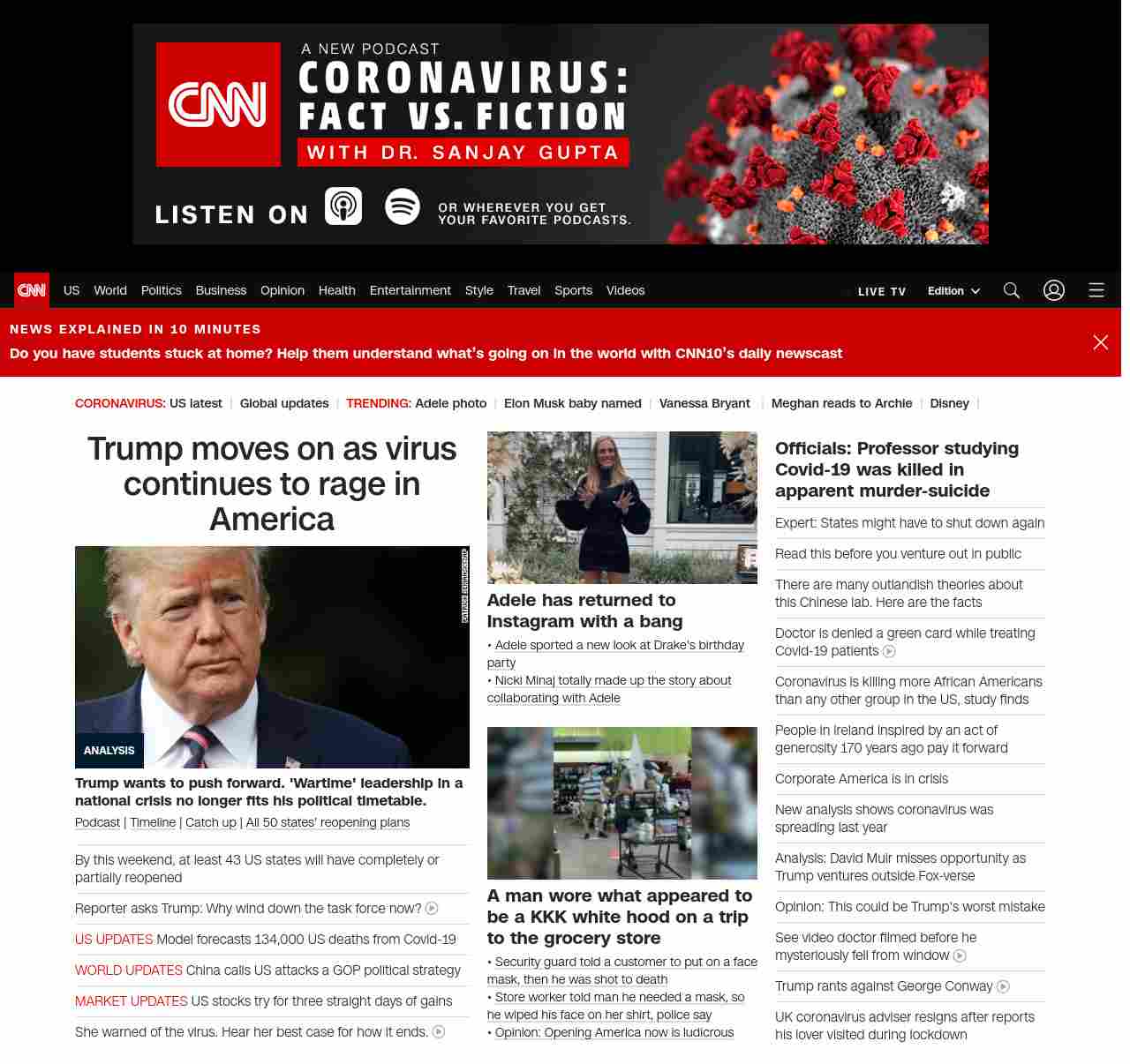 || screaming-banner-text banner-text-size–char-47″ data-analytics=”_list-hierarchical-xs_article_”> Trump moves on as virus continues to rage in America ||” , title: “CNN – Breaking News, Latest News and Videos” , siblings: {“articleList”:[{“uri”:”/2020/05/06/politics/donald-trump-coronavirus/index.html”,”headline”:”u003cstrong>Trump wants to push forward. ‘Wartime’ leadership in a national crisis no longer fits his political timetable.u003c/strong>”,”thumbnail”:”//cdn.cnn.com/cnnnext/dam/assets/200505144723-04-trump-0505-small-11.jpg”,”duration”:””,”description”:”u003ca href=”https://www.cnn.com/audio/podcasts/corona-virus” target=”_blank”>Podcastu003c/a> | u003ca href=”https://www.cnn.com/interactive/2020/health/covid19-pandemic-video-timeline/index.html” target=”_blank”>Timelineu003c/a> | u003ca href=”https://www.cnn.com/2020/05/06/world/coronavirus-newsletter-05-06-20-intl/index.html” target=”_blank”>Catch upu003c/a> | u003ca href=”https://www.cnn.com/interactive/2020/us/states-reopen-coronavirus-trnd/” target=”_blank”>All 50 states’ reopening plansu003c/a>”,”layout”:””
