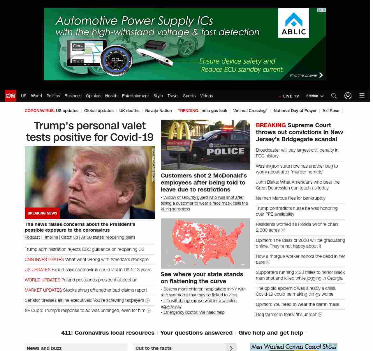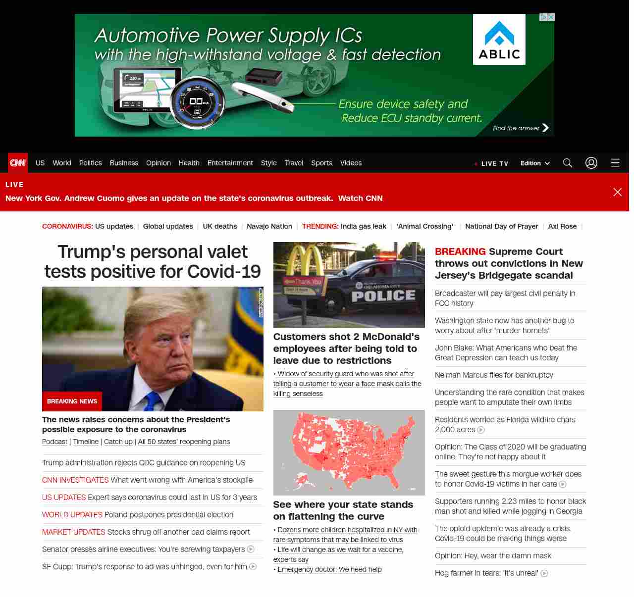 || screaming-banner-text banner-text-size–char-47″ data-analytics=”_list-hierarchical-xs_article_”> One of Trump’s valets tests positive for coronavirus ||” , title: “CNN – Breaking News, Latest News and Videos” , siblings: {“articleList”:[{“uri”:”/2020/05/07/politics/trump-valet-tests-positive-covid-19/index.html”,”headline”:”u003cstrong>The news raises concerns about the President’s possible exposure to the coronavirusu003c/strong>”,”thumbnail”:”//cdn.cnn.com/cnnnext/dam/assets/200506145239-02-trump-0506-small-11.jpg”,”duration”:””,”description”:”u003ca href=”https://www.cnn.com/audio/podcasts/corona-virus” target=”_blank”>Podcastu003c/a> | u003ca href=”https://www.cnn.com/interactive/2020/health/covid19-pandemic-video-timeline/index.html” target=”_blank”>Timelineu003c/a> | u003ca href=”https://www.cnn.com/2020/05/07/world/coronavirus-newsletter-05-07-20-intl/index.html” target=”_blank”>Catch upu003c/a> | u003ca href=”https://www.cnn.com/interactive/2020/us/states-reopen-coronavirus-trnd/” target=”_blank”>All 50 states’ reopening plansu003c/a>”,”layout”:””