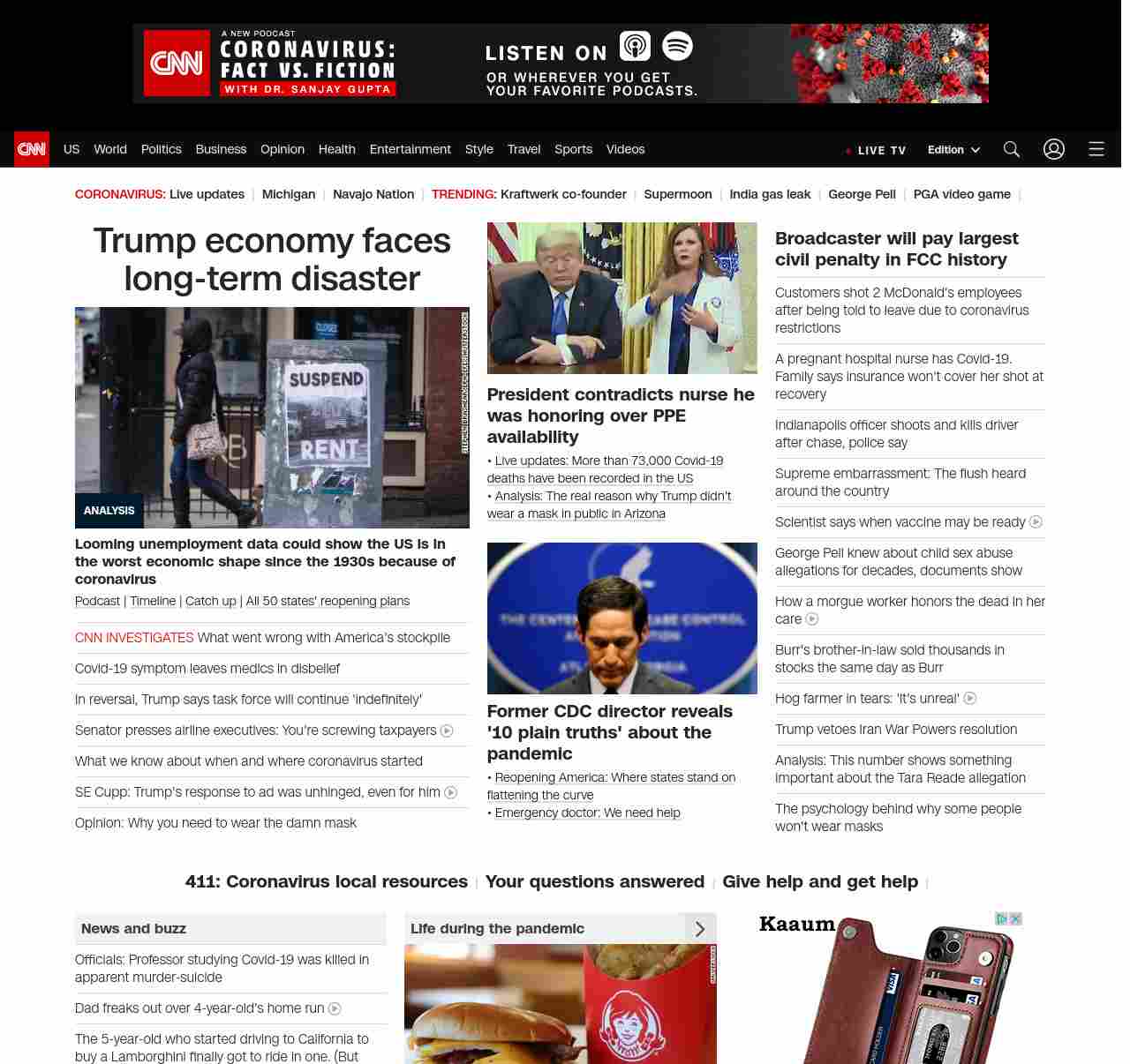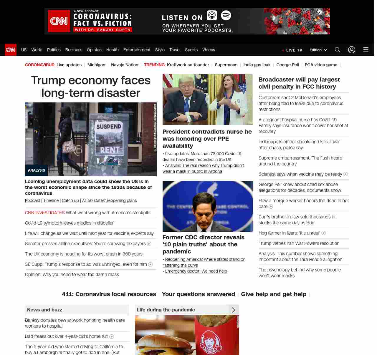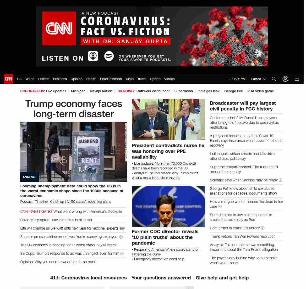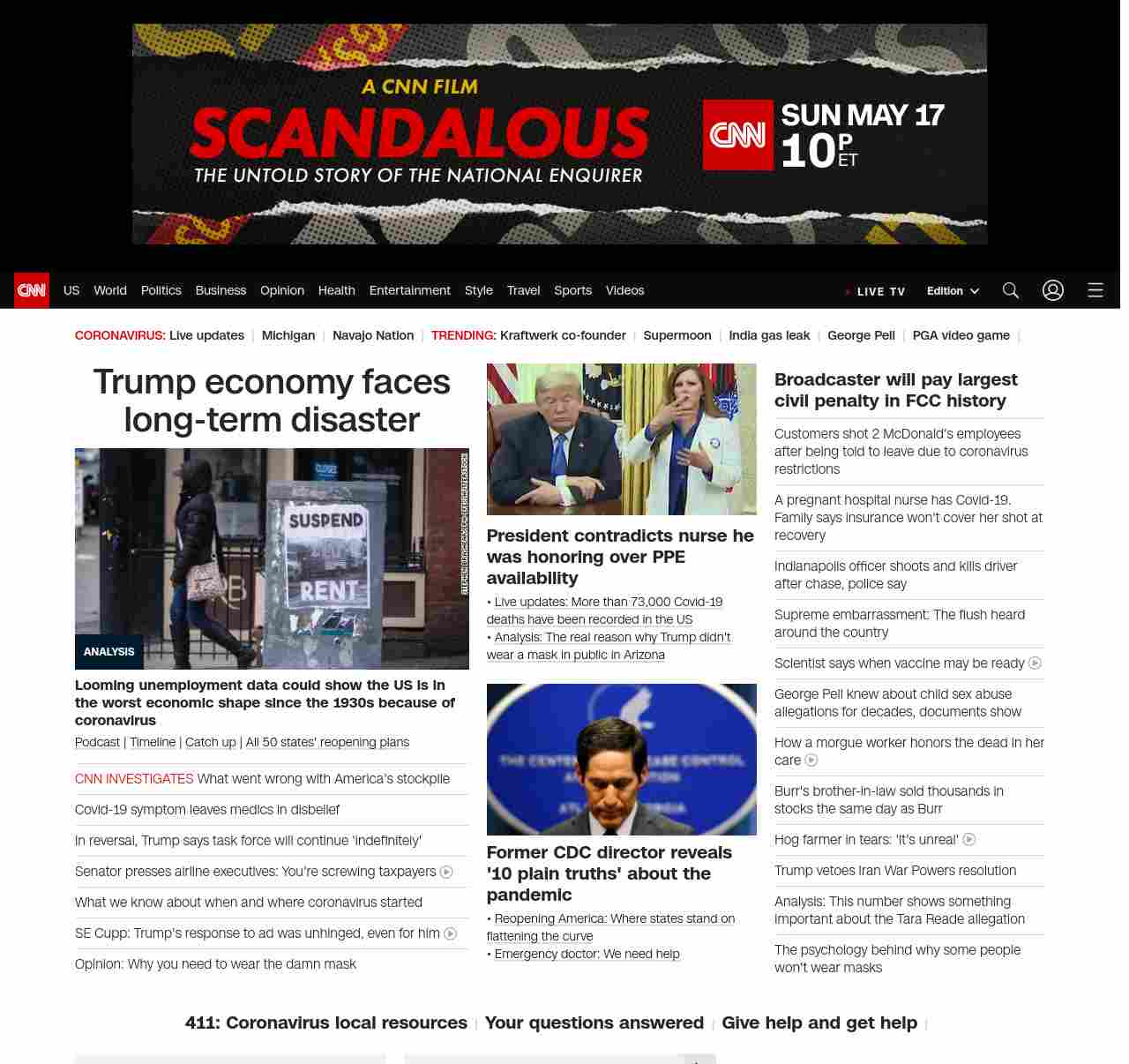 || screaming-banner-text banner-text-size–char-41″ data-analytics=”_list-hierarchical-xs_article_”> Trump economy faces long-term disaster ||” , title: “CNN – Breaking News, Latest News and Videos” , siblings: {“articleList”:[{“uri”:”/2020/05/07/politics/donald-trump-coronavirus-economy/index.html”,”headline”:”u003cstrong>Looming unemployment data could show the US is in the worst economic shape since the 1930s because of coronavirusu003c/strong>”,”thumbnail”:”//cdn.cnn.com/cnnnext/dam/assets/200506205742-07-april-jobs-report-2020-restricted-small-11.jpg”,”duration”:””,”description”:”u003ca href=”https://www.cnn.com/audio/podcasts/corona-virus” target=”_blank”>Podcastu003c/a> | u003ca href=”https://www.cnn.com/interactive/2020/health/covid19-pandemic-video-timeline/index.html” target=”_blank”>Timelineu003c/a> | u003ca href=”https://www.cnn.com/2020/05/06/world/coronavirus-newsletter-05-06-20-intl/index.html” target=”_blank”>Catch upu003c/a> | u003ca href=”https://www.cnn.com/interactive/2020/us/states-reopen-coronavirus-trnd/” target=”_blank”>All 50 states’ reopening plansu003c/a>”,”layout”:””